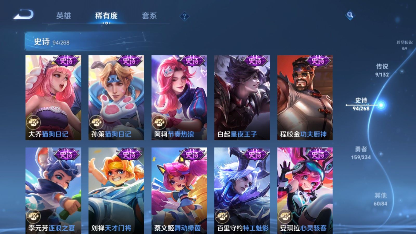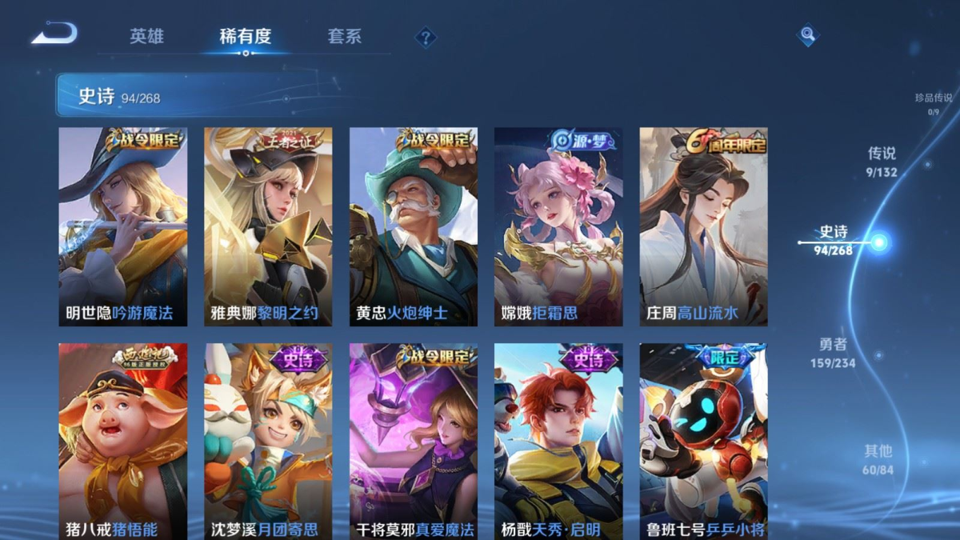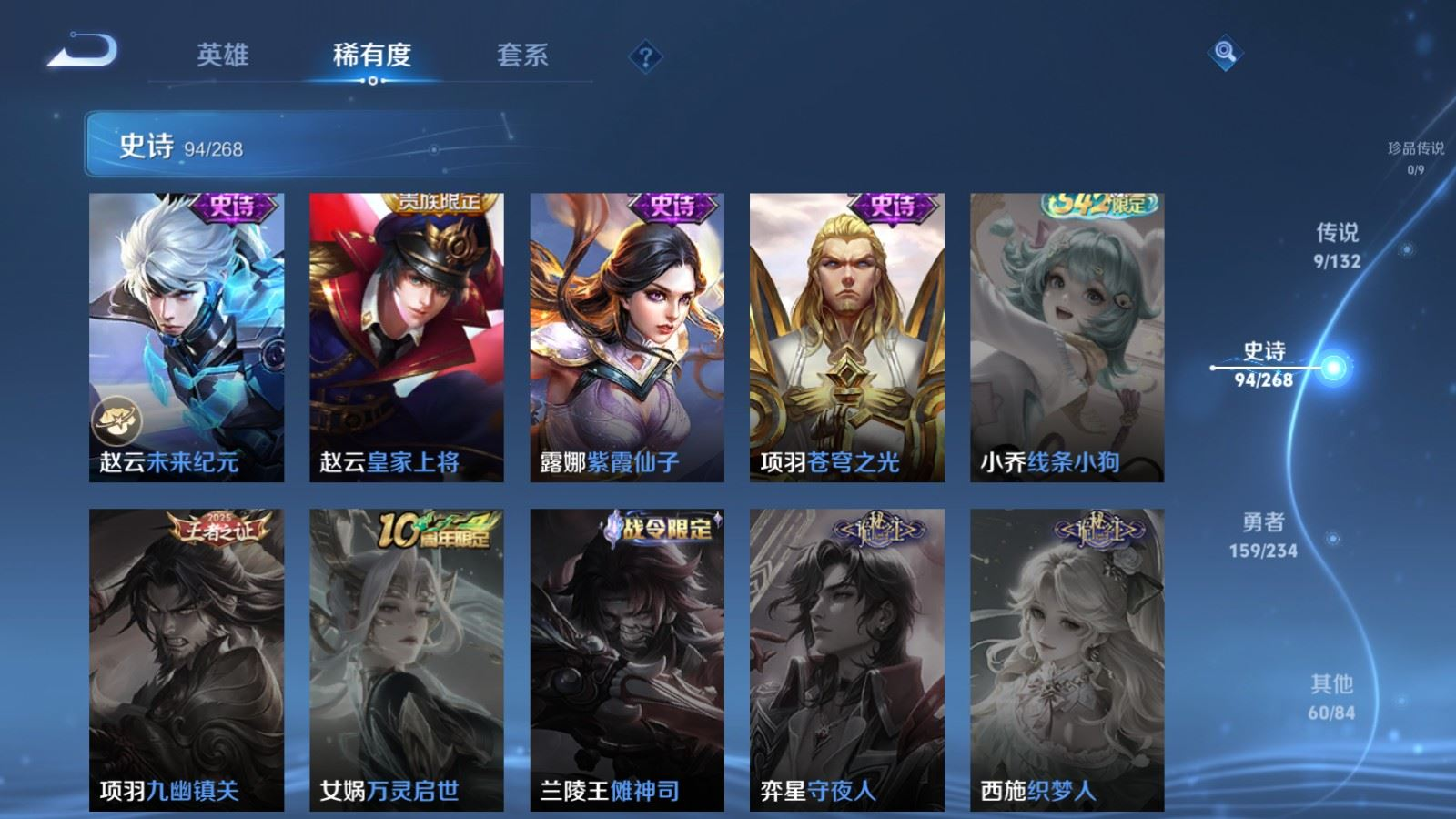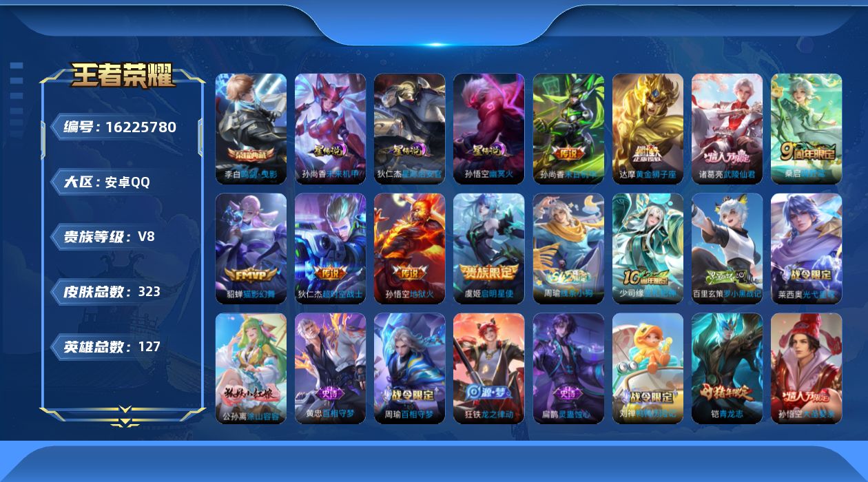 贵族等级:v8皮肤数:323传说品质9 情人节限定2 荣耀典藏1 生肖限定2 英雄数:127