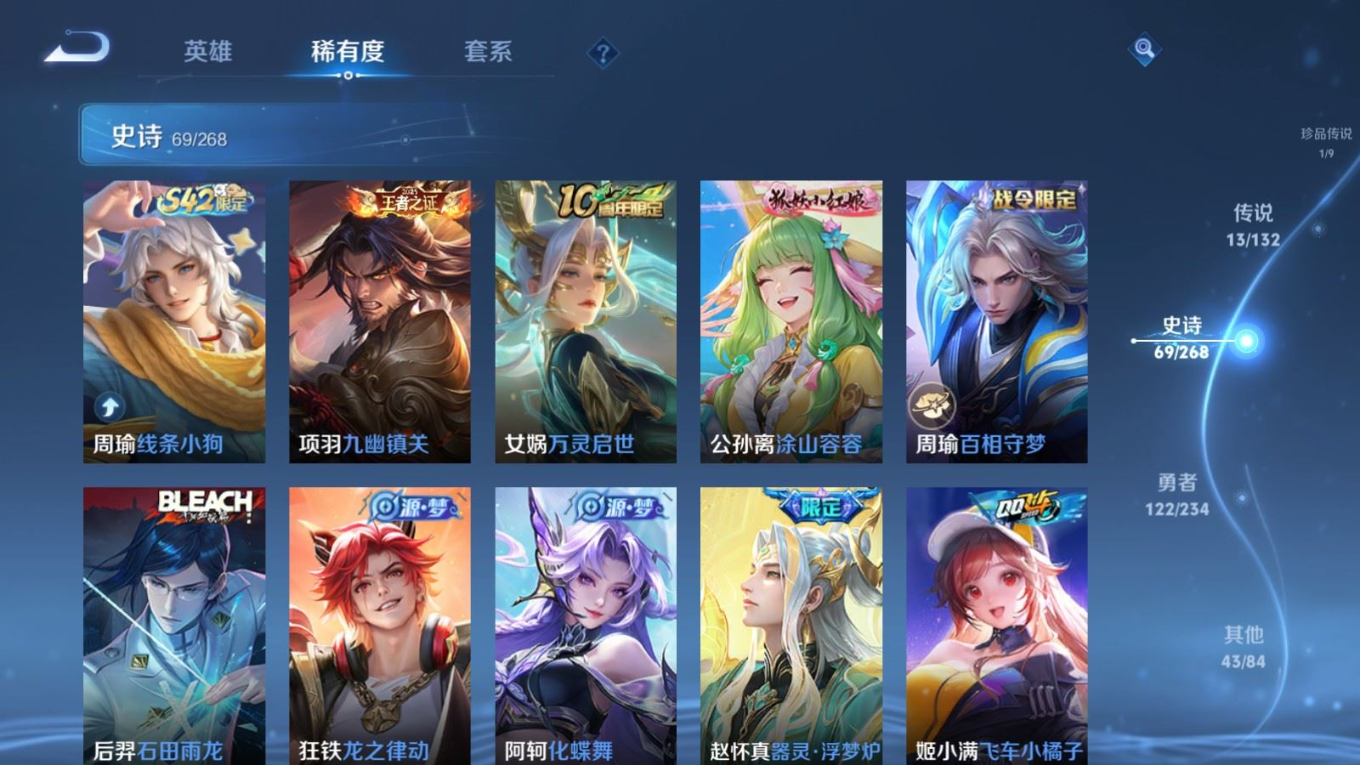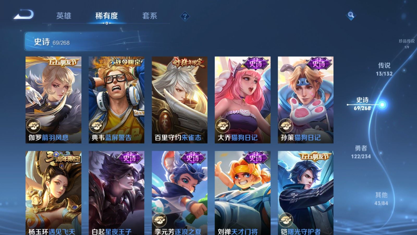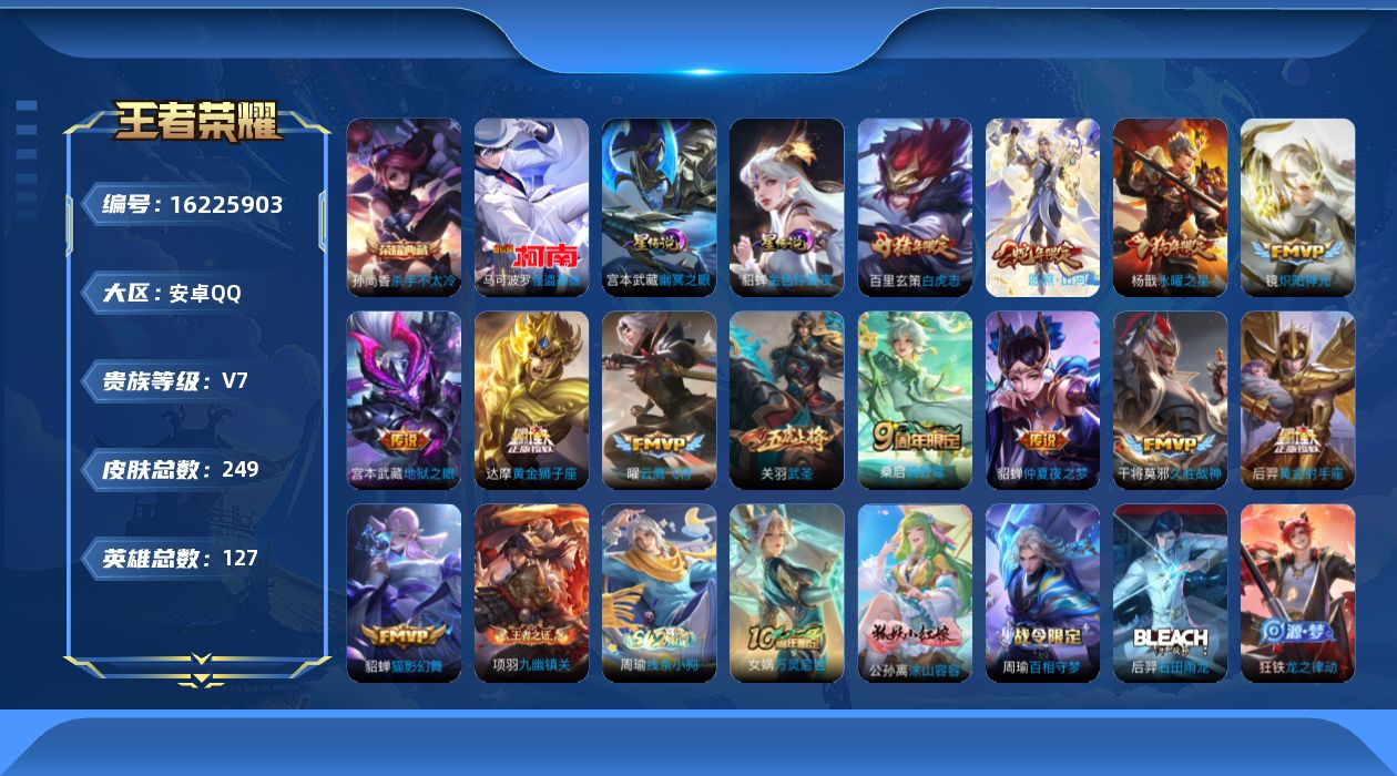 贵族等级:v7皮肤数:249传说品质13 生肖限定5 荣耀典藏1 珍品传说1 英雄数:127