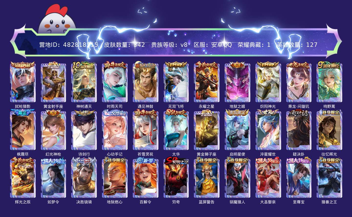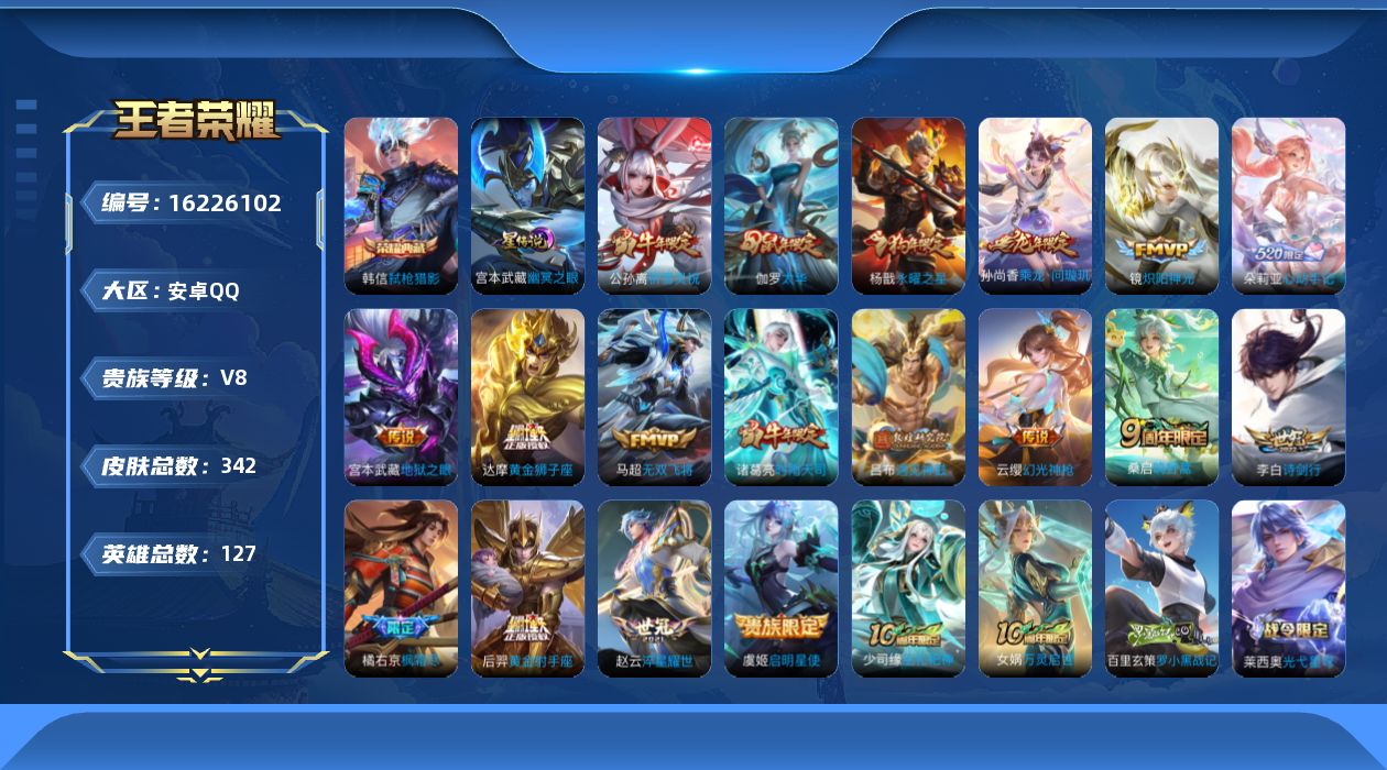 贵族等级:v8皮肤数:342生肖限定9 传说品质19 情人节限定3 荣耀典藏1 英雄数:127