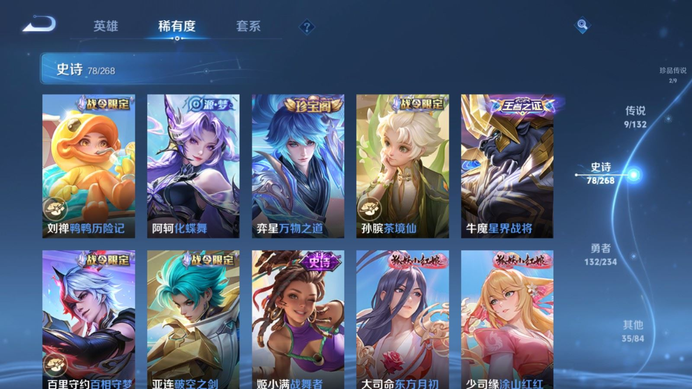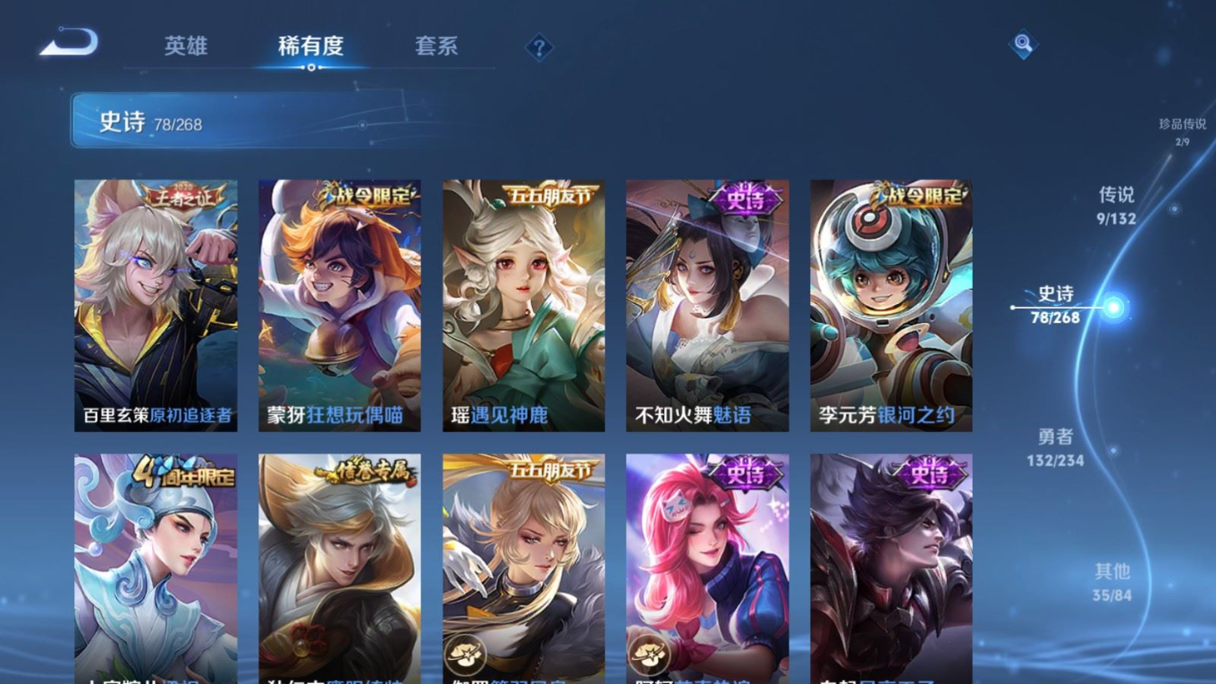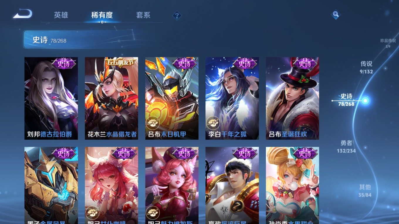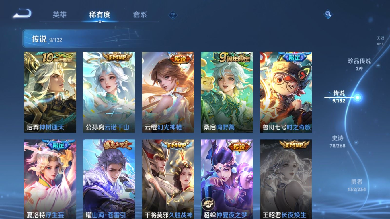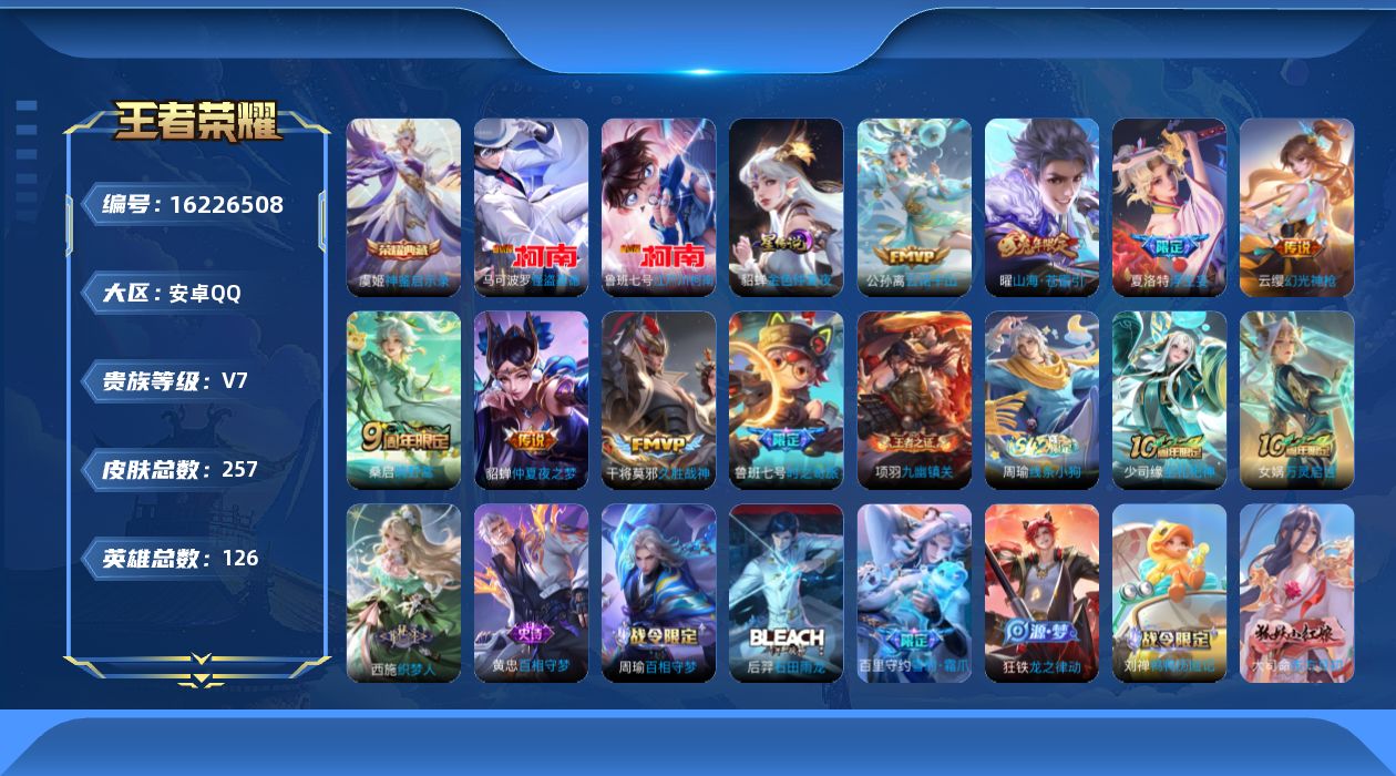 贵族等级:v7皮肤数:257传说品质9 生肖限定2 珍品传说2 荣耀典藏1 英雄数:126