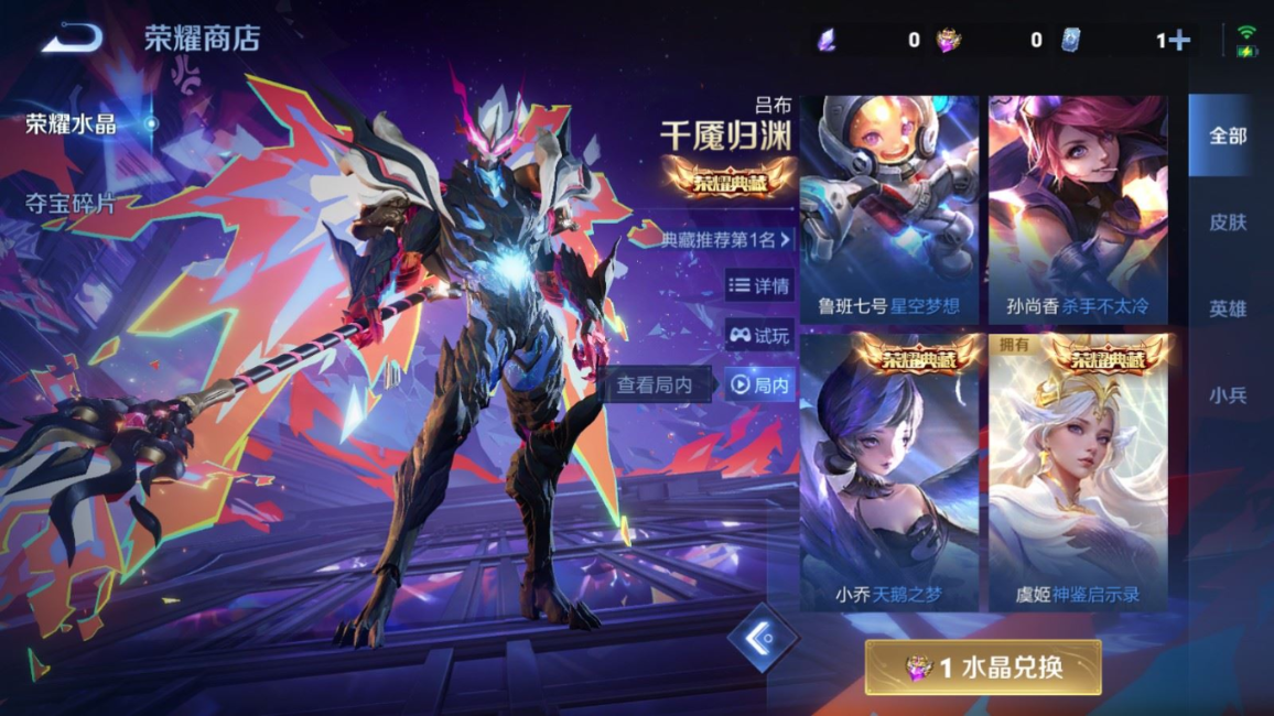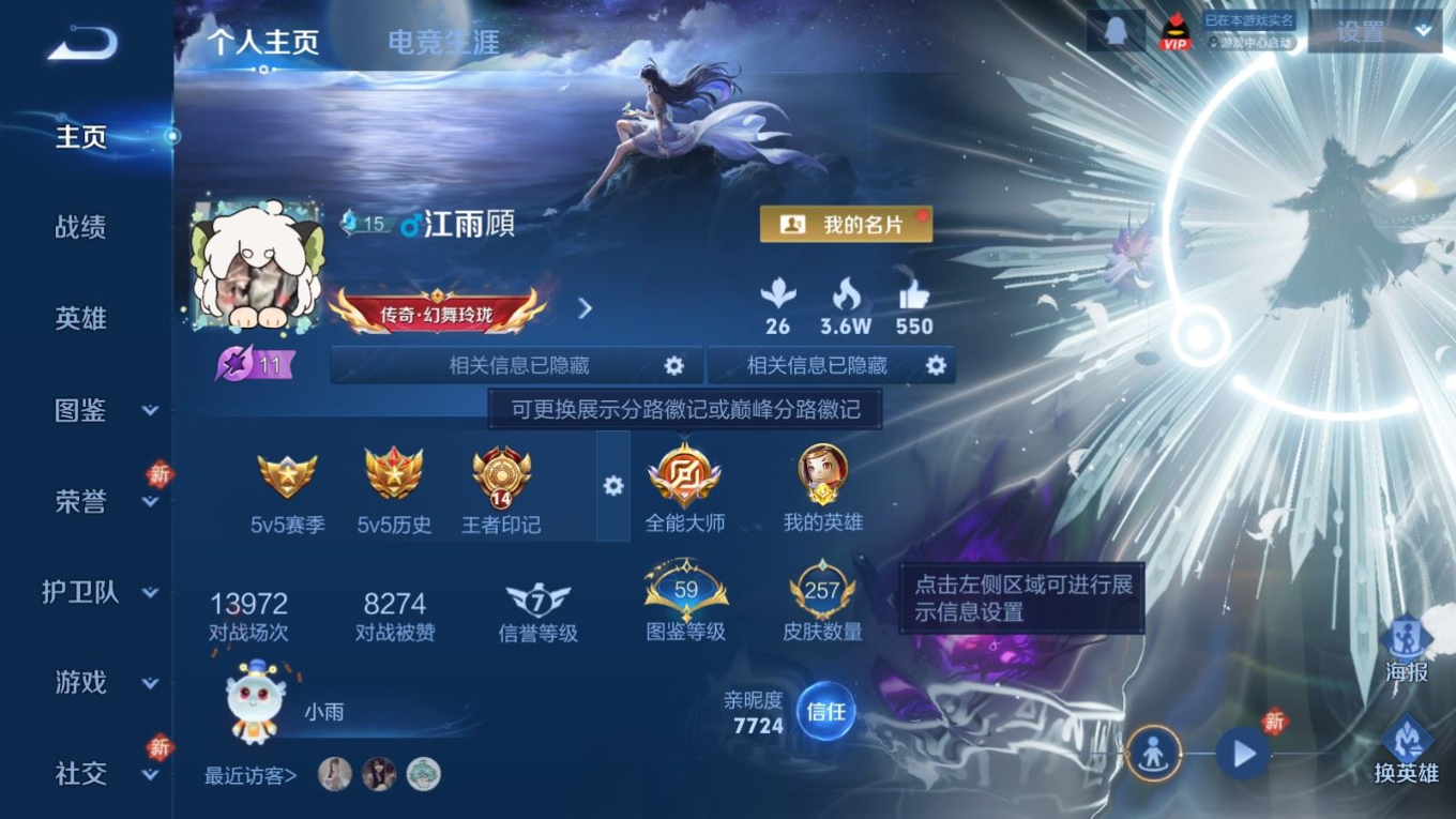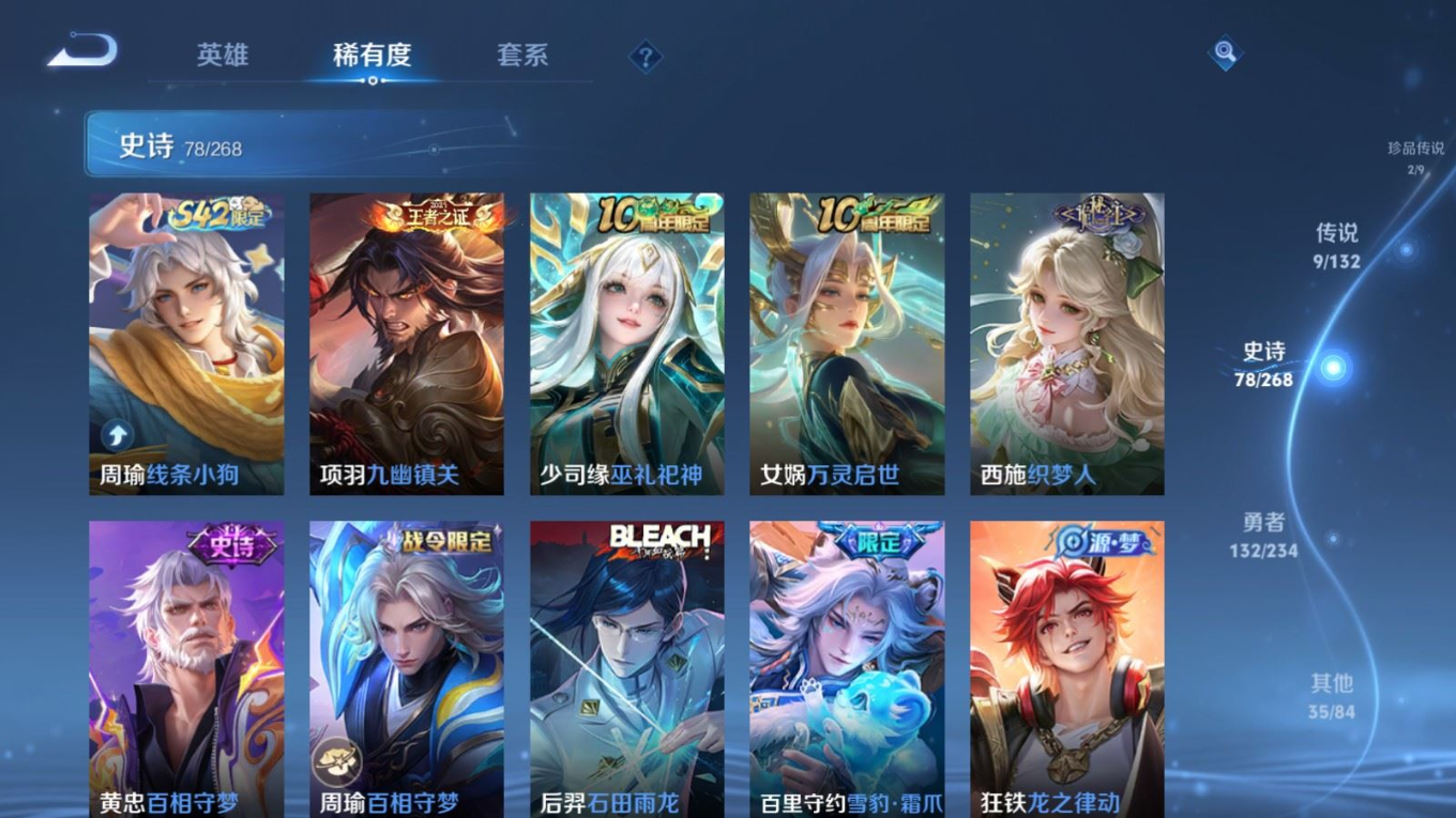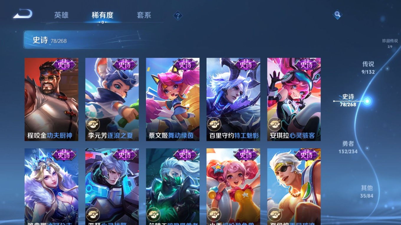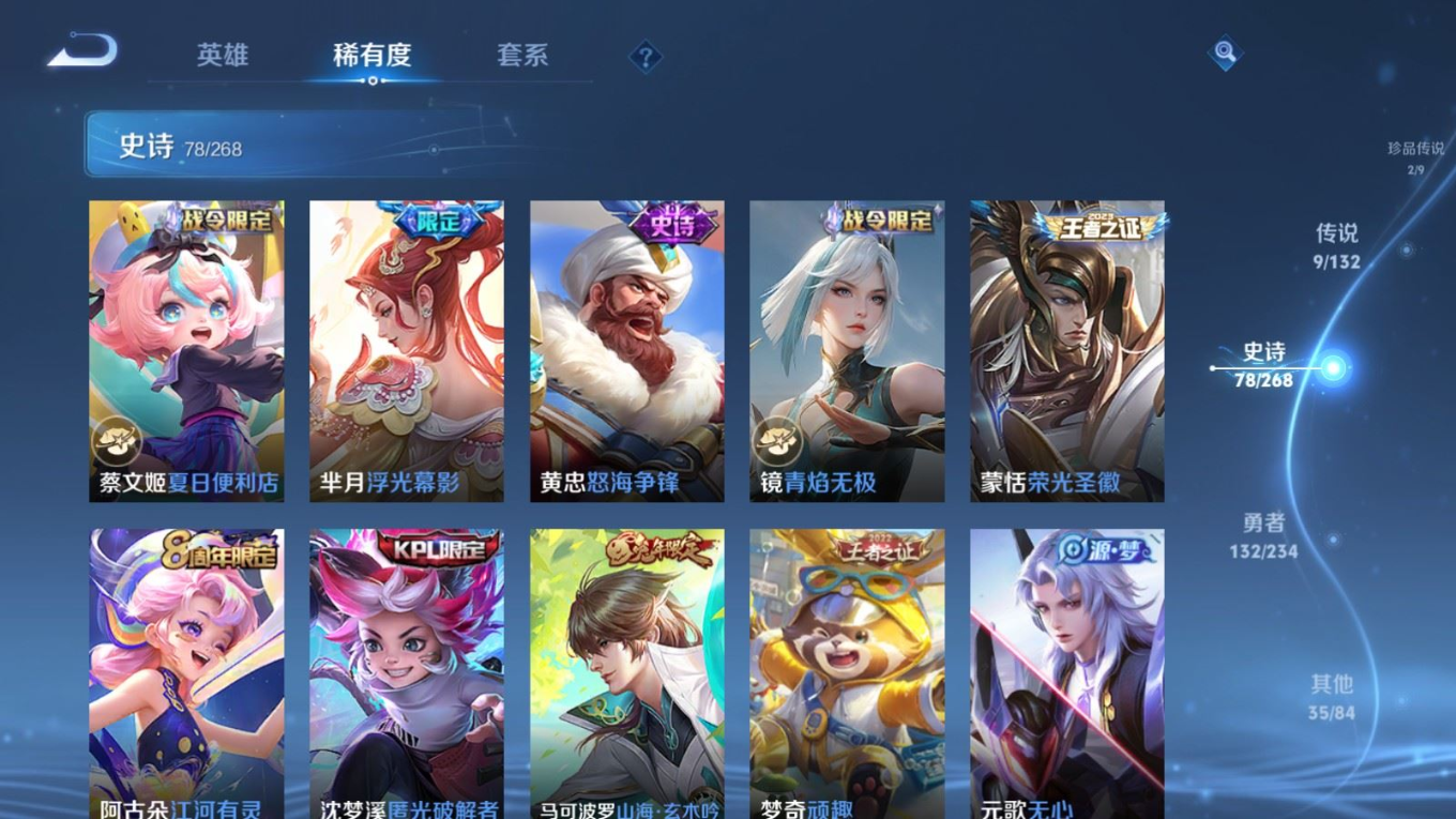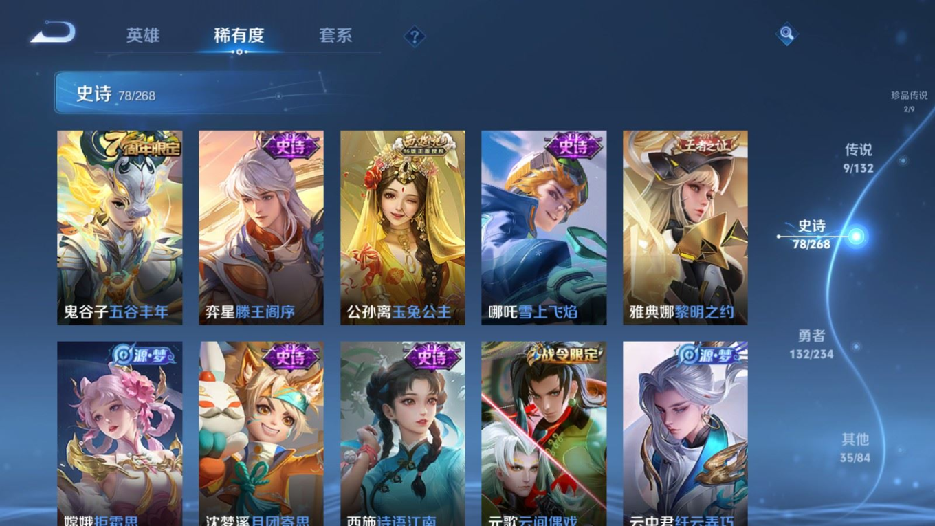 贵族等级:v7皮肤数:257传说品质9 生肖限定2 珍品传说2 荣耀典藏1 英雄数:126