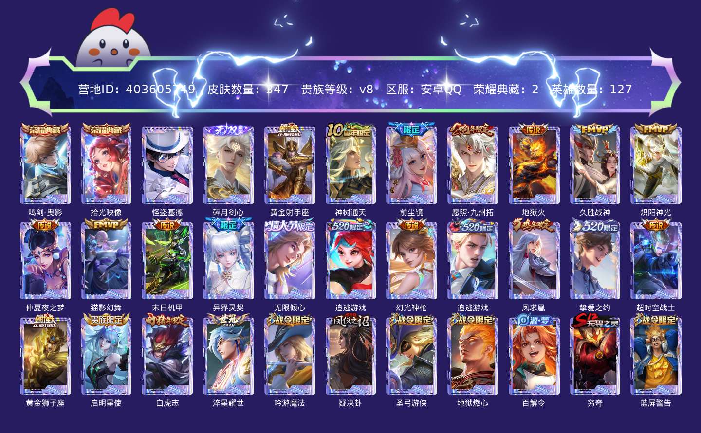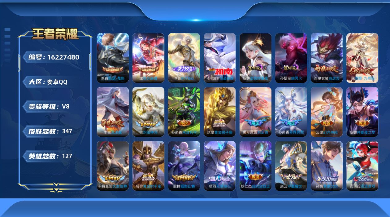 贵族等级:v8皮肤数:347传说品质22 生肖限定7 情人节限定2 珍品传说1 荣耀典藏2 无双1 英雄数:127