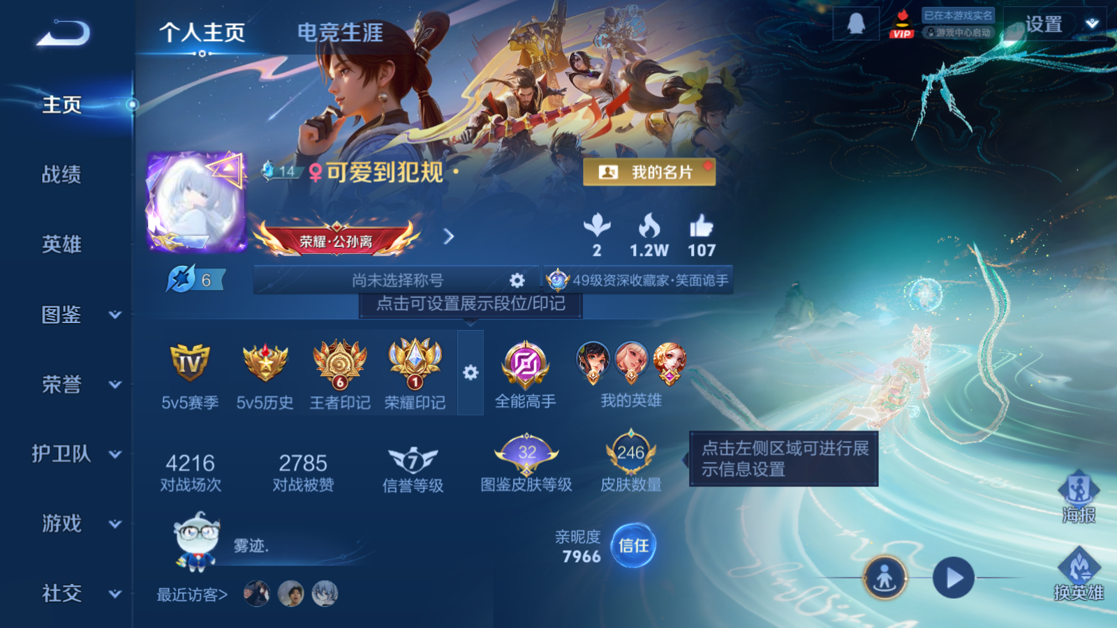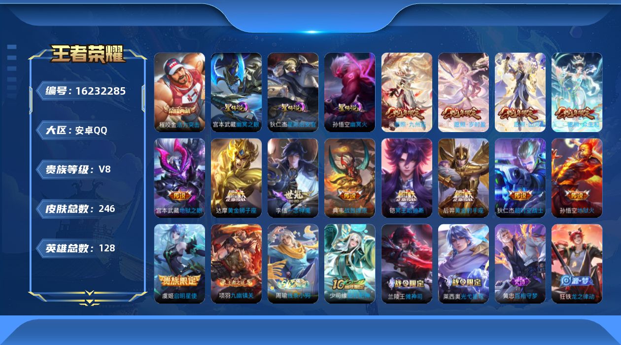 贵族等级:v8皮肤数:246传说品质13 生肖限定4 情人节限定1 荣耀典藏1 英雄数:128