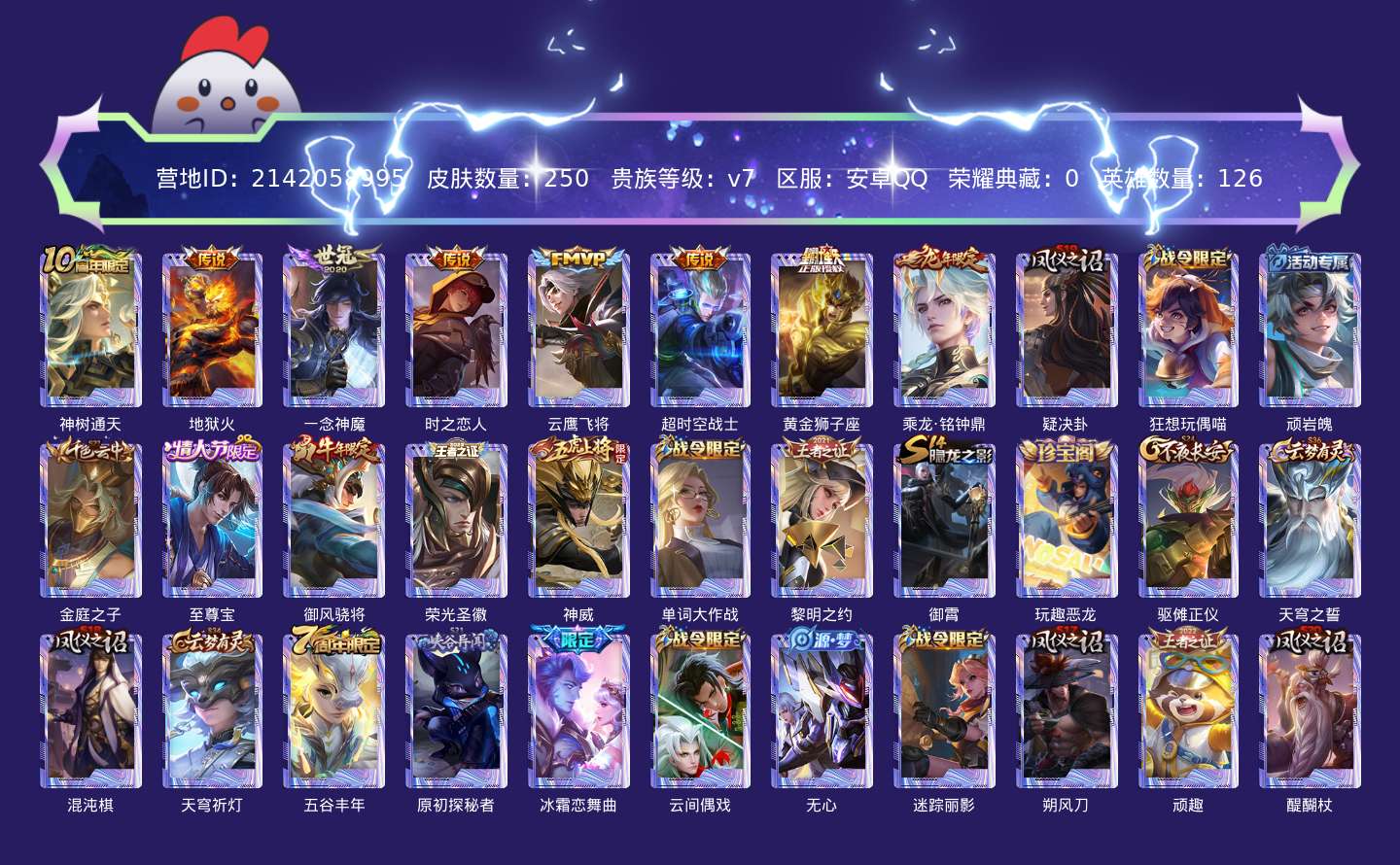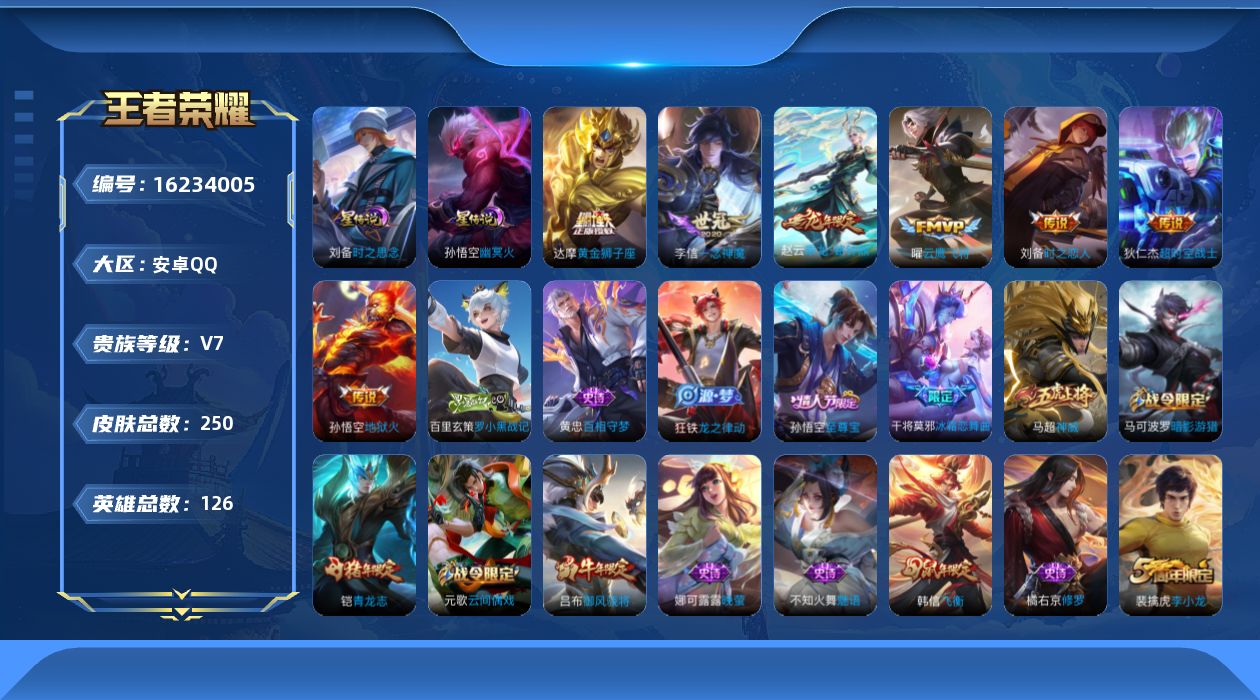 贵族等级:v7皮肤数:250传说品质8 情人节限定1 生肖限定4 英雄数:126
