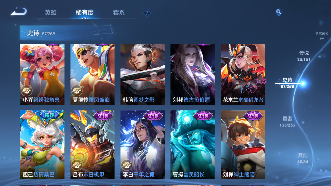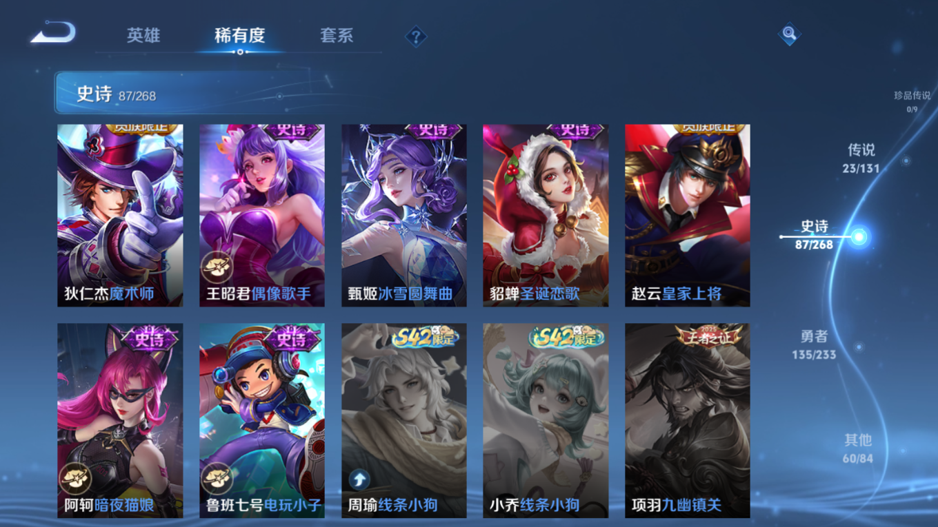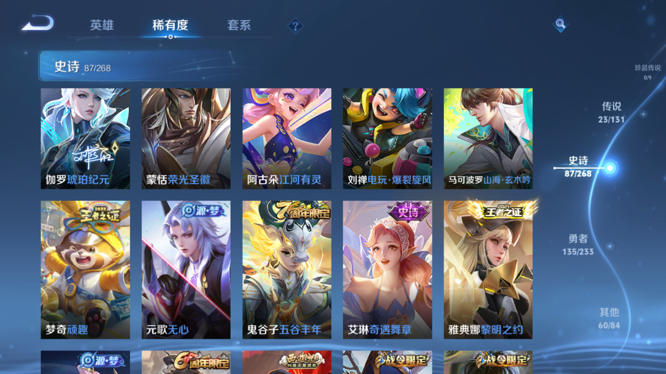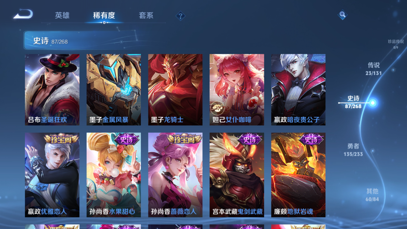 贵族等级:v8皮肤数:306传说品质23 生肖限定10 情人节限定2 荣耀典藏1 英雄数:127