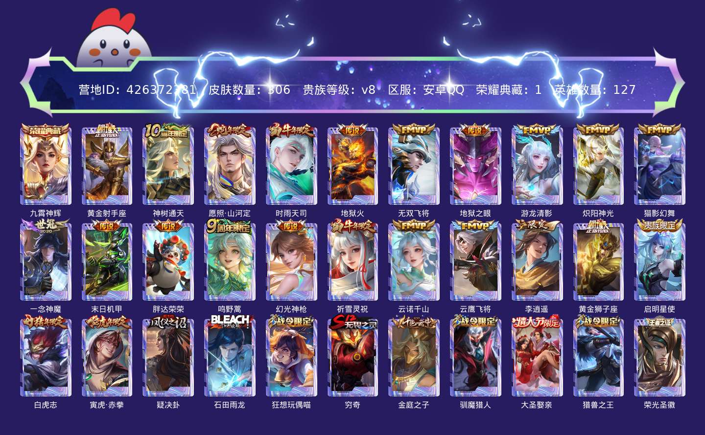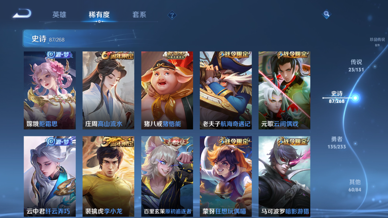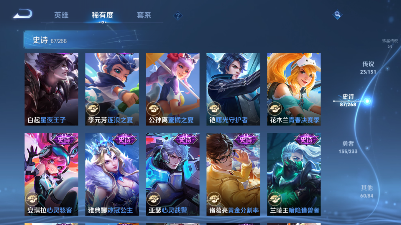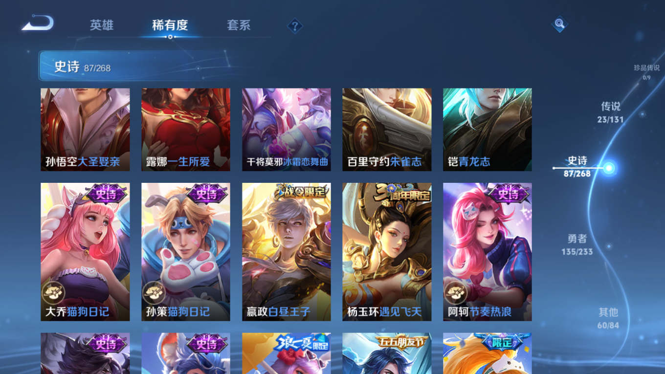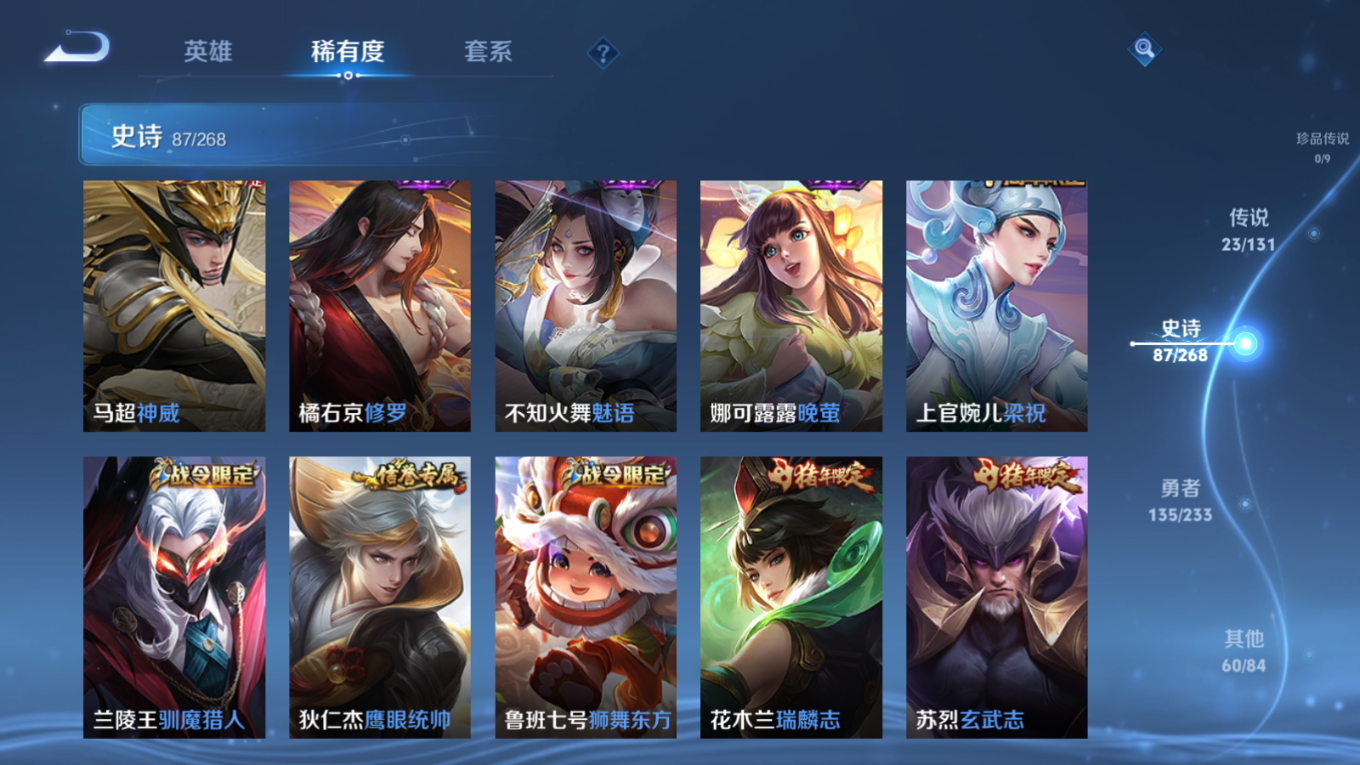 贵族等级:v8皮肤数:306传说品质23 生肖限定10 情人节限定2 荣耀典藏1 英雄数:127