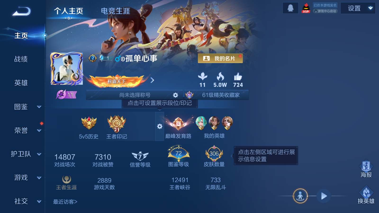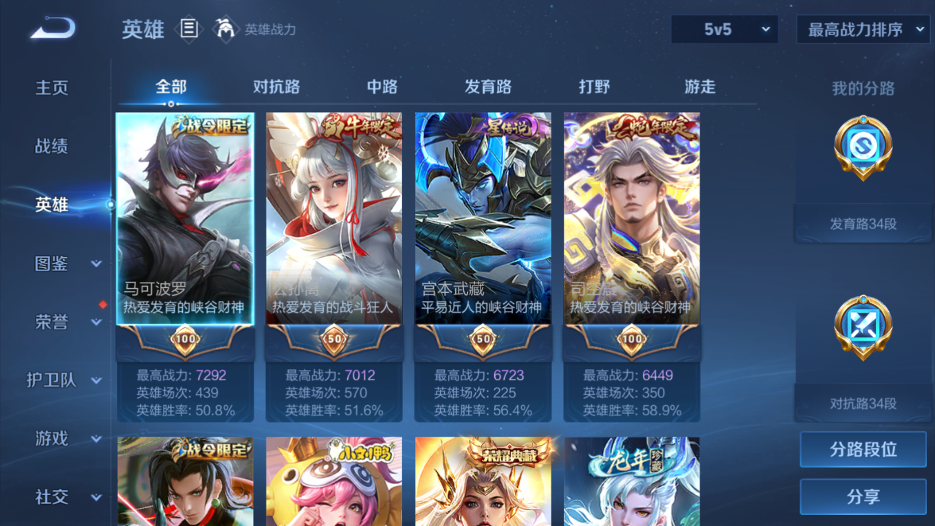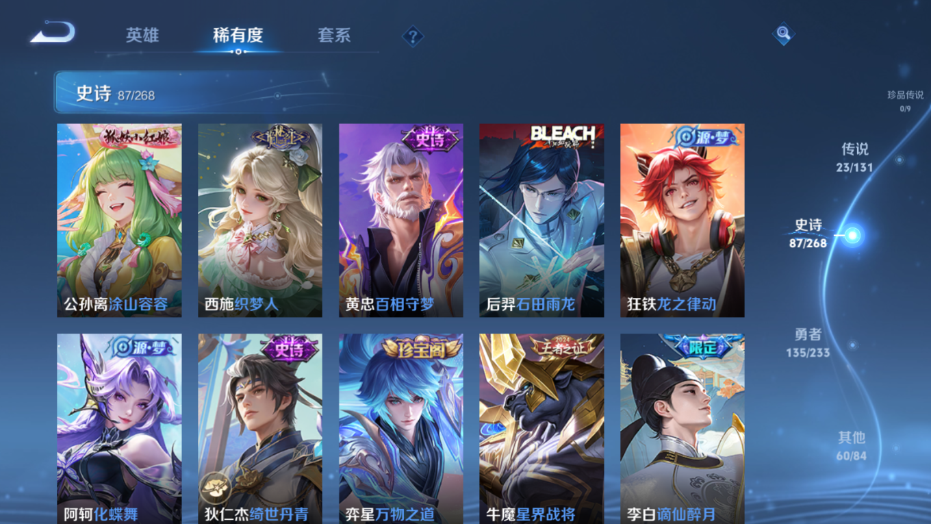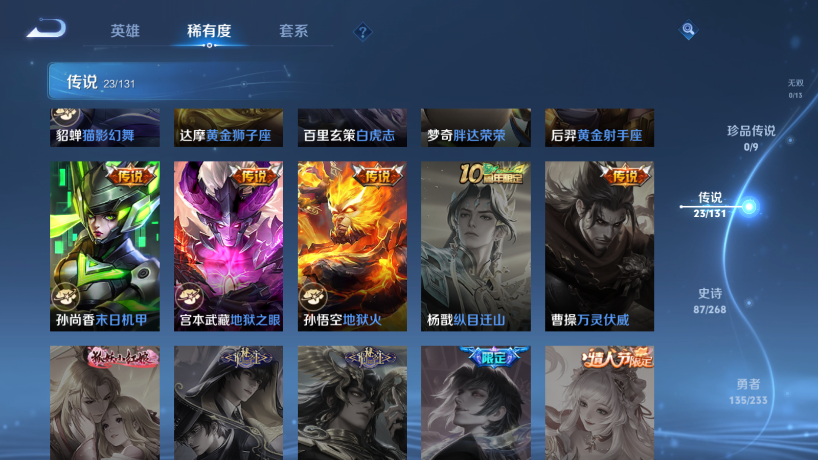 贵族等级:v8皮肤数:306传说品质23 生肖限定10 情人节限定2 荣耀典藏1 英雄数:127