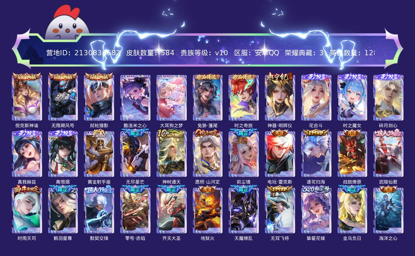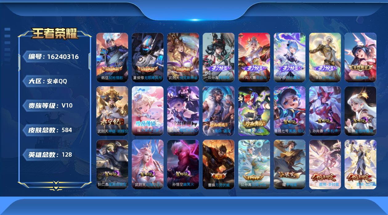 贵族等级:v10皮肤数:584生肖限定28 传说品质87 情人节限定12 荣耀典藏3 无双6 珍品传说4 英雄数:128