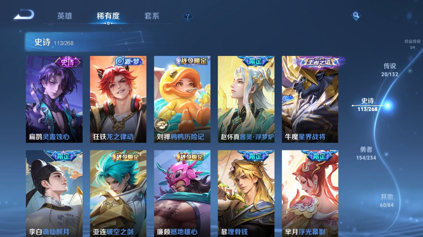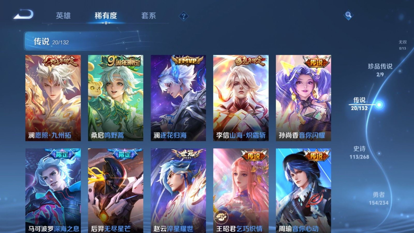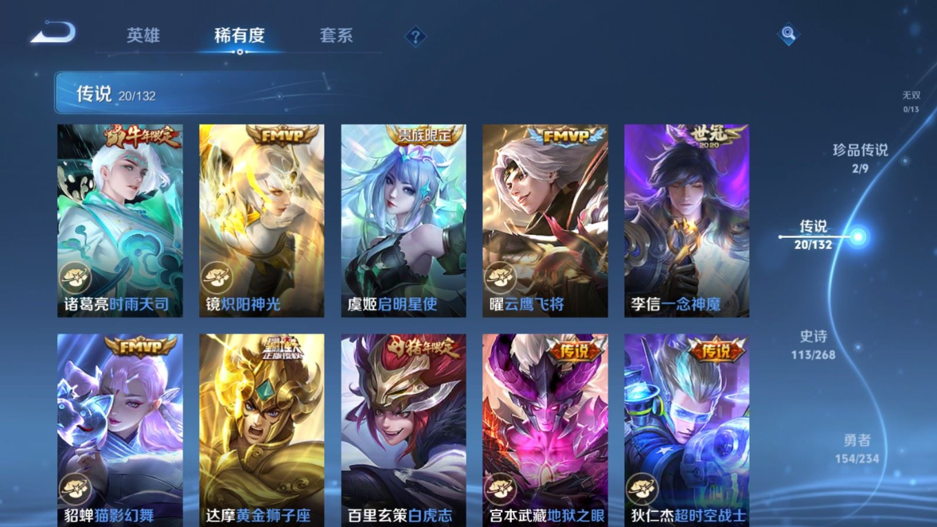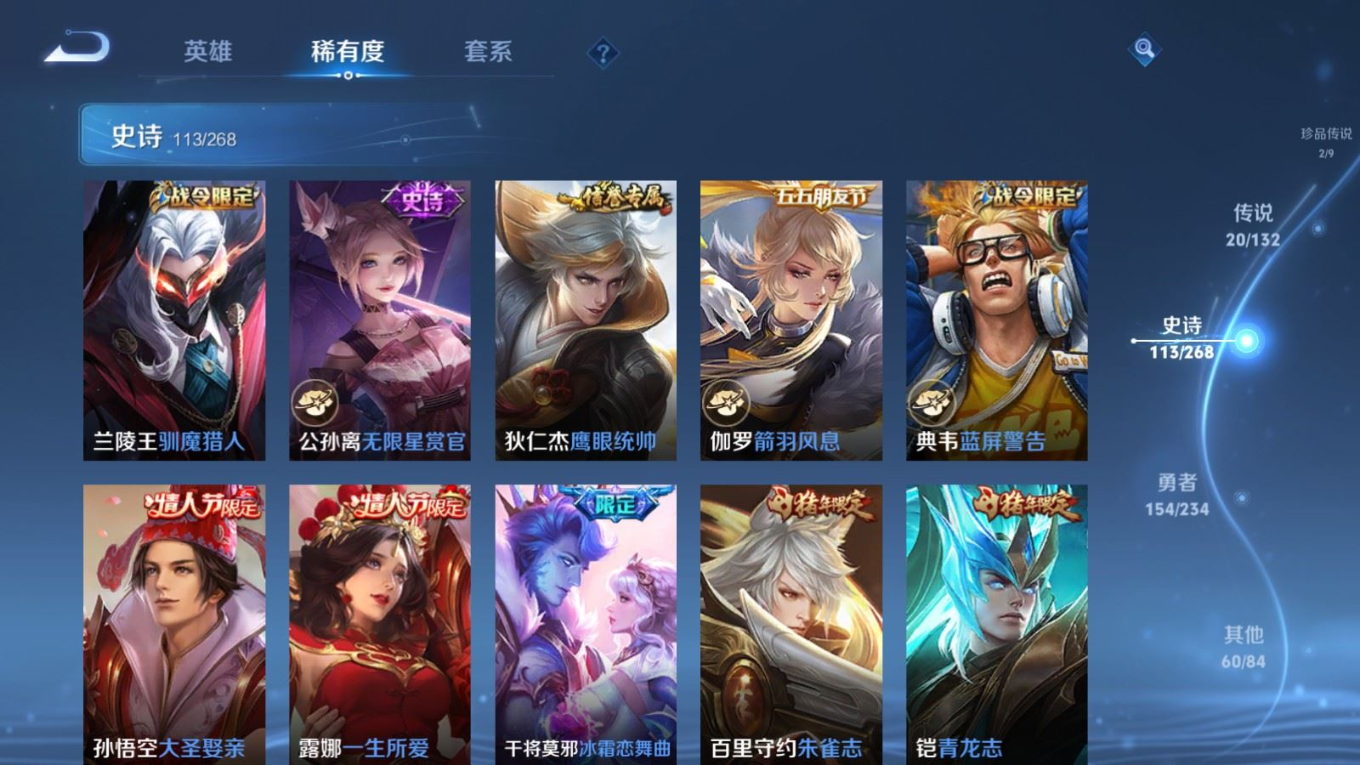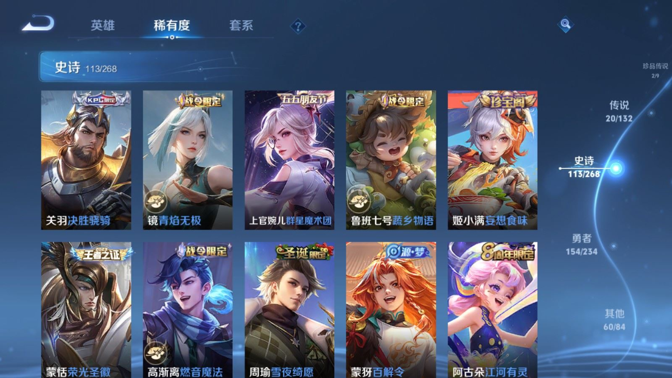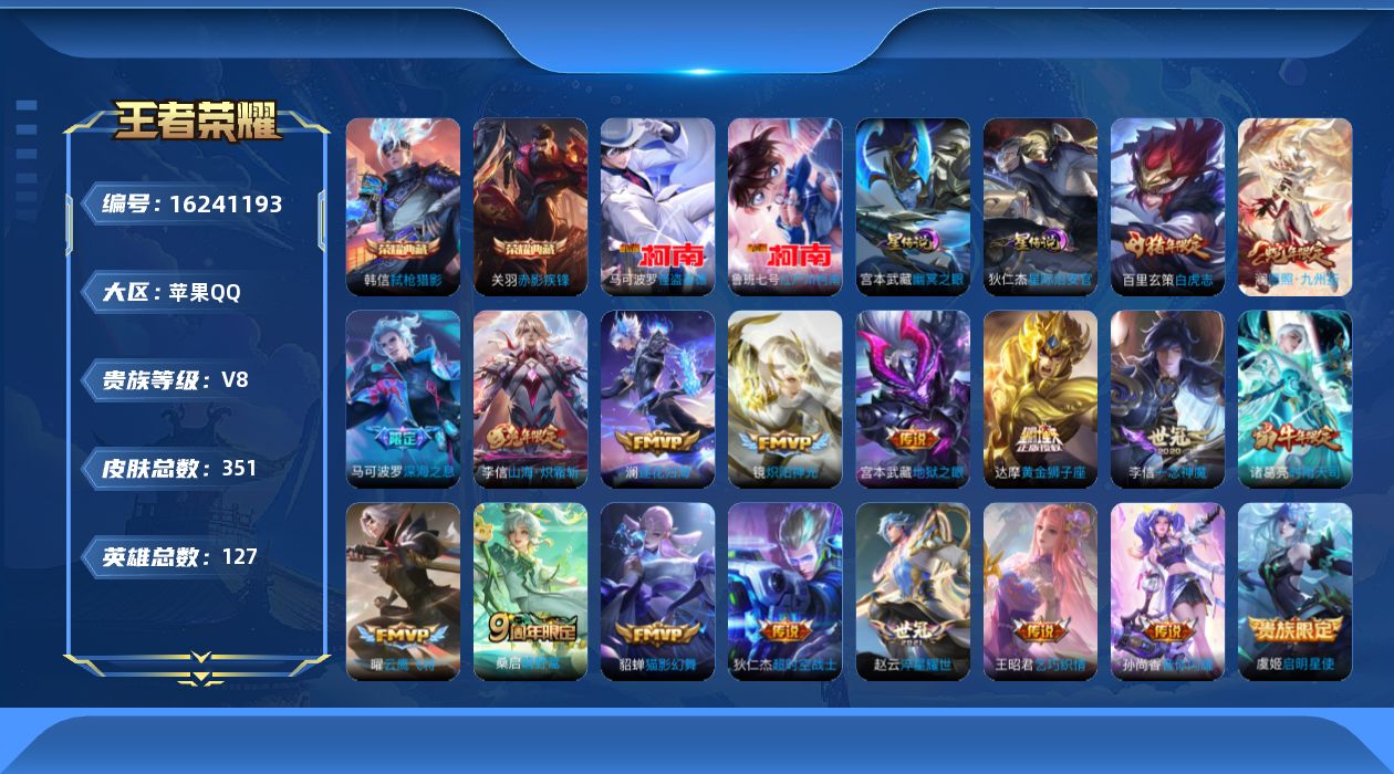贵族等级:v8皮肤数:351传说品质20 荣耀典藏2 生肖限定6 情人节限定3 珍品传说2 英雄数:127
