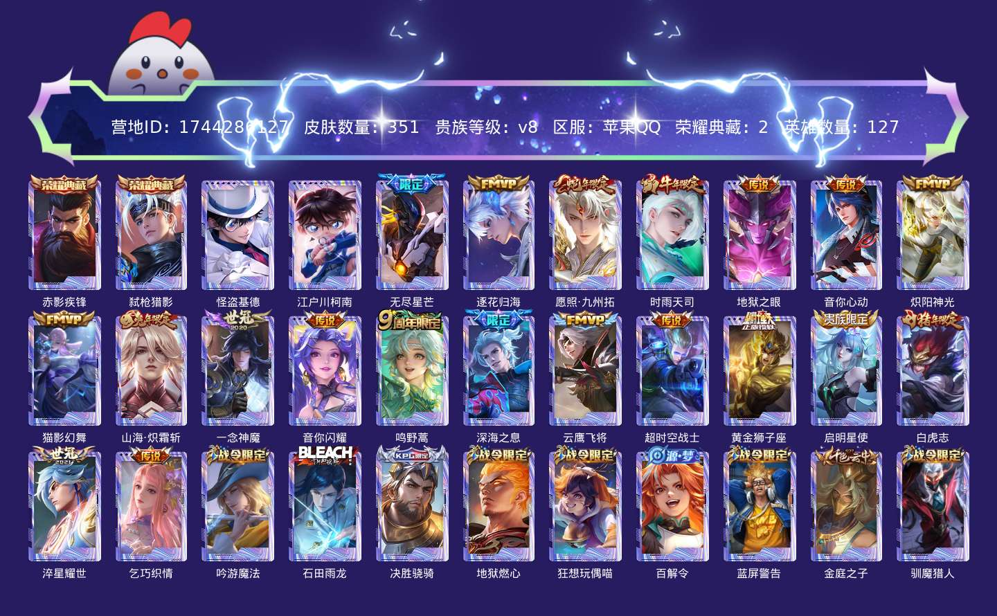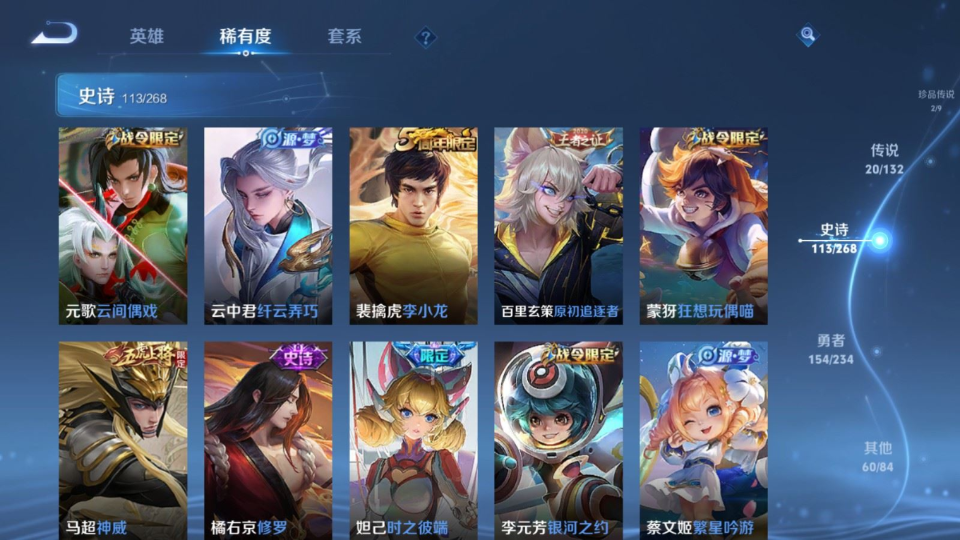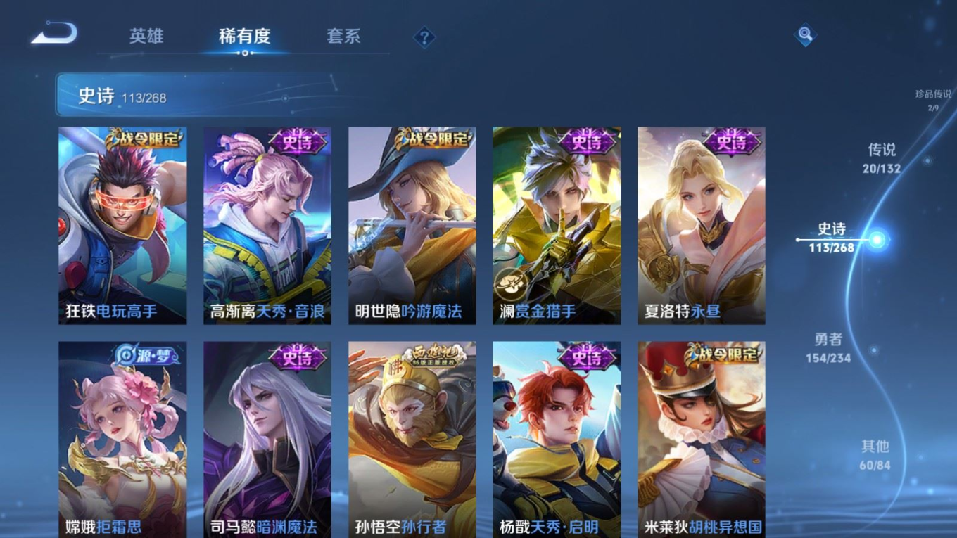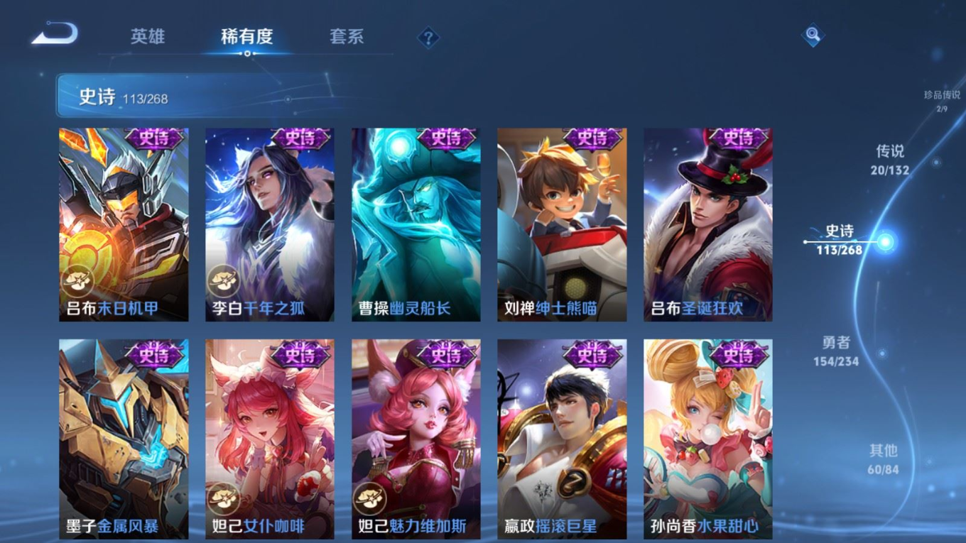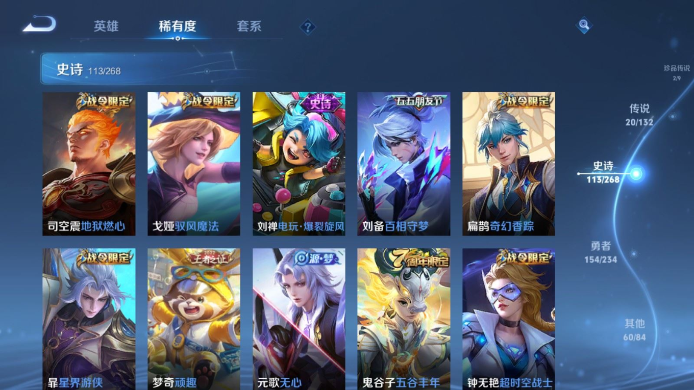 贵族等级:v8皮肤数:351传说品质20 荣耀典藏2 生肖限定6 情人节限定3 珍品传说2 英雄数:127