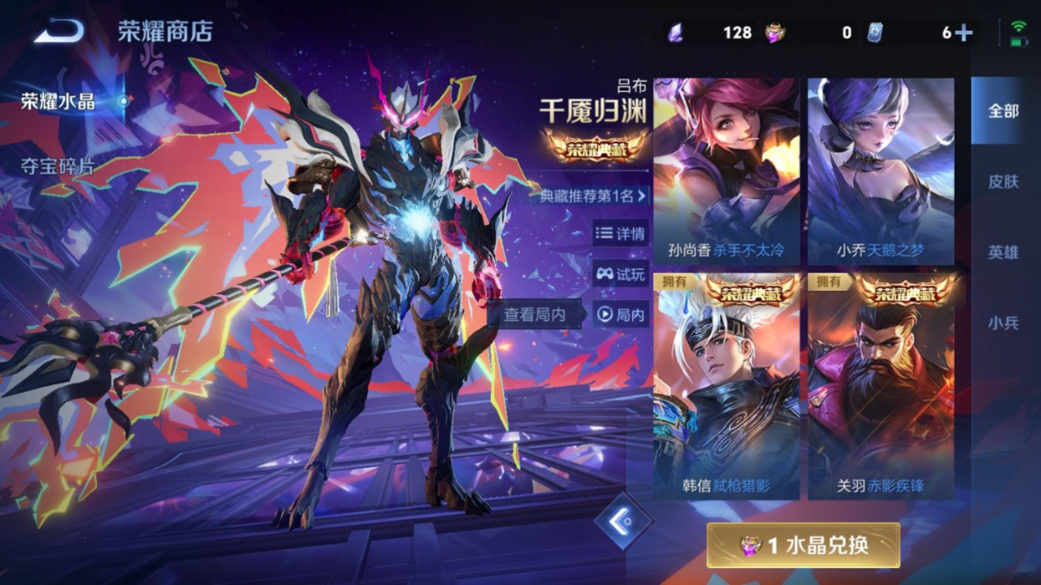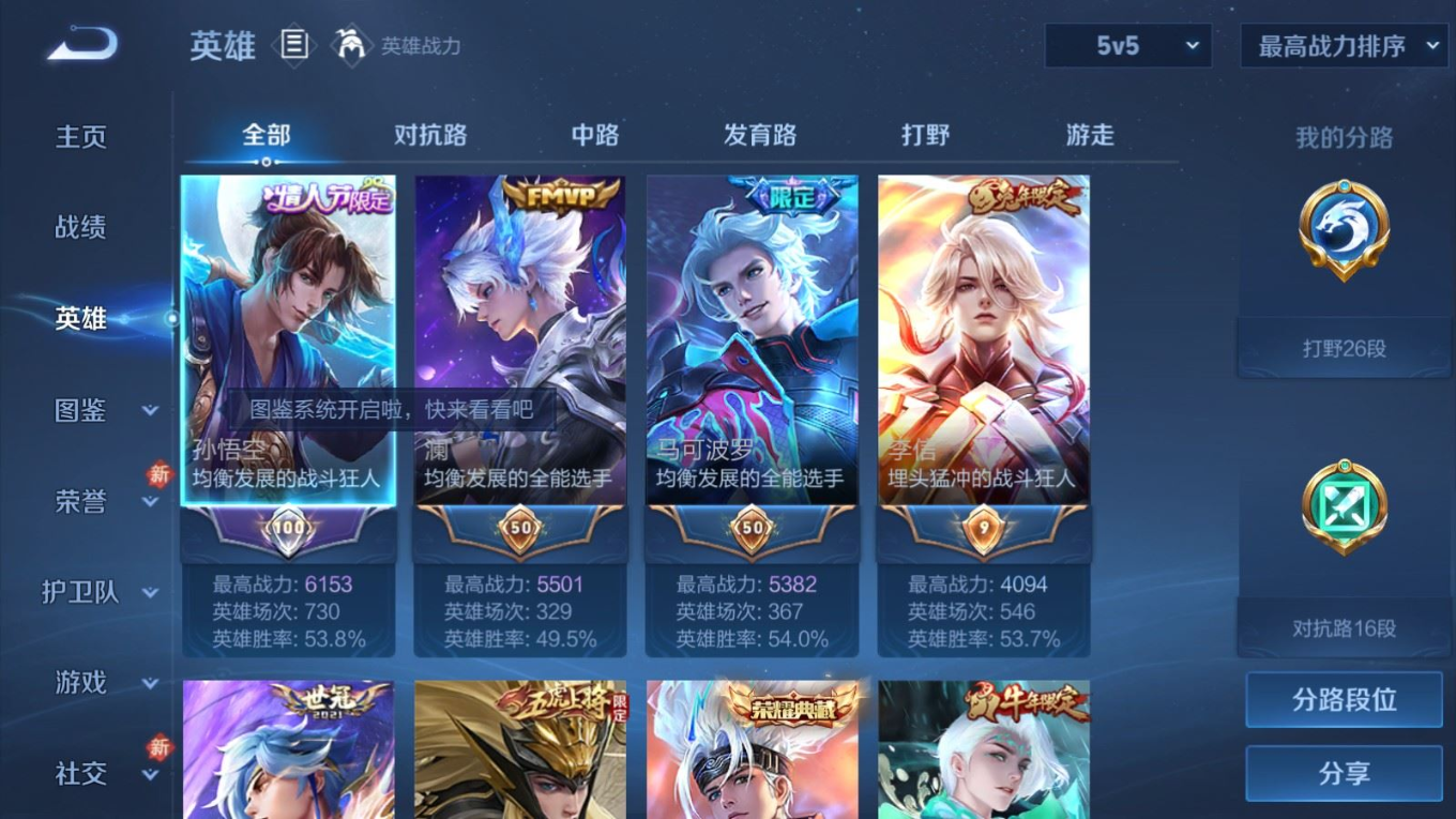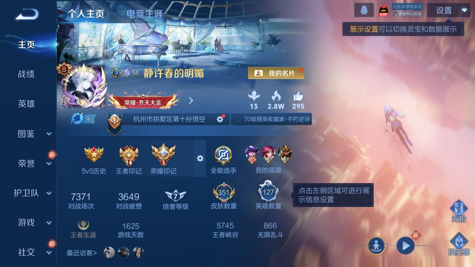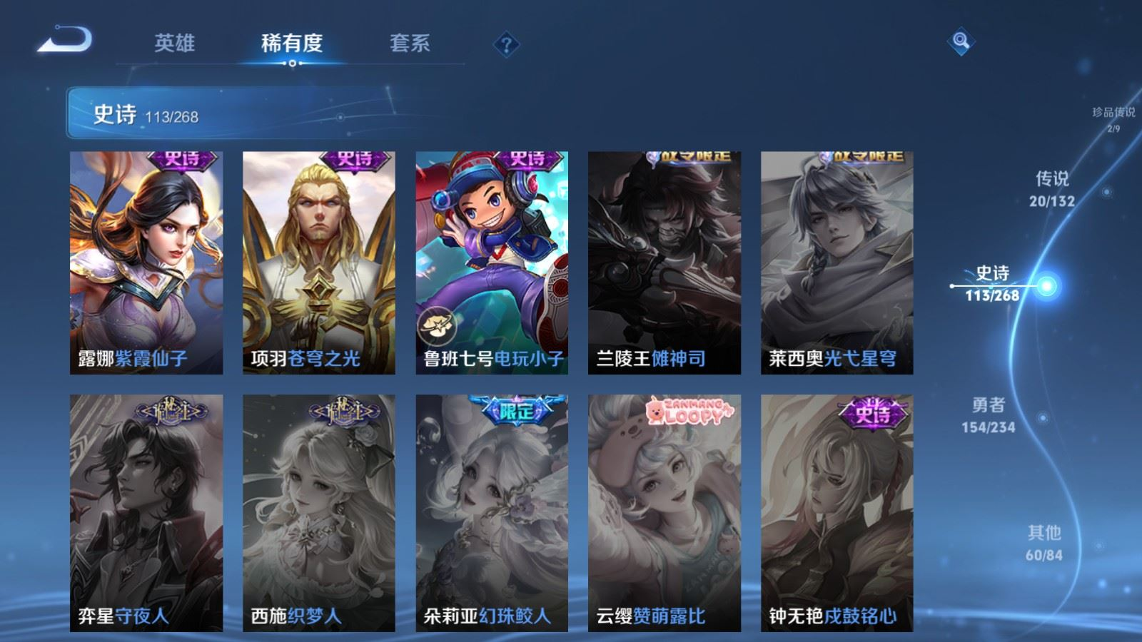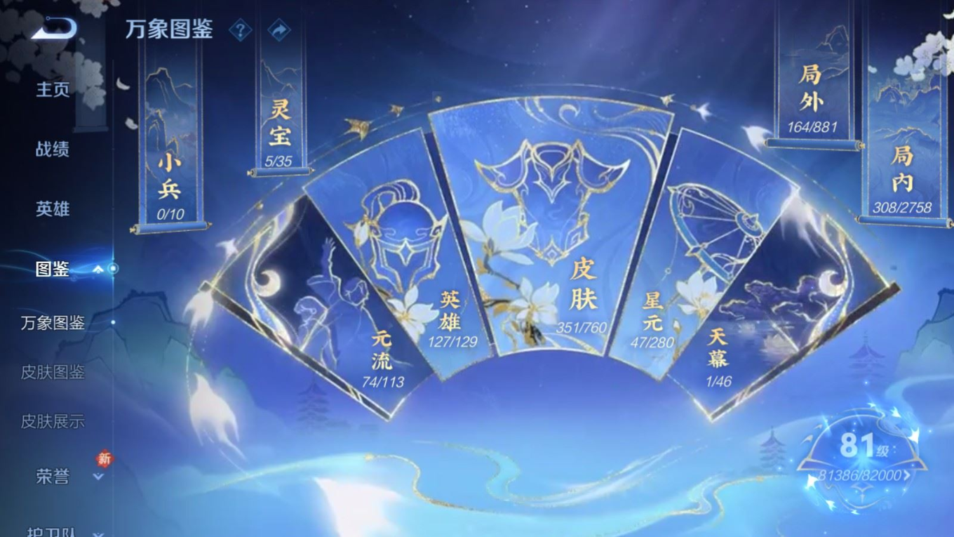 贵族等级:v8皮肤数:351传说品质20 荣耀典藏2 生肖限定6 情人节限定3 珍品传说2 英雄数:127