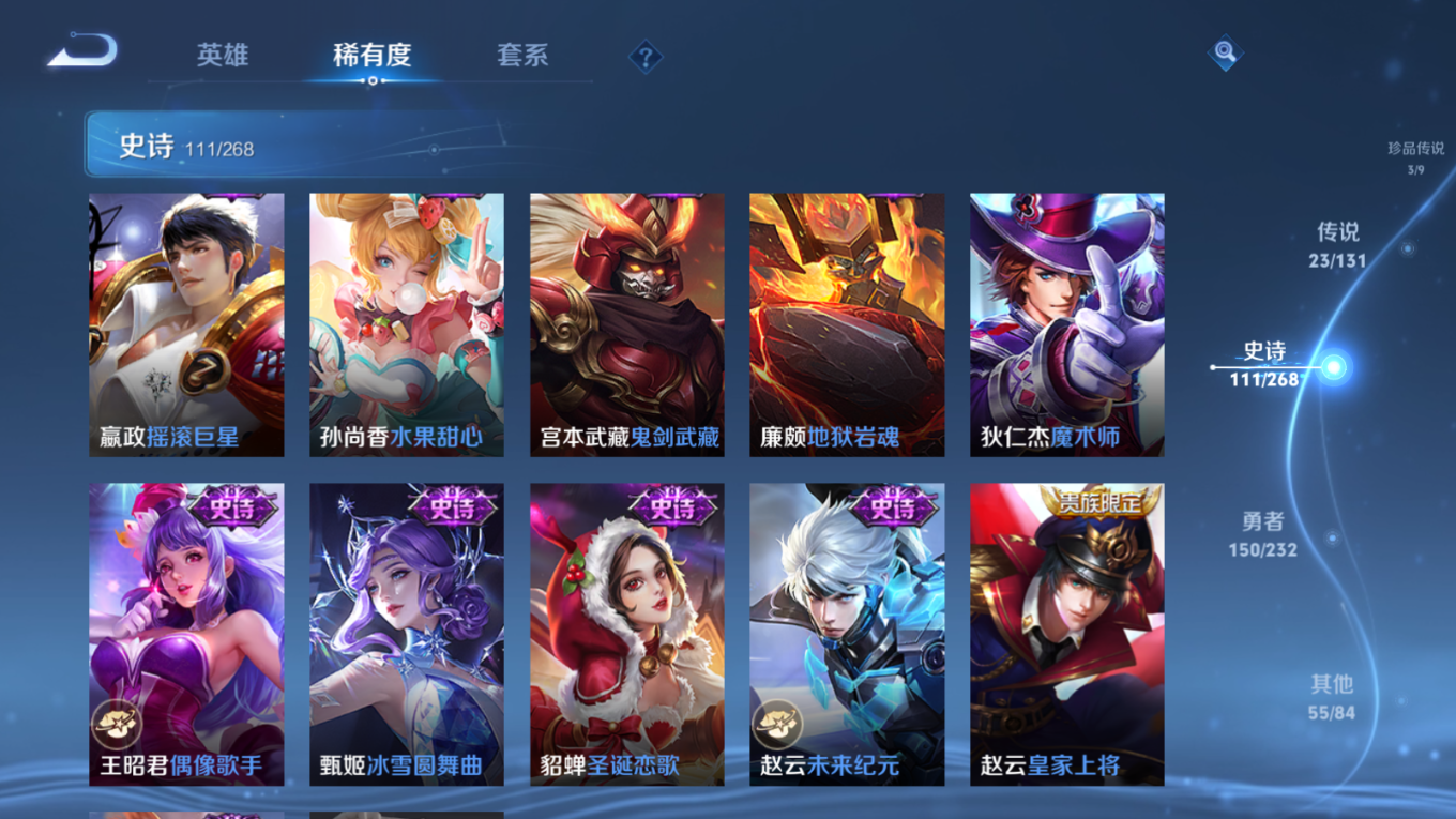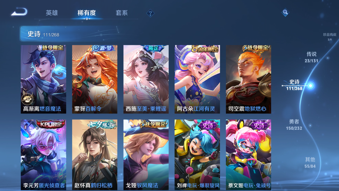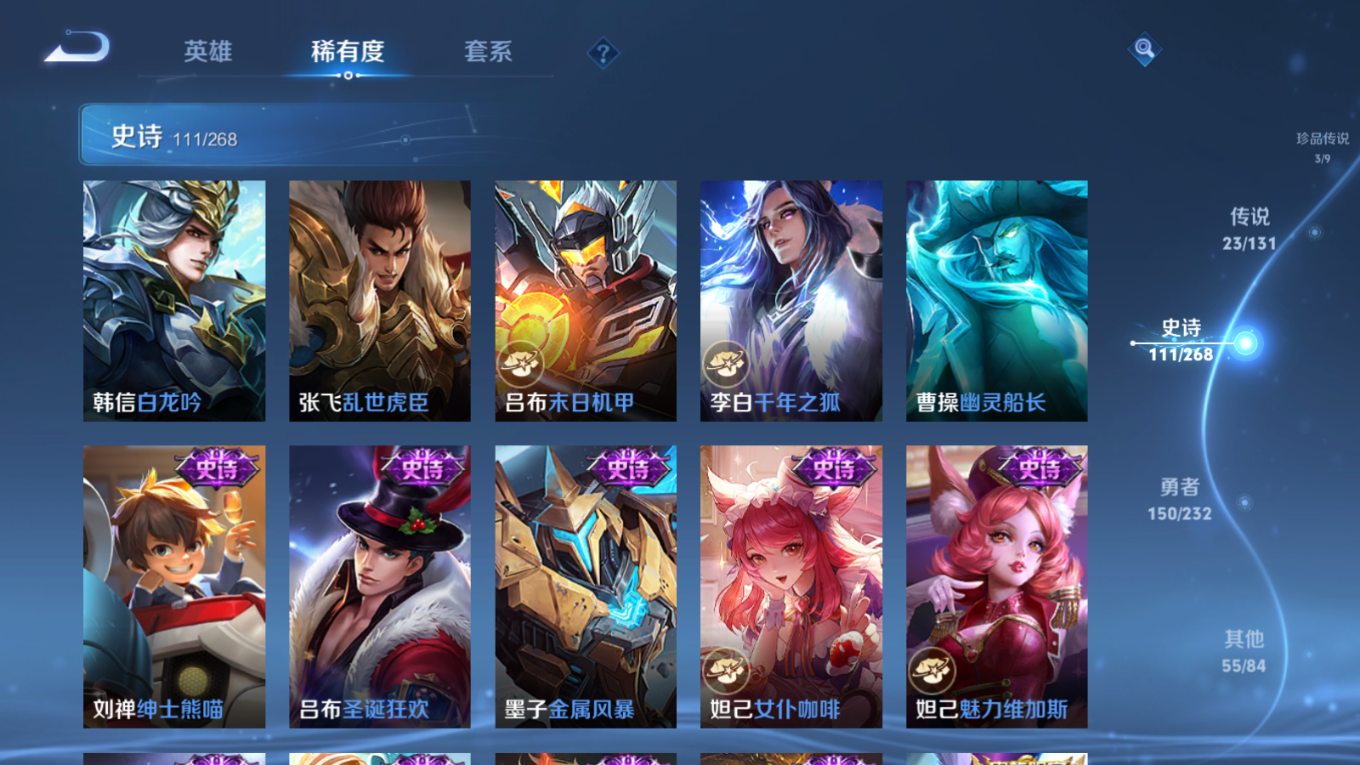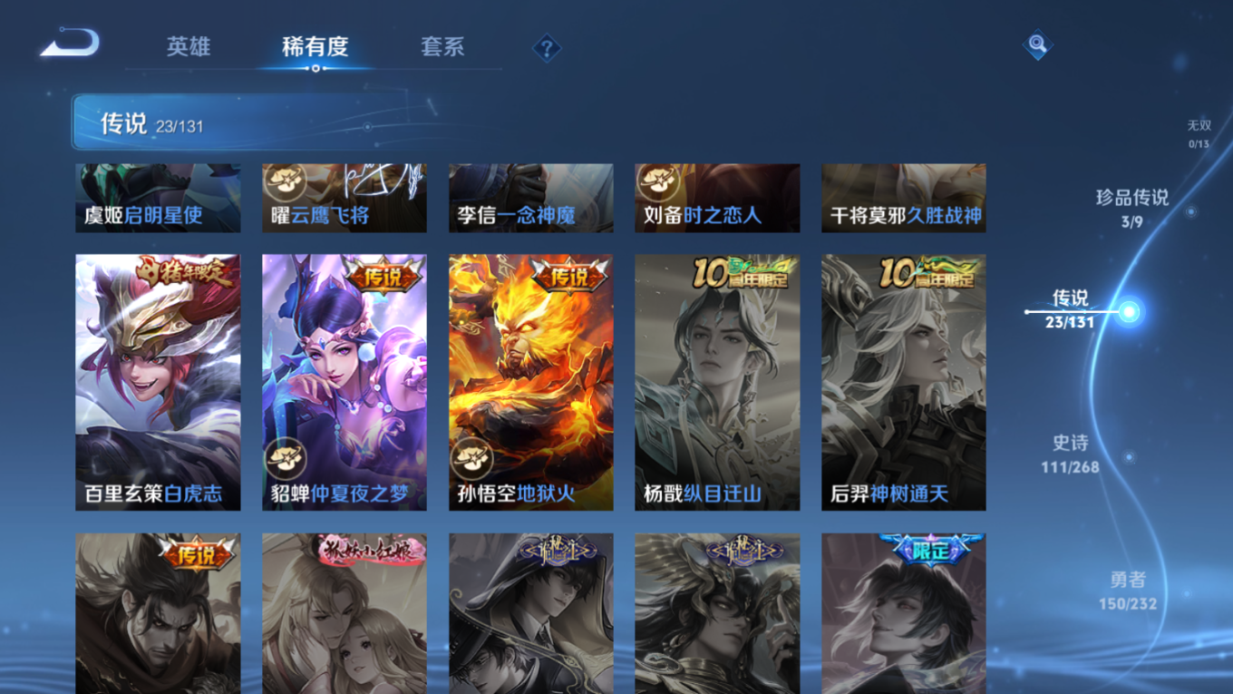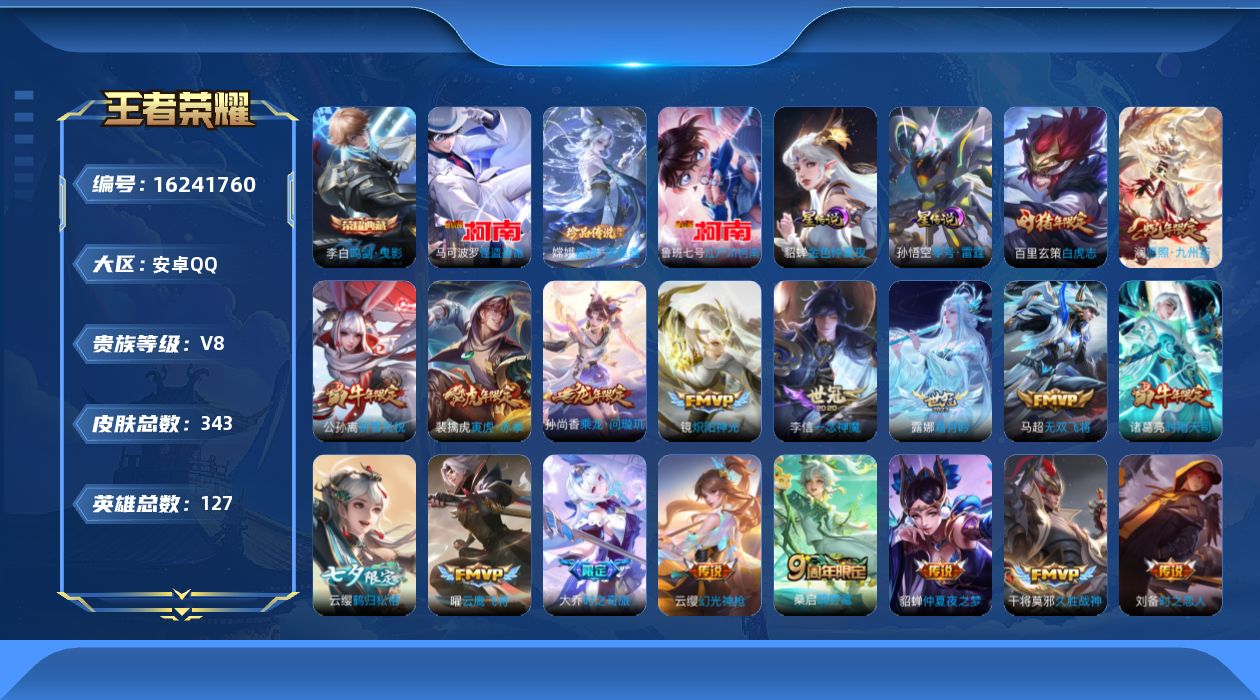 贵族等级:v8皮肤数:343传说品质23 生肖限定10 情人节限定2 珍品传说3 荣耀典藏1 英雄数:127