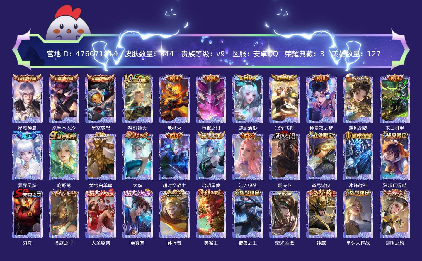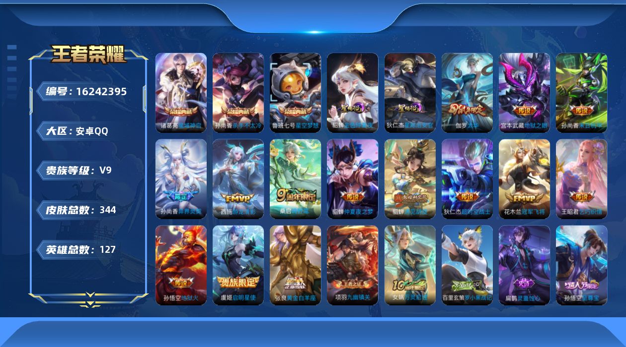 贵族等级:v9皮肤数:344传说品质15 荣耀典藏3 情人节限定2 生肖限定2 英雄数:127