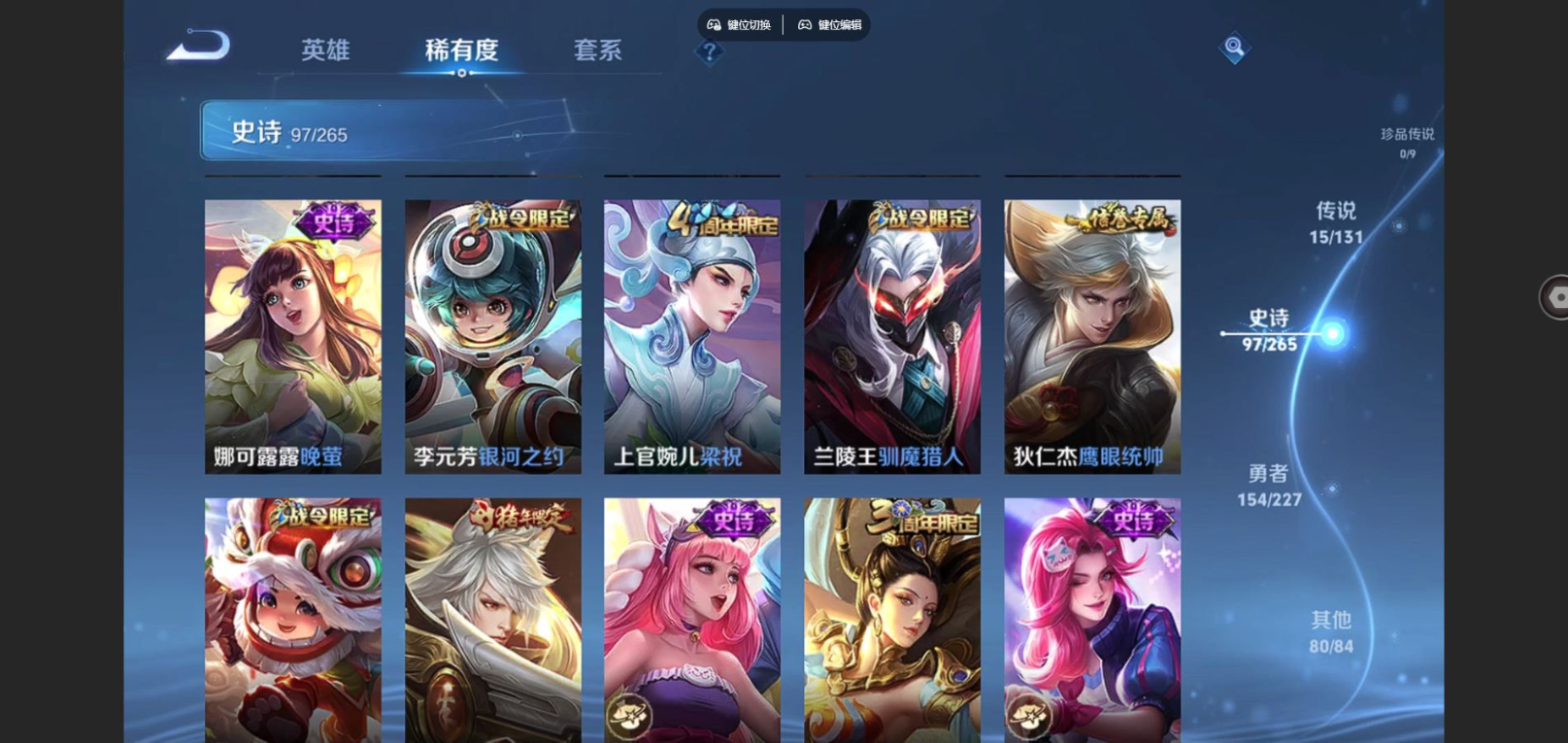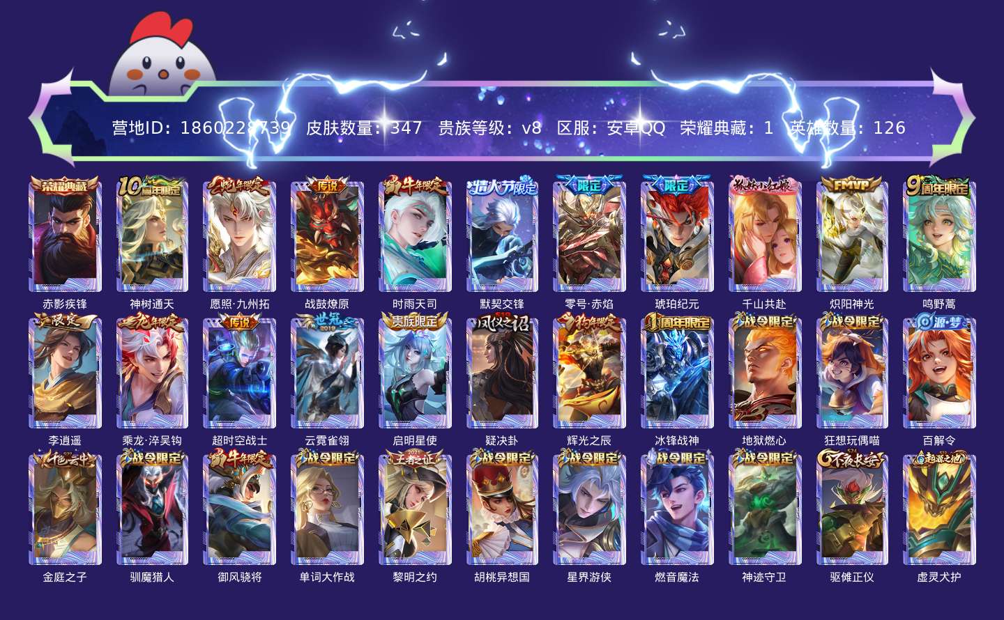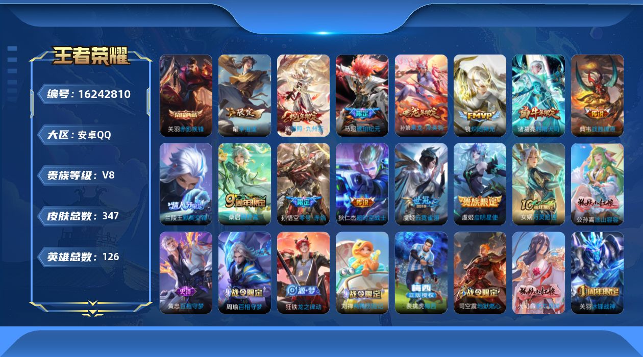 贵族等级:v8皮肤数:347生肖限定8 传说品质15 荣耀典藏1 情人节限定2 英雄数:126