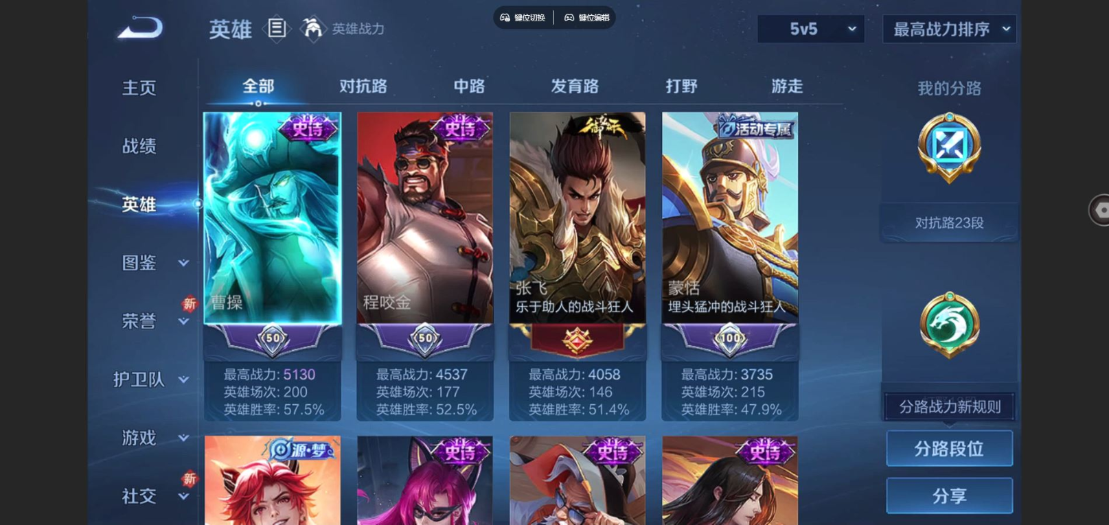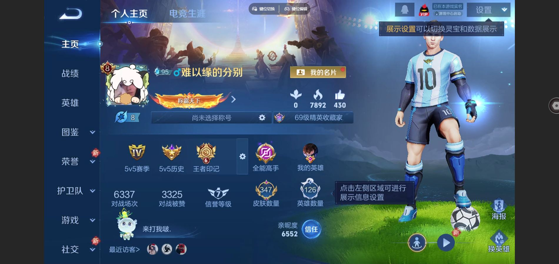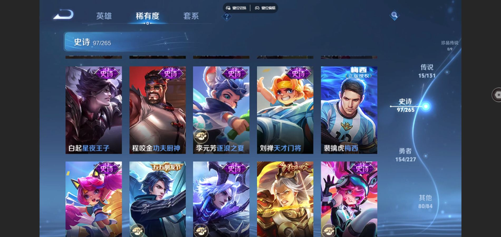 贵族等级:v8皮肤数:347生肖限定8 传说品质15 荣耀典藏1 情人节限定2 英雄数:126