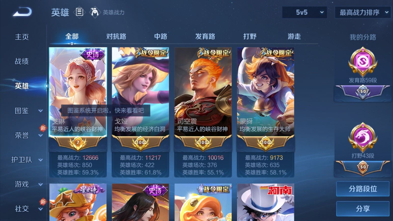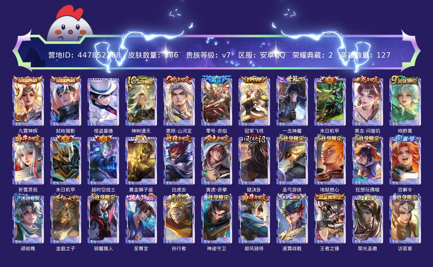 贵族等级:v7皮肤数:386传说品质14 生肖限定7 情人节限定1 荣耀典藏2 珍品传说1 英雄数:127