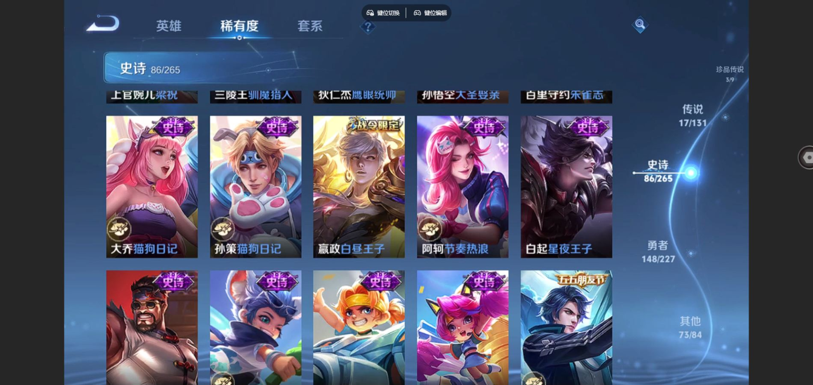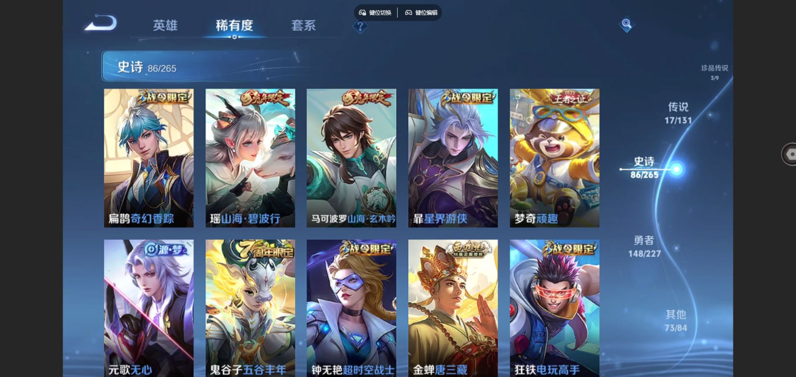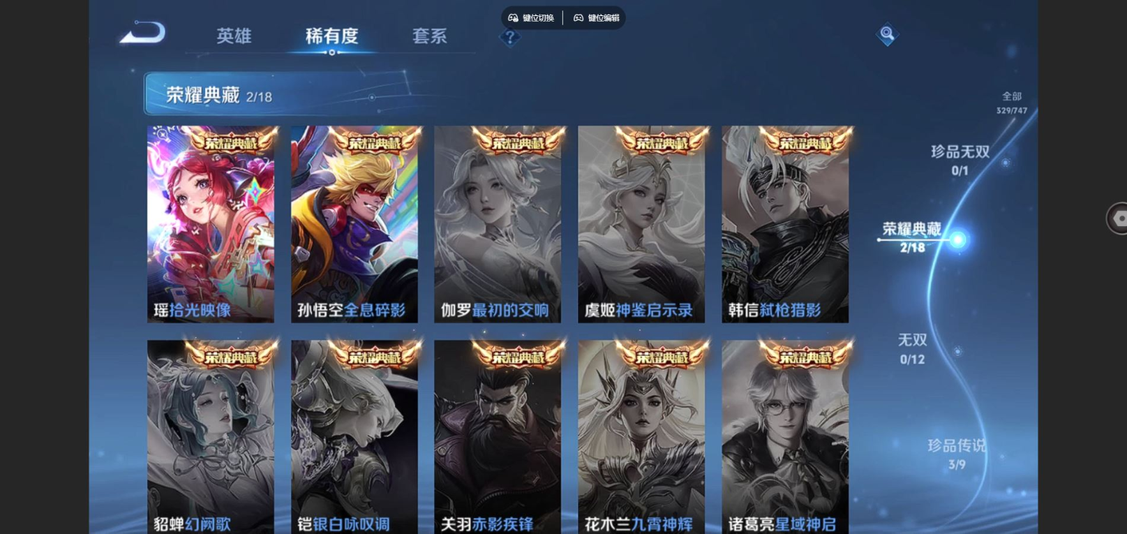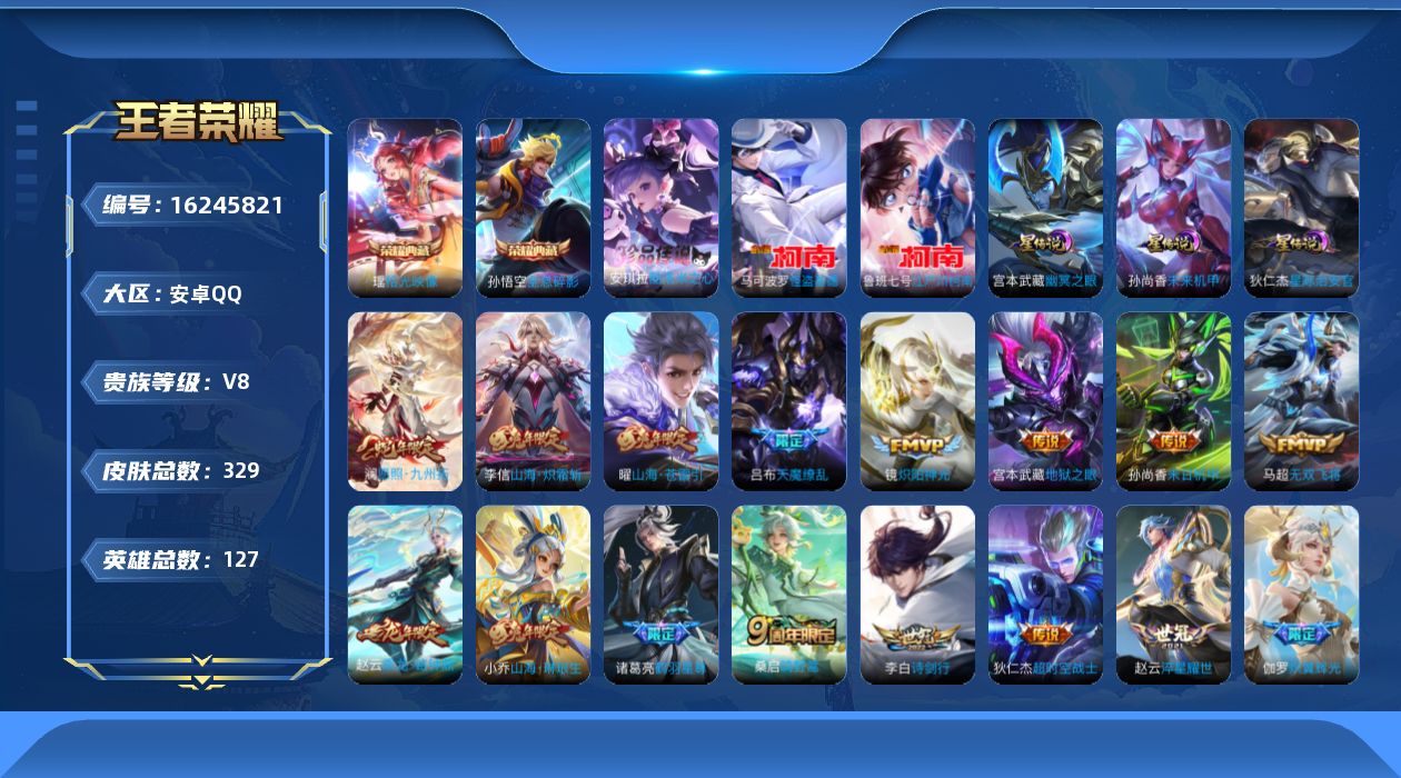 贵族等级:v8皮肤数:329传说品质17 生肖限定8 情人节限定3 荣耀典藏2 珍品传说3 英雄数:127