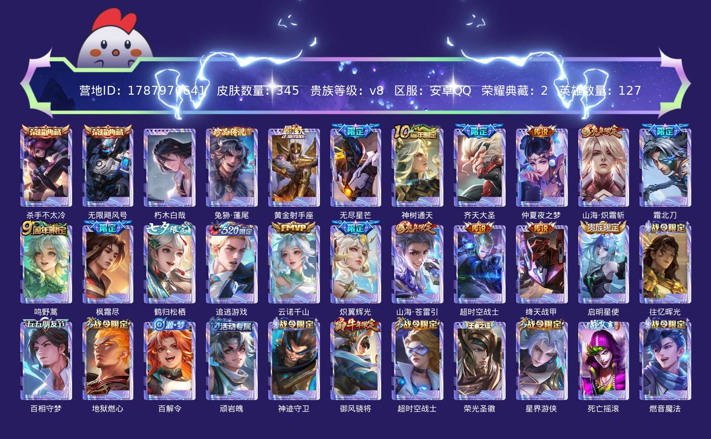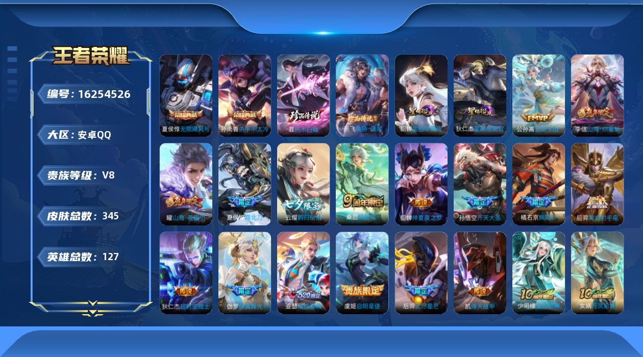 贵族等级:v8皮肤数:345传说品质17 生肖限定4 珍品传说2 荣耀典藏2 英雄数:127