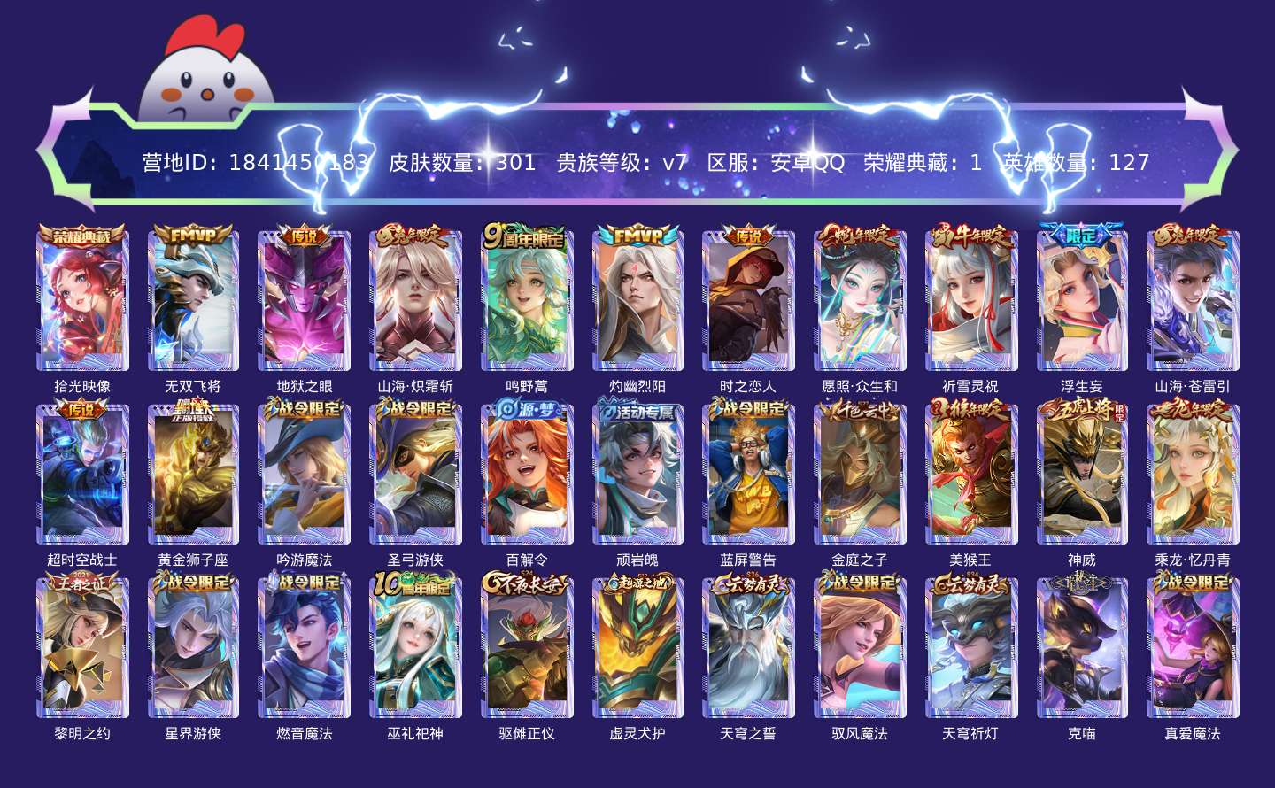 贵族等级:v7皮肤数:301生肖限定9 传说品质12 情人节限定1 荣耀典藏1 英雄数:127