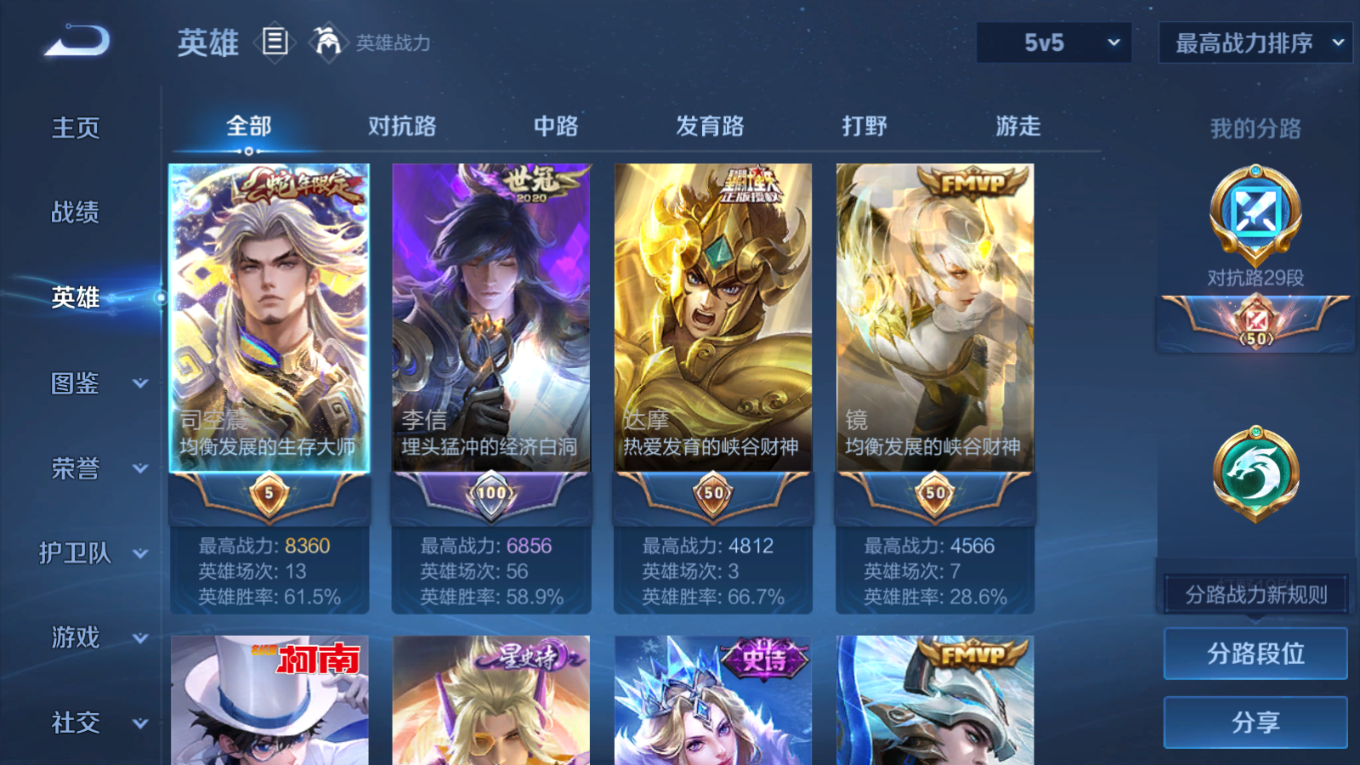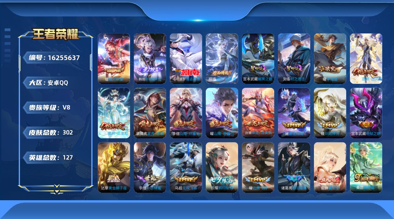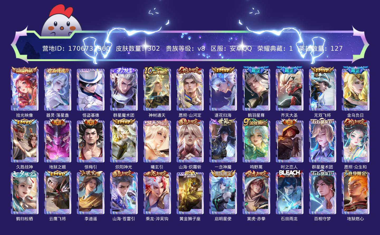 贵族等级:v8皮肤数:302传说品质26 生肖限定7 情人节限定1 珍品传说2 荣耀典藏1 无双1 英雄数:127