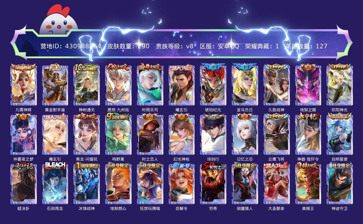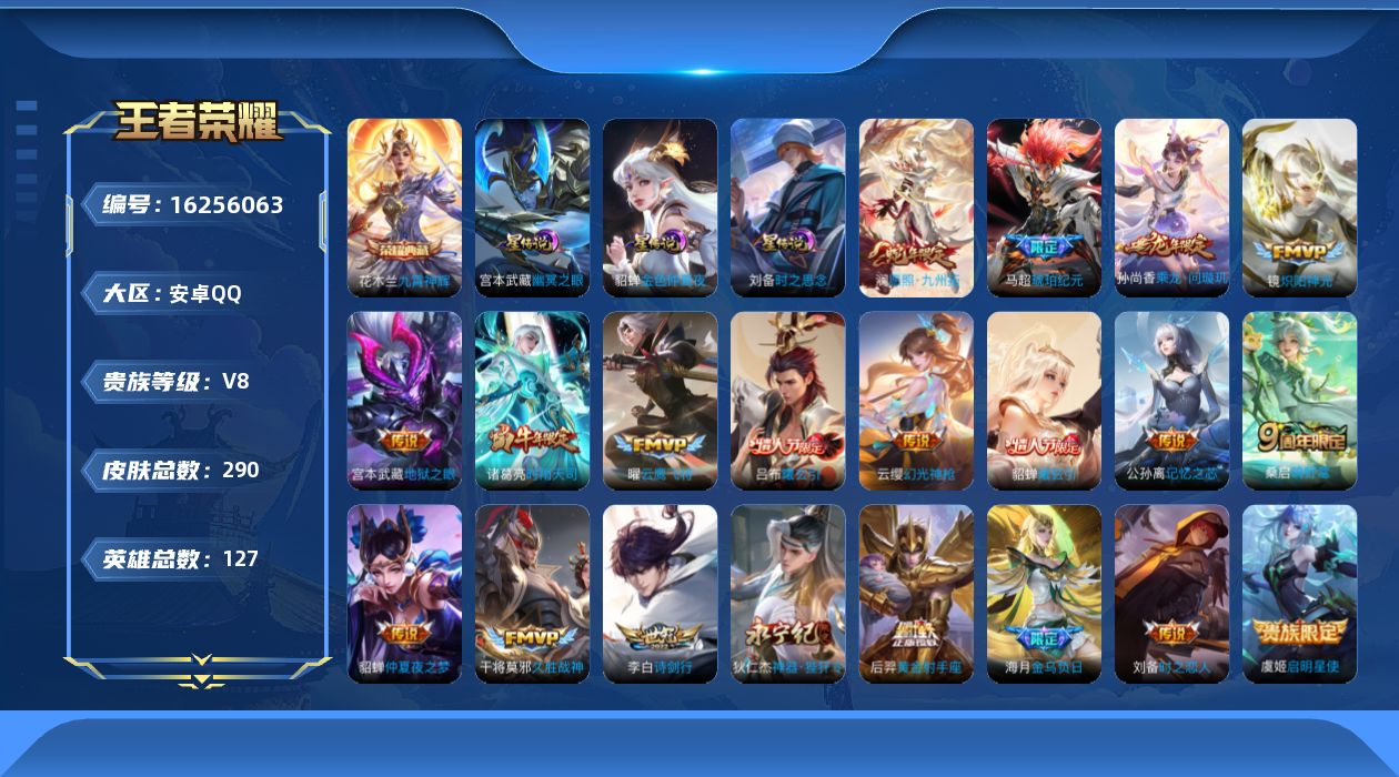 贵族等级:v8皮肤数:290传说品质21 生肖限定6 情人节限定3 荣耀典藏1 英雄数:127