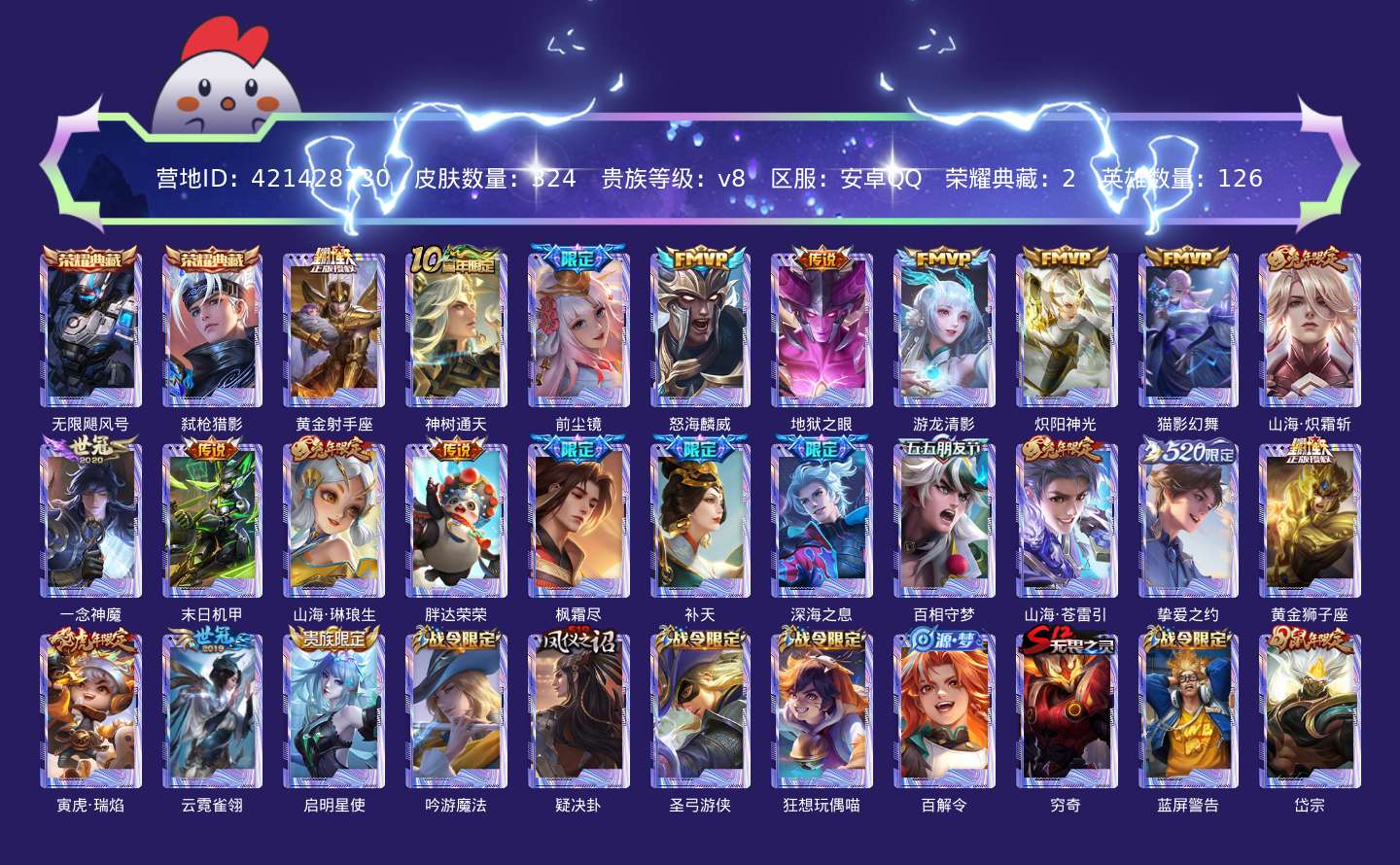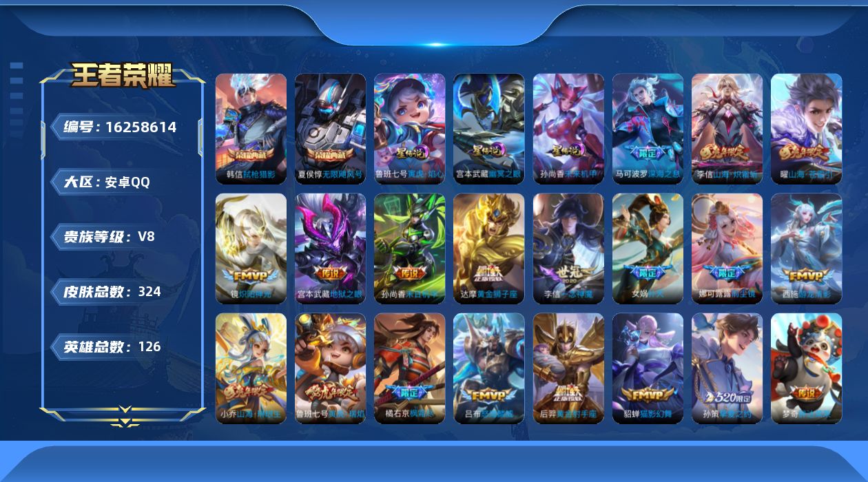 贵族等级:v8皮肤数:324传说品质23 生肖限定10 荣耀典藏2 英雄数:126