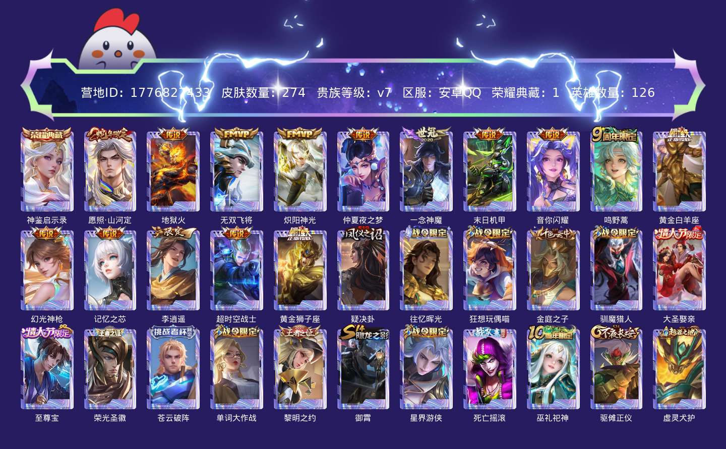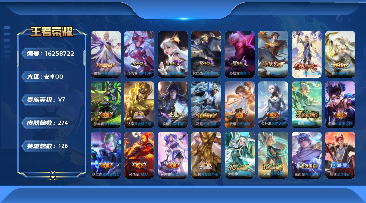 贵族等级:v7皮肤数:274传说品质15 生肖限定3 情人节限定2 荣耀典藏1 英雄数:126
