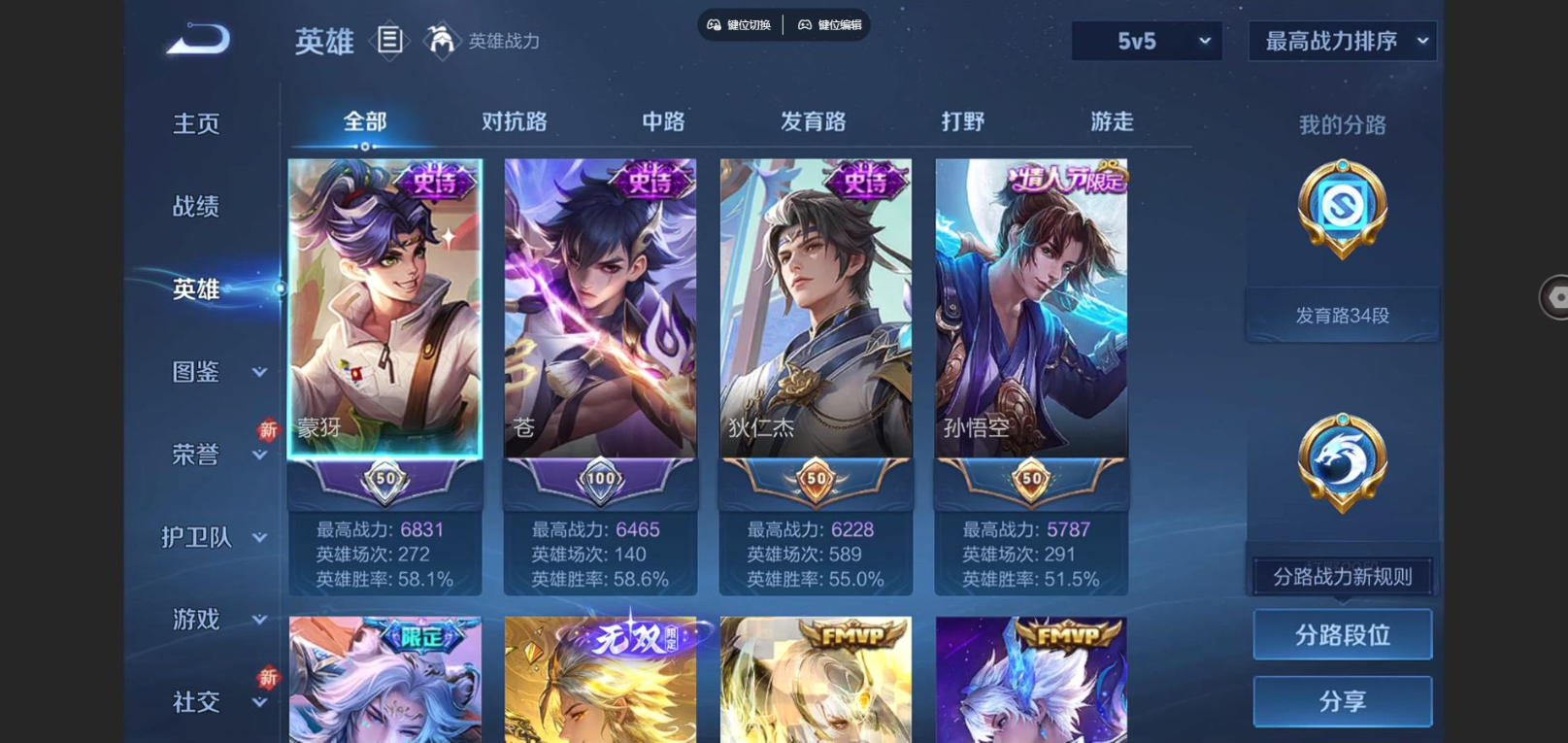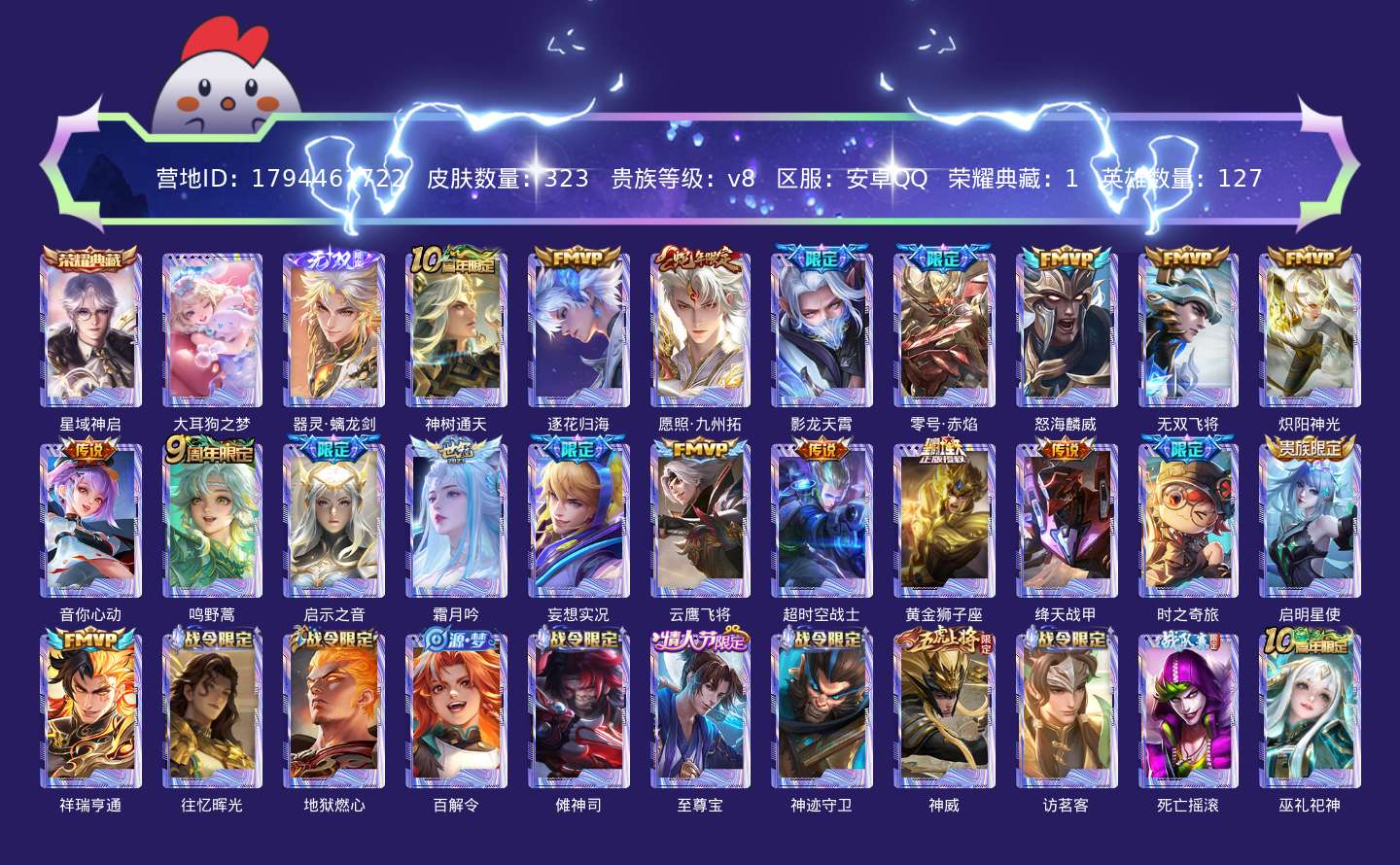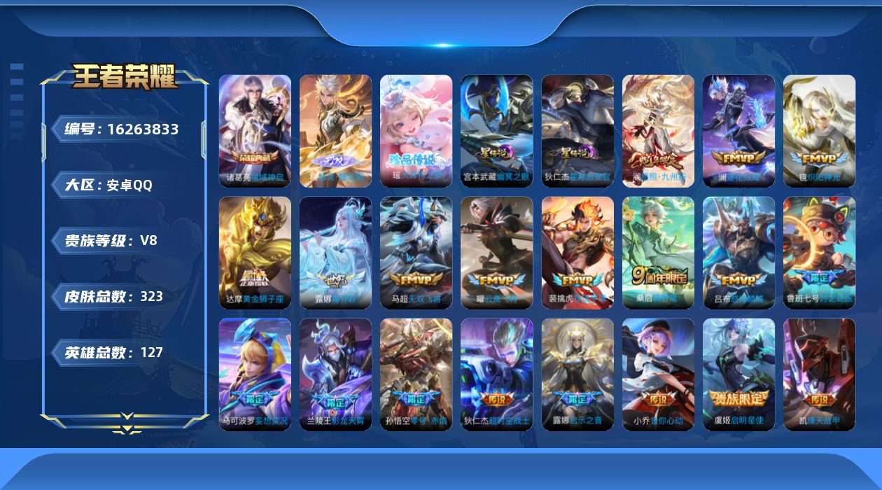 贵族等级:v8皮肤数:323传说品质20 生肖限定2 荣耀典藏1 情人节限定1 珍品传说1 无双1 英雄数:127