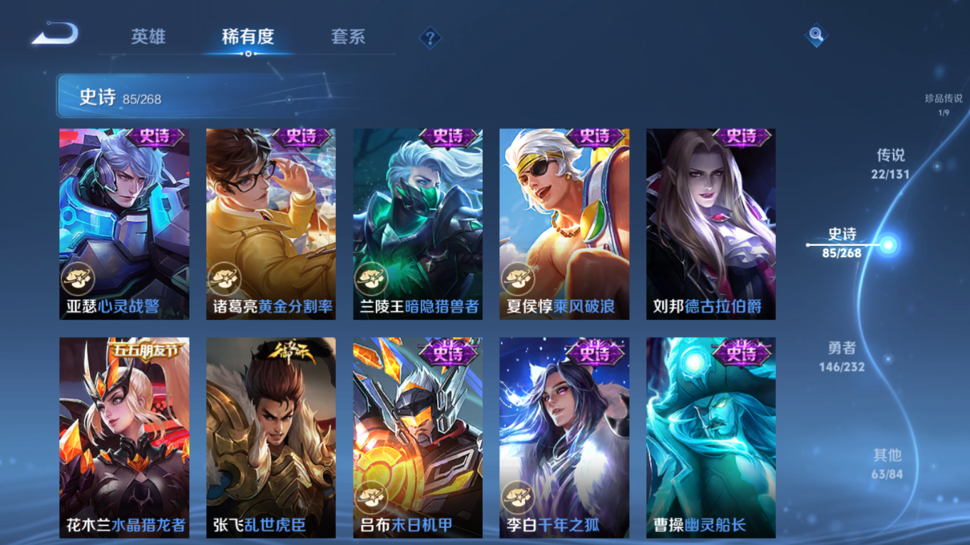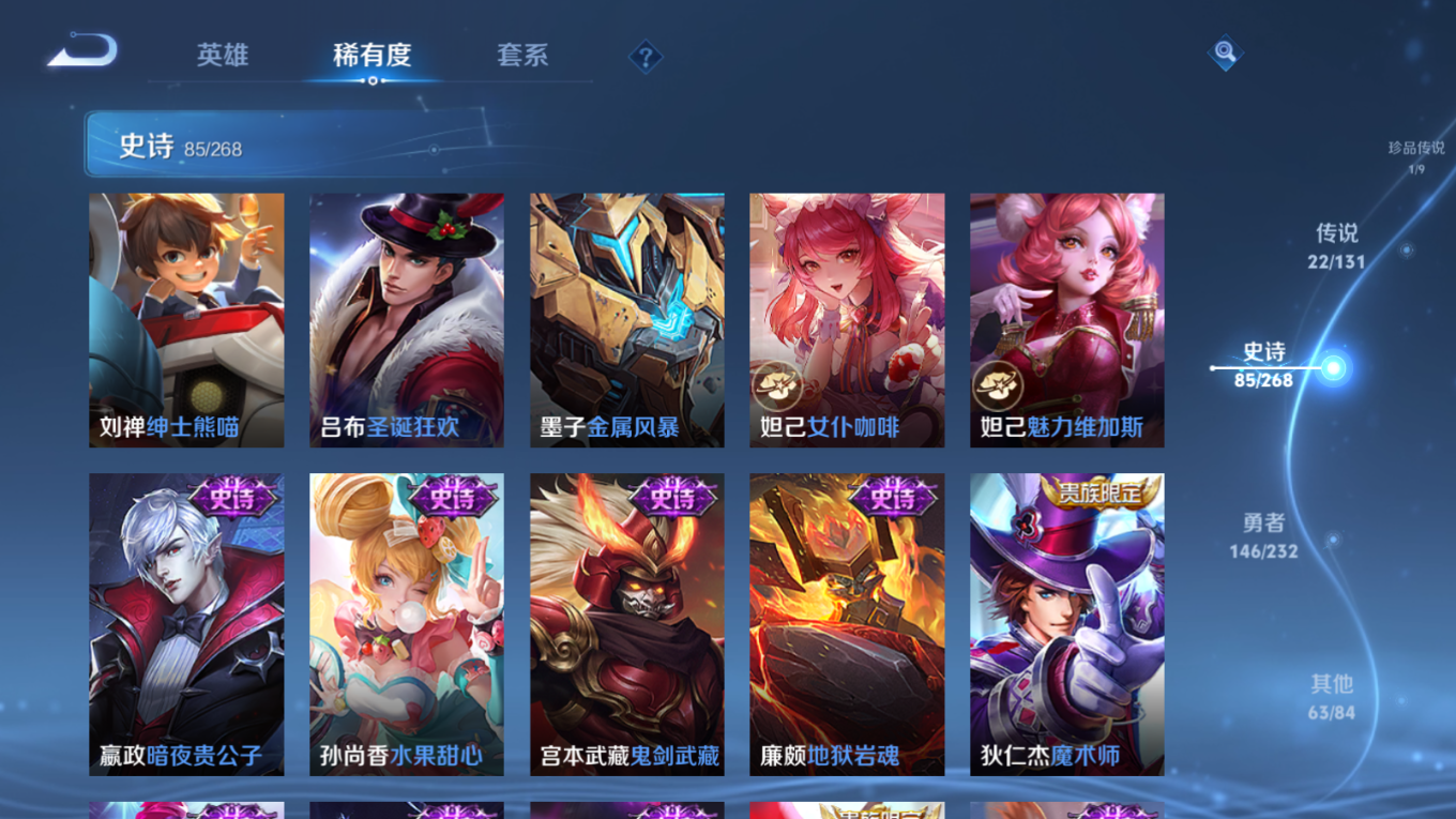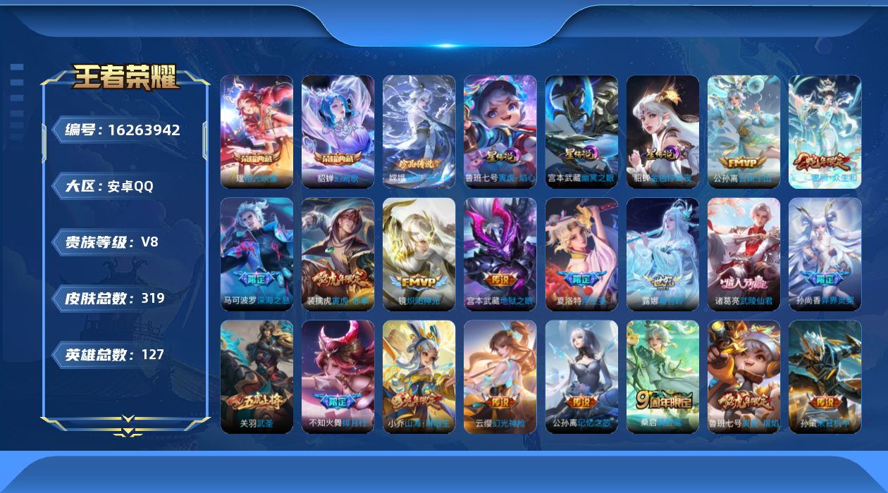 贵族等级:v8皮肤数:319生肖限定8 传说品质22 情人节限定1 荣耀典藏2 珍品传说1 英雄数:127