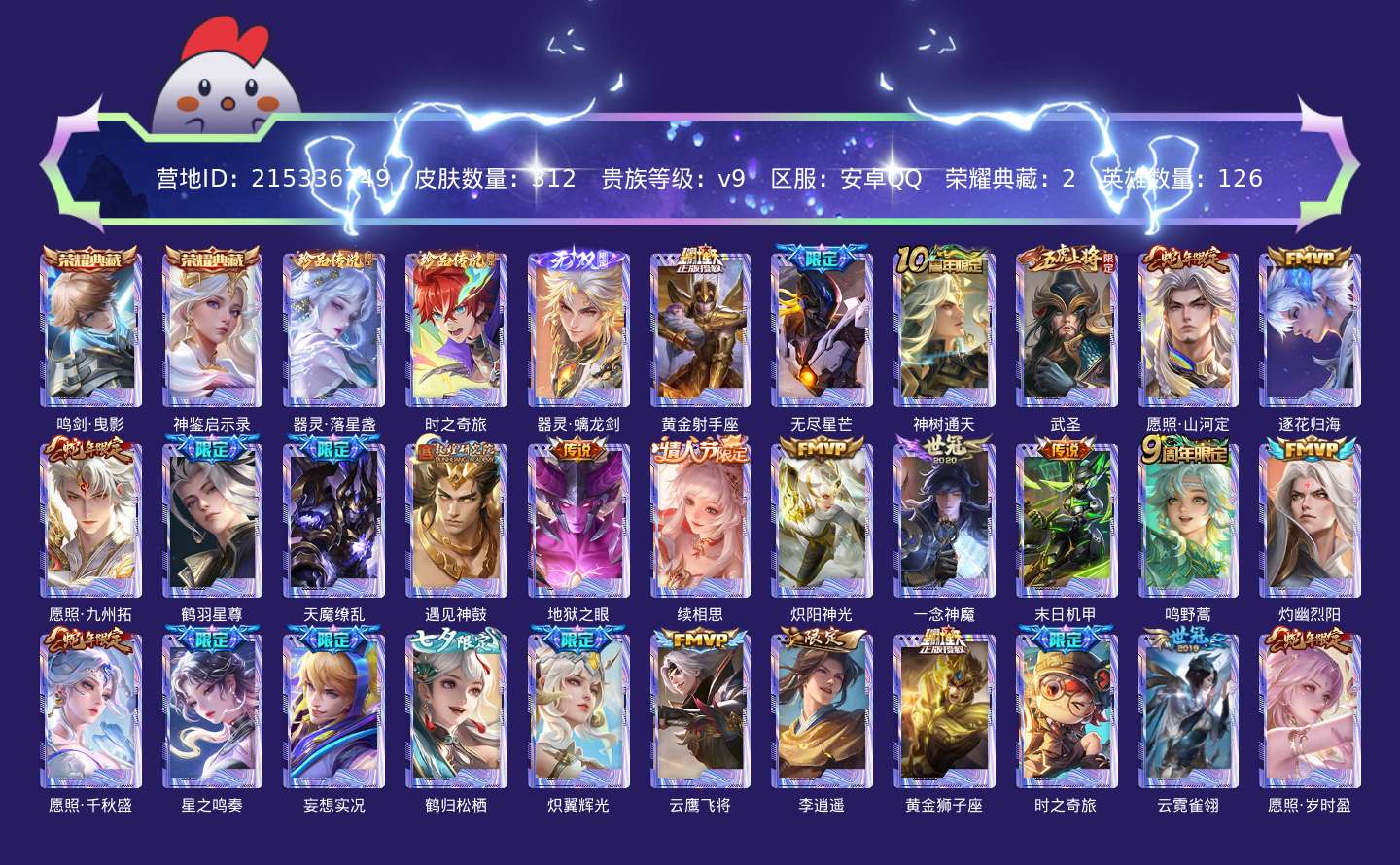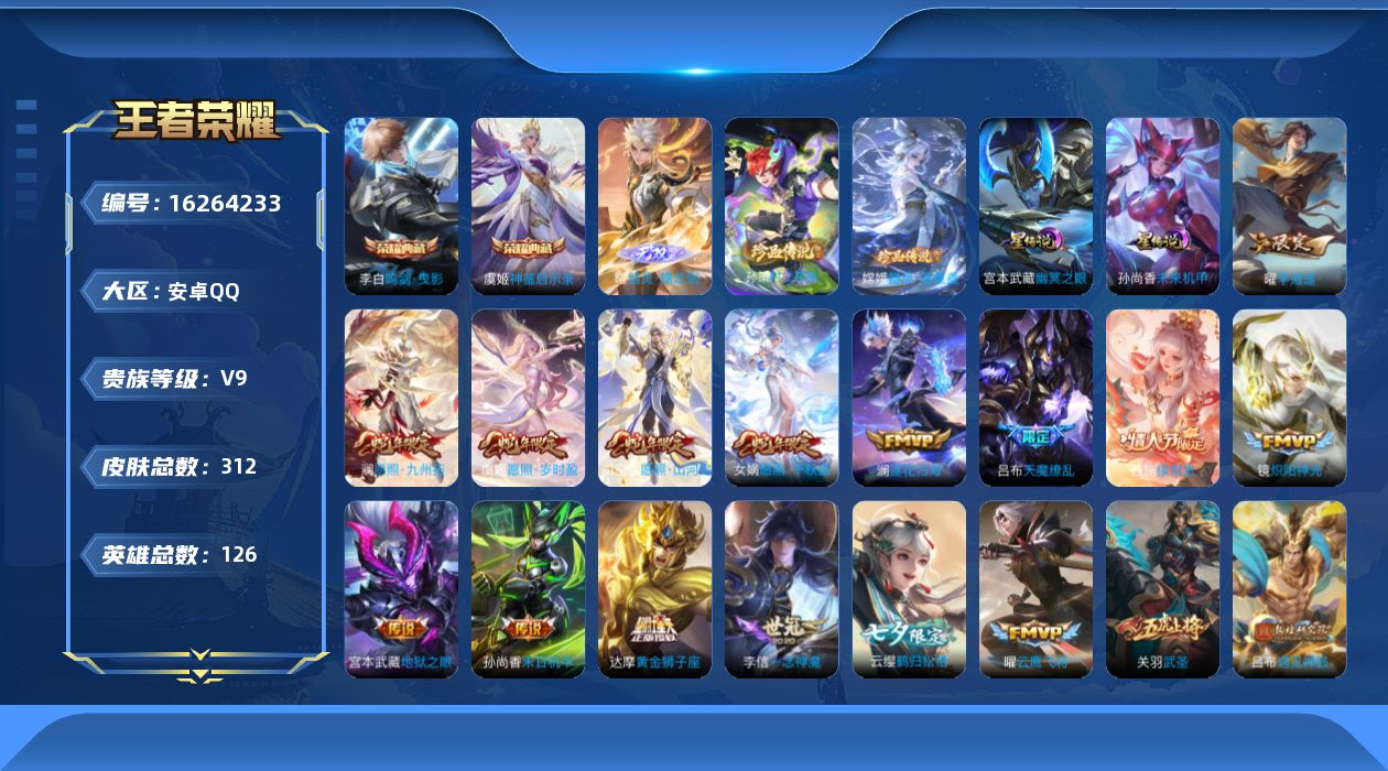 传说品质_后羿_黄金射手座传说品质_后羿_无尽星芒传说品质_后羿_神树通天传说品质_关羽_武圣传说品质_司空震_愿照·山河定传说品质_澜_逐花归海传说品质_澜_愿照·九州拓传说品质_诸葛亮_鹤羽星尊传说品质_吕布_天魔缭乱传说品质_吕布_遇见神鼓传说品质_宫本武藏_地狱之眼传说品质_西施_续相思传说品质_镜_炽阳神光传说品质_李信_一念神魔传说品质_孙尚香_末日机甲传说品质_桑启_鸣野蒿传说品质_东皇太一_灼幽烈阳传说品质_女娲_愿照·千秋盛传说品质_杨玉环_星之鸣奏传说品质_马可波罗_妄想实况传说品质_云缨_鹤归松栖传说品质_伽罗_炽翼辉光传说品质_曜_云鹰飞将传说品质_曜_李逍遥 传说品质_达摩_黄金狮子座传说品质_鲁班七号_时之奇旅传说品质_虞姬_云霓雀翎传说品质_虞姬_愿照·岁时盈传说品质_虞姬_启明星使传说品质_裴擒虎_祥瑞亨通