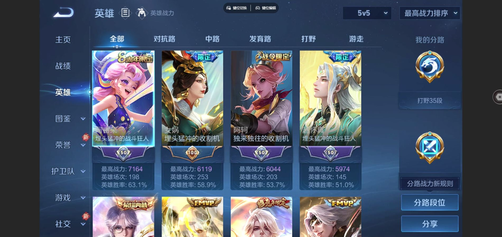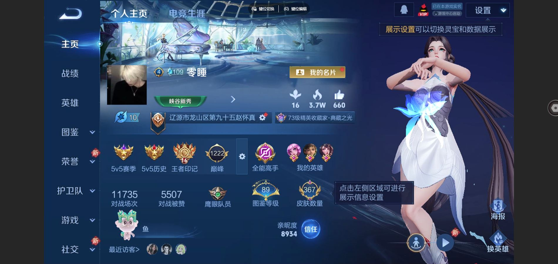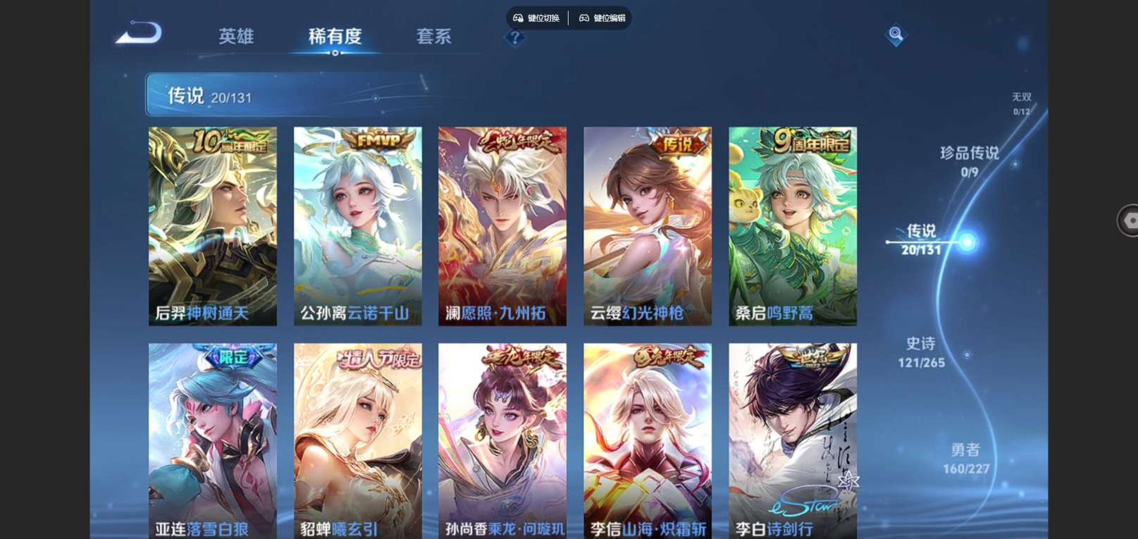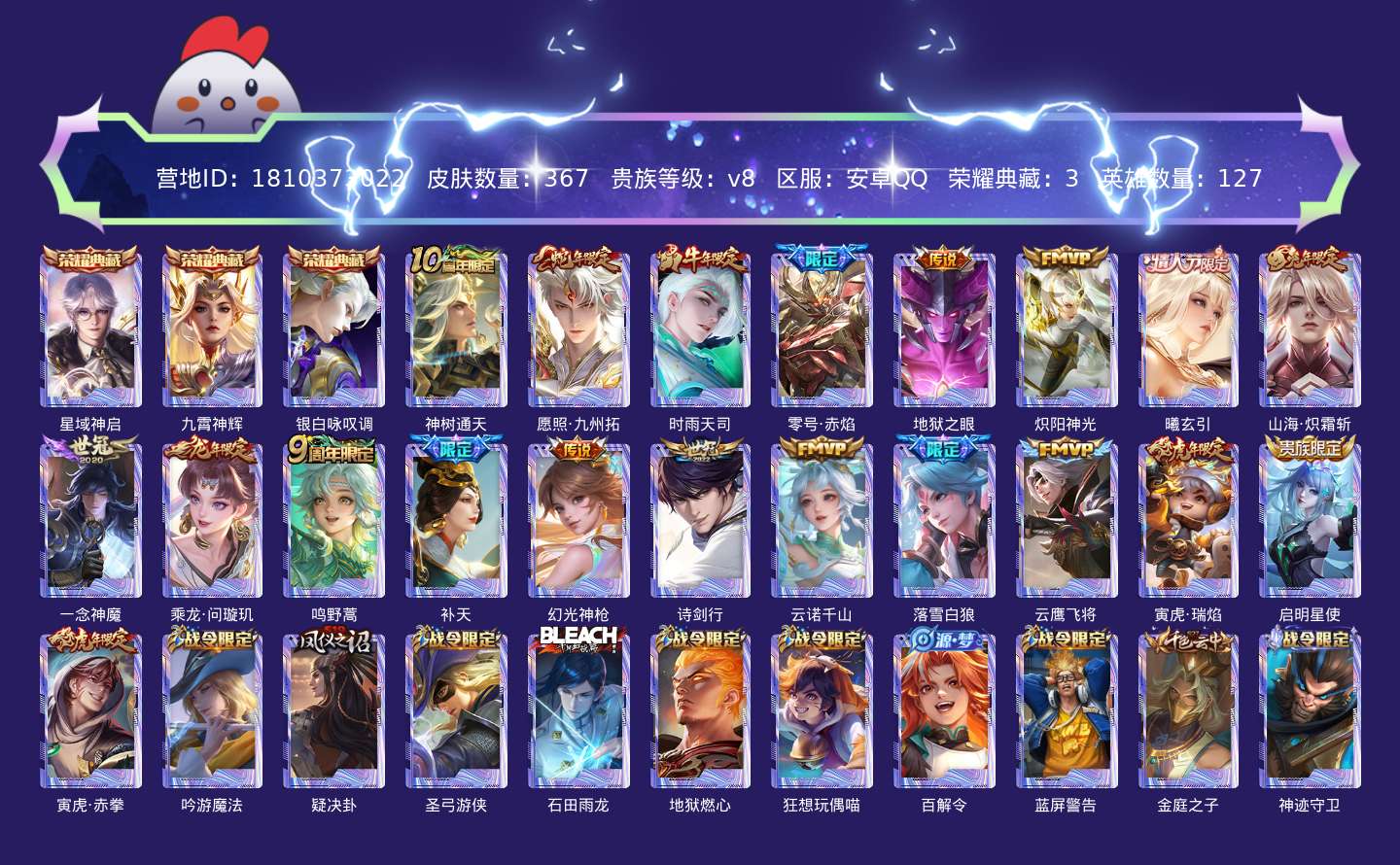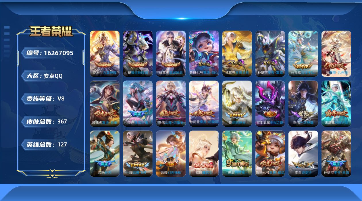 贵族等级:v8皮肤数:367传说品质20 生肖限定9 荣耀典藏3 情人节限定3 英雄数:127