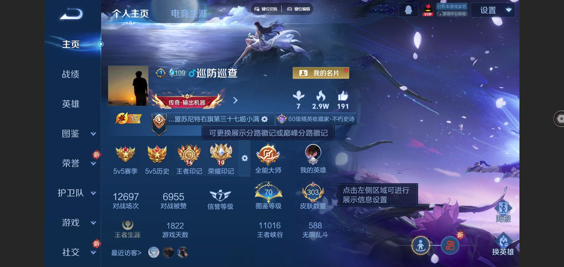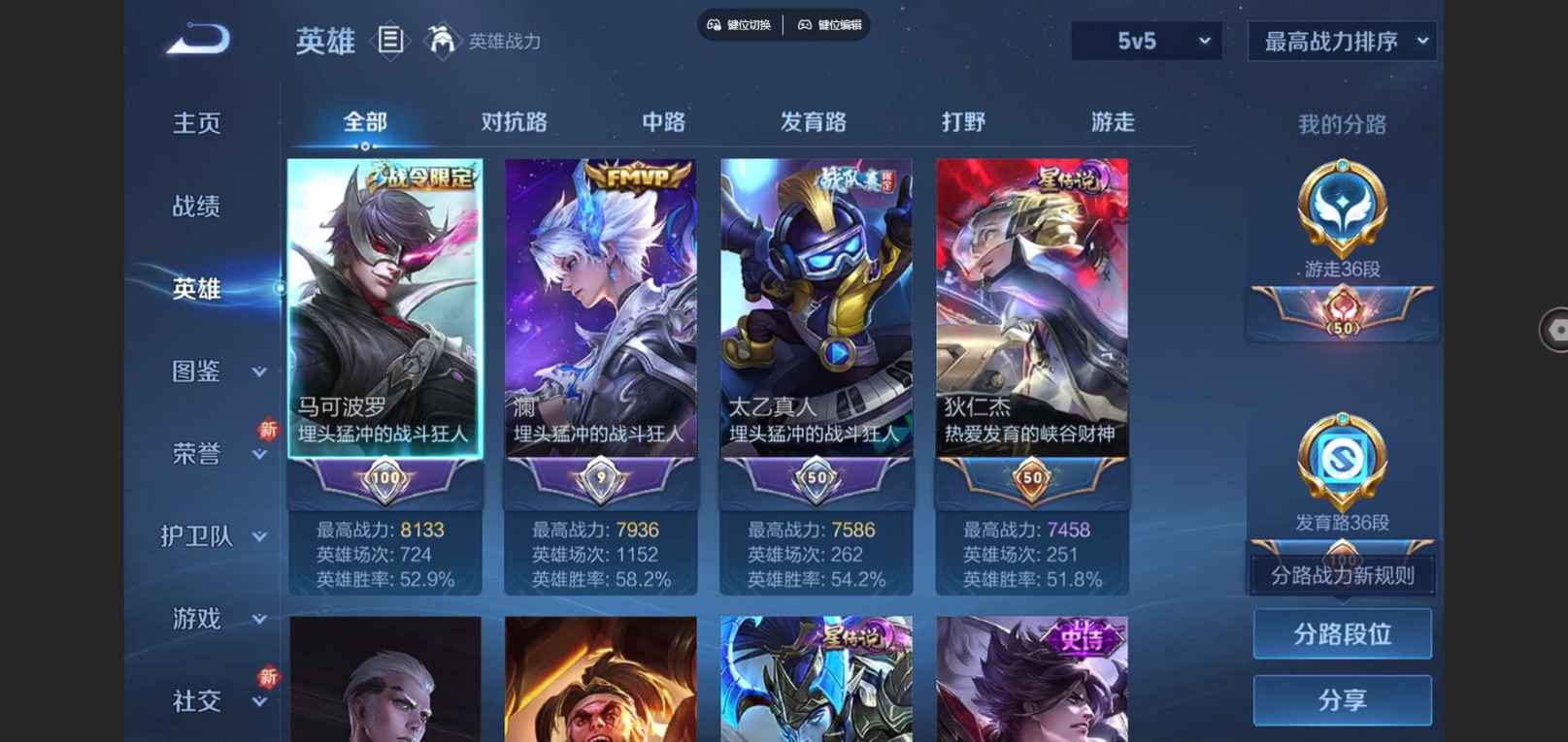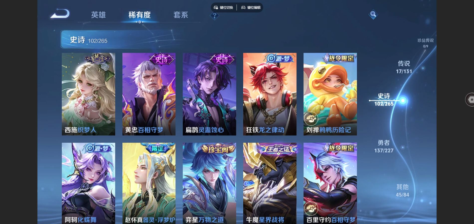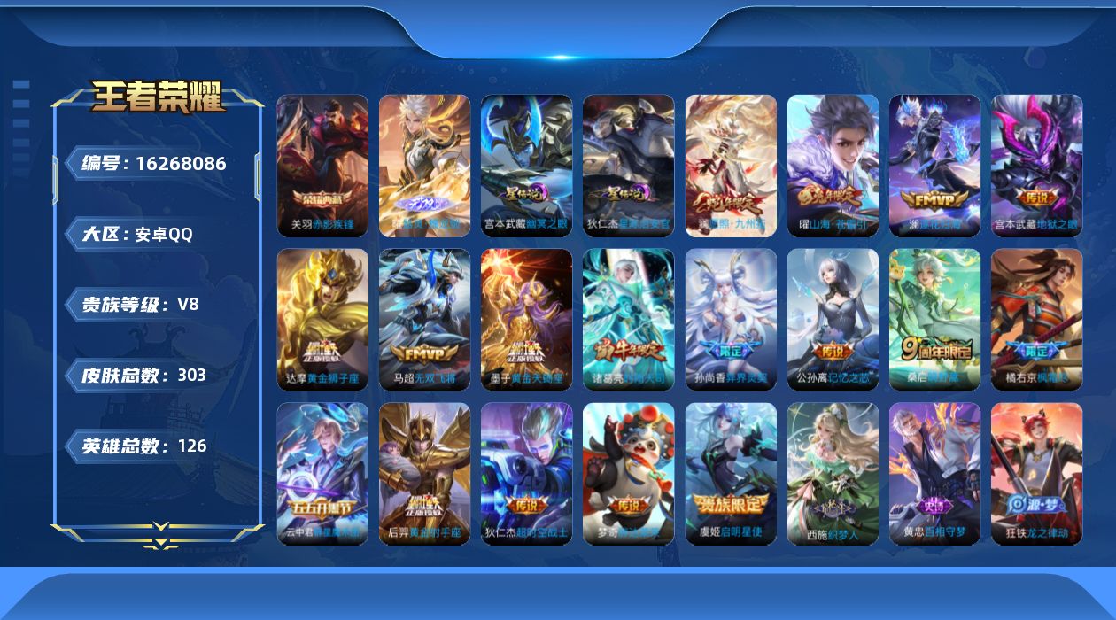贵族等级:v8皮肤数:303传说品质17 荣耀典藏1 生肖限定5 无双1 英雄数:126