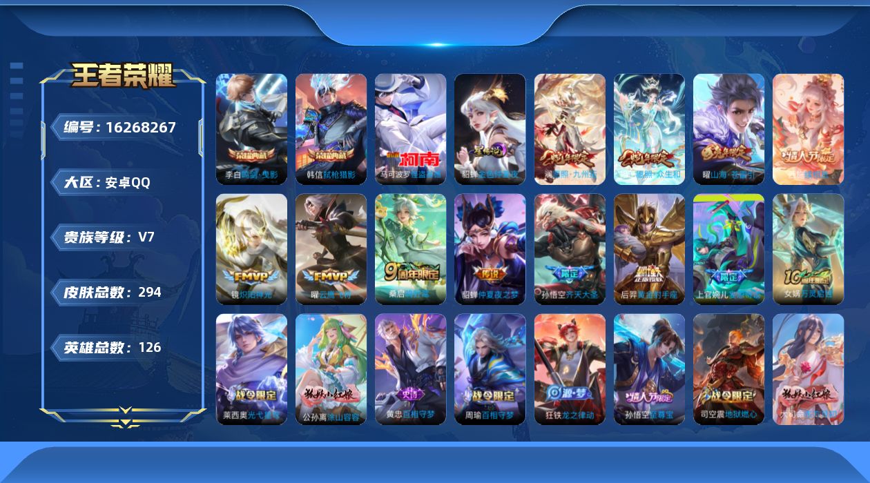 贵族等级:v7皮肤数:294传说品质12 生肖限定3 情人节限定2 珍品传说1 荣耀典藏2 英雄数:126