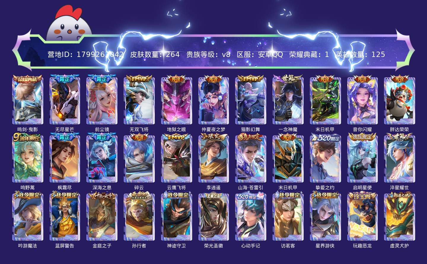 贵族等级:v8皮肤数:264传说品质21 生肖限定4 情人节限定1 荣耀典藏1 英雄数:125