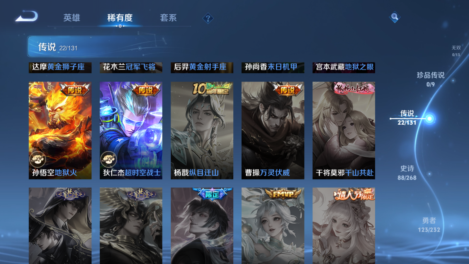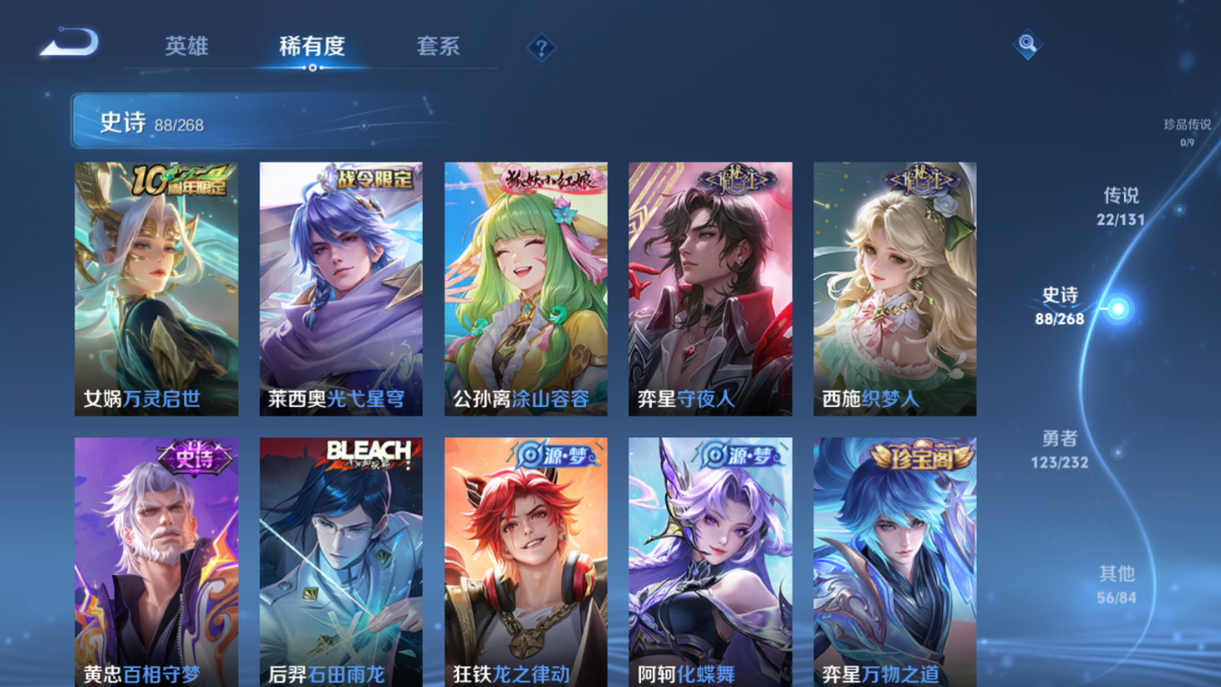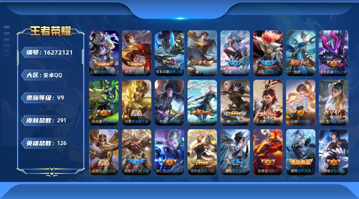 贵族等级:v9皮肤数:291传说品质22 情人节限定2 荣耀典藏2 生肖限定4 英雄数:126