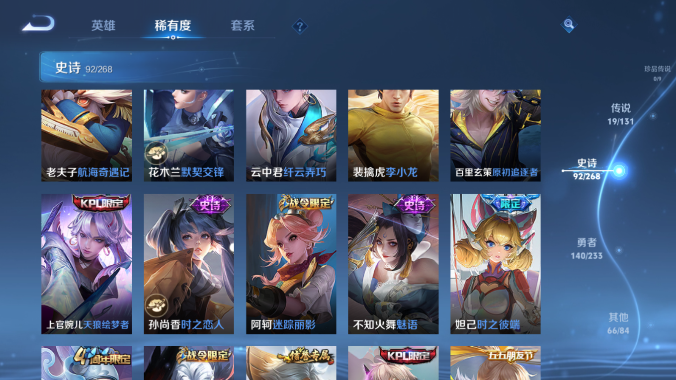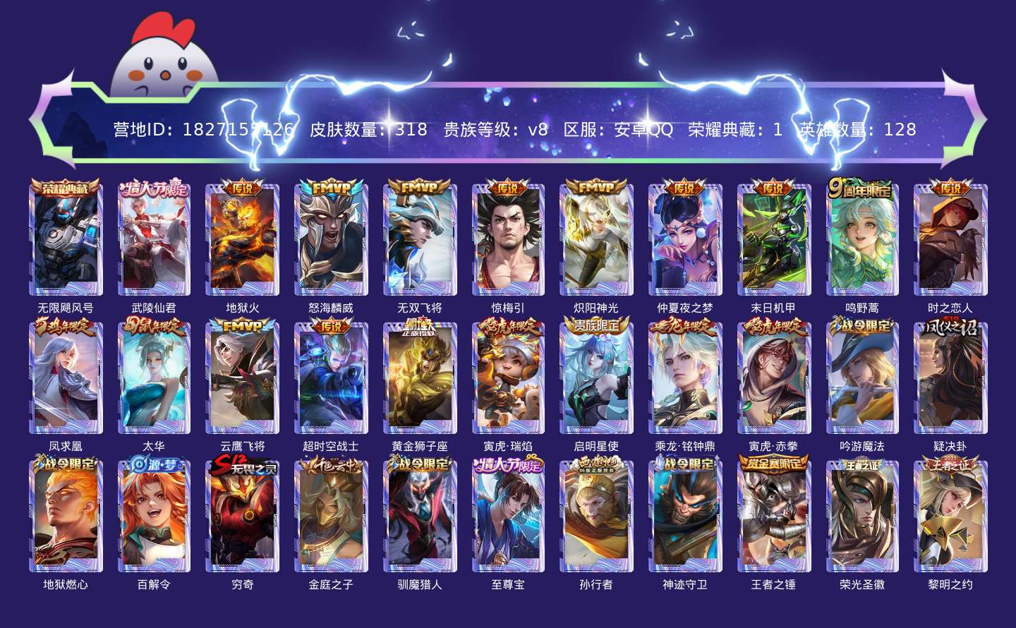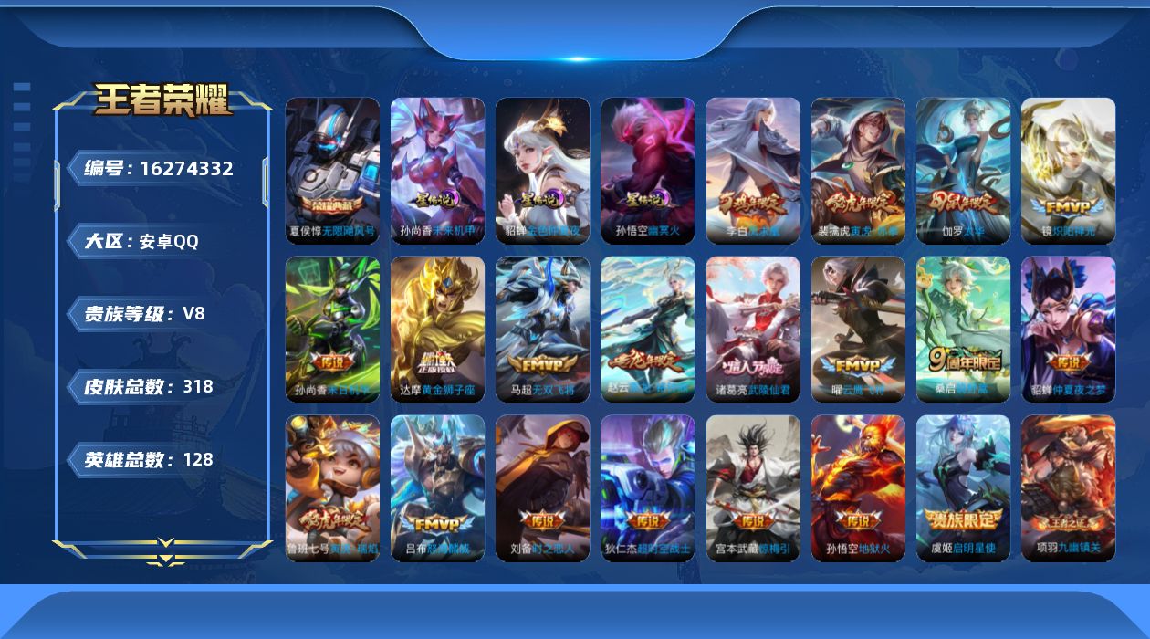 贵族等级:v8皮肤数:318传说品质19 情人节限定3 荣耀典藏1 生肖限定6 英雄数:128