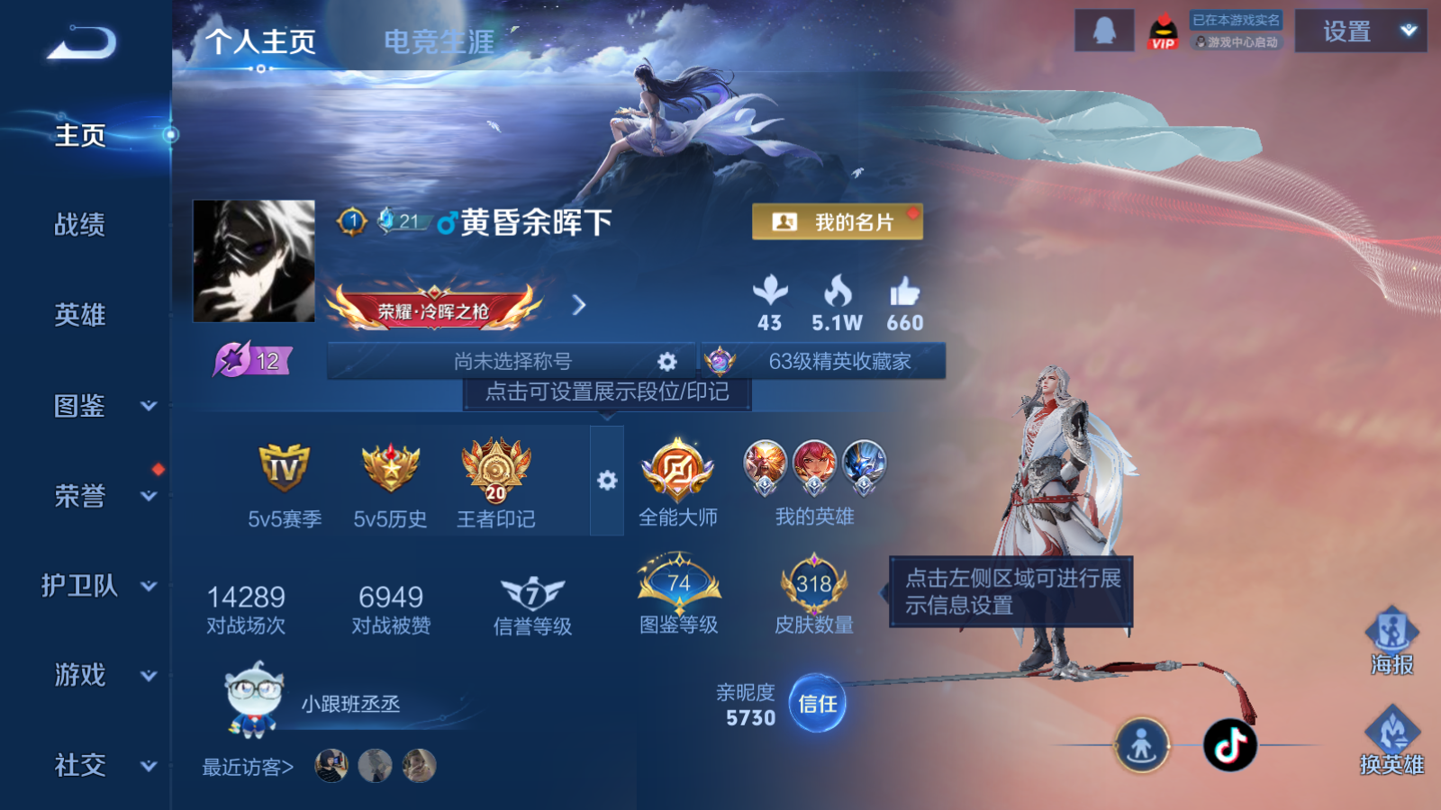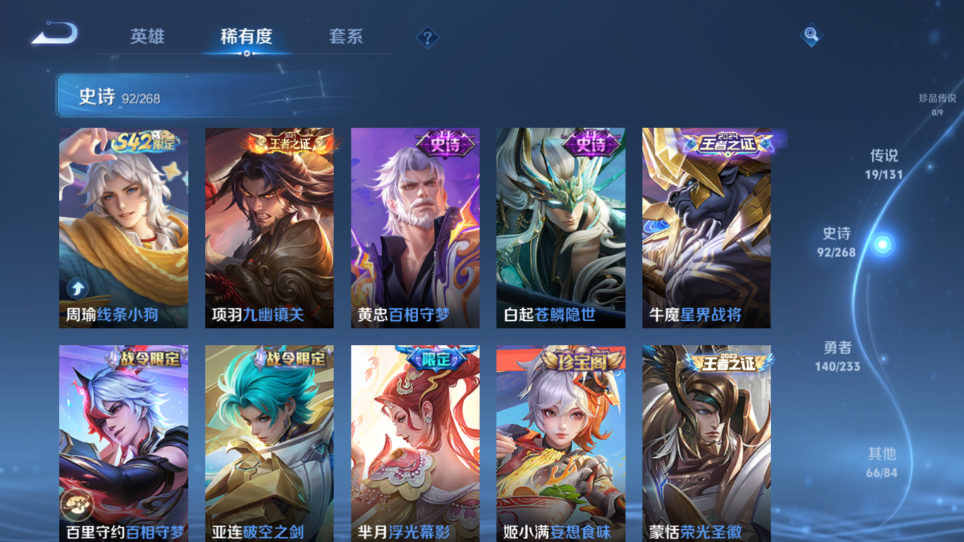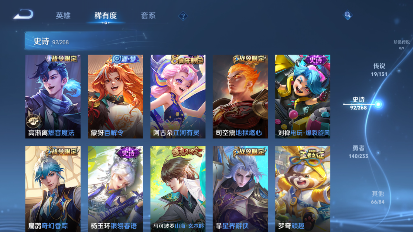 贵族等级:v8皮肤数:318传说品质19 情人节限定3 荣耀典藏1 生肖限定6 英雄数:128