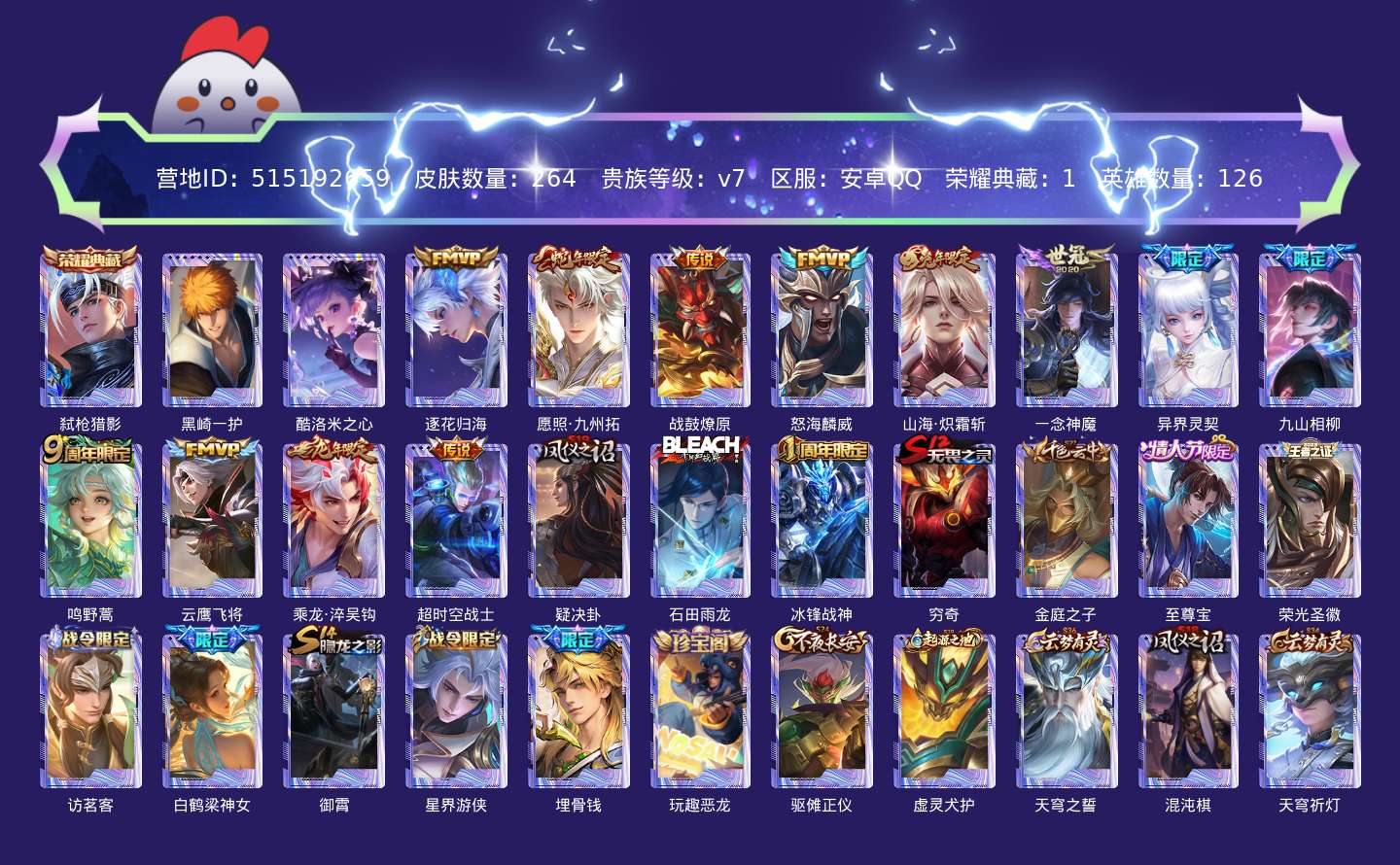 贵族等级:v7皮肤数:264传说品质12 生肖限定4 情人节限定2 珍品传说2 荣耀典藏1 英雄数:126