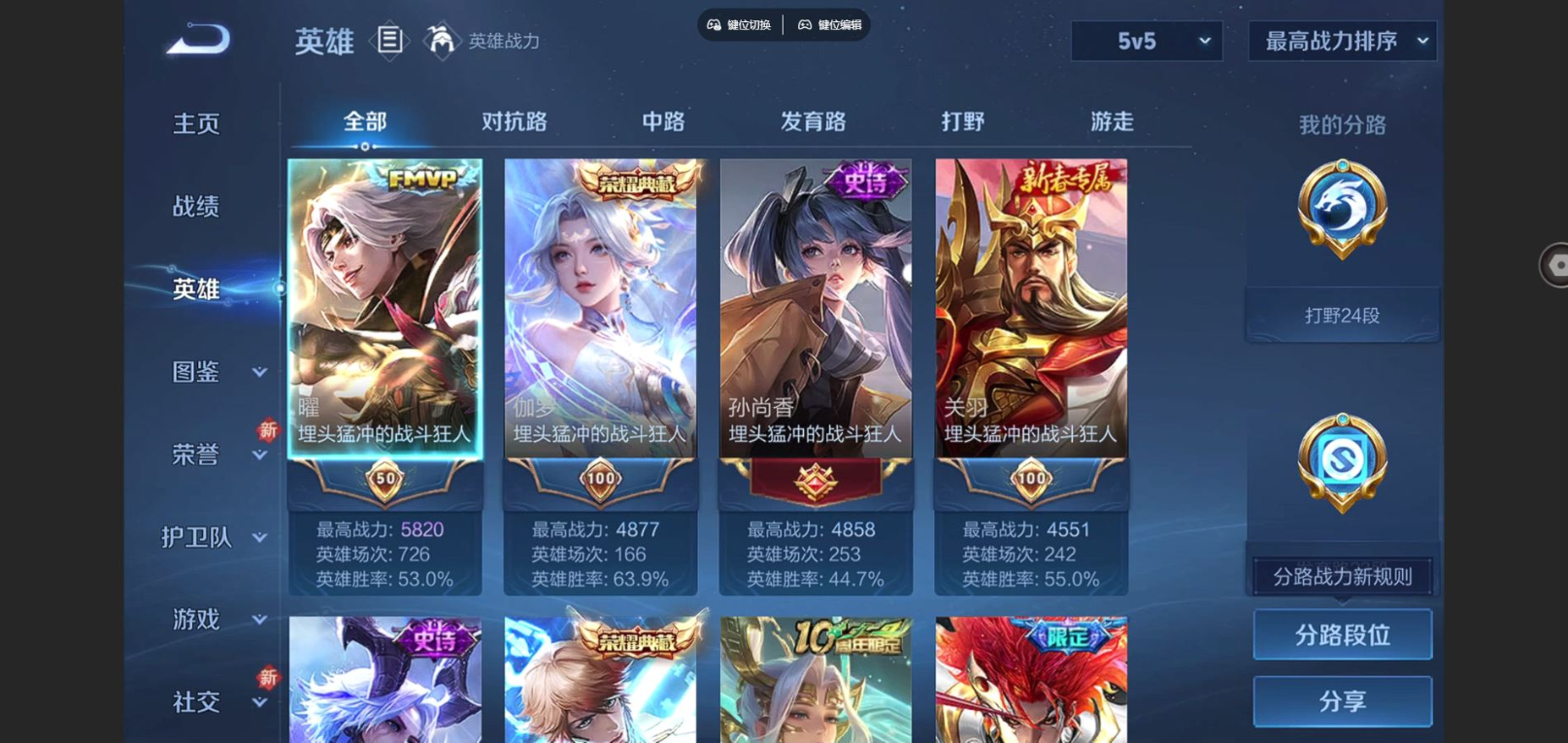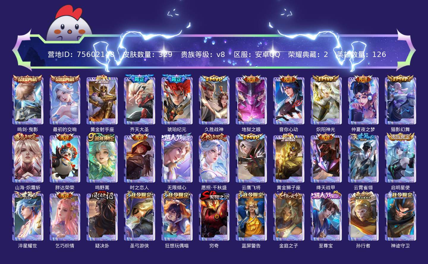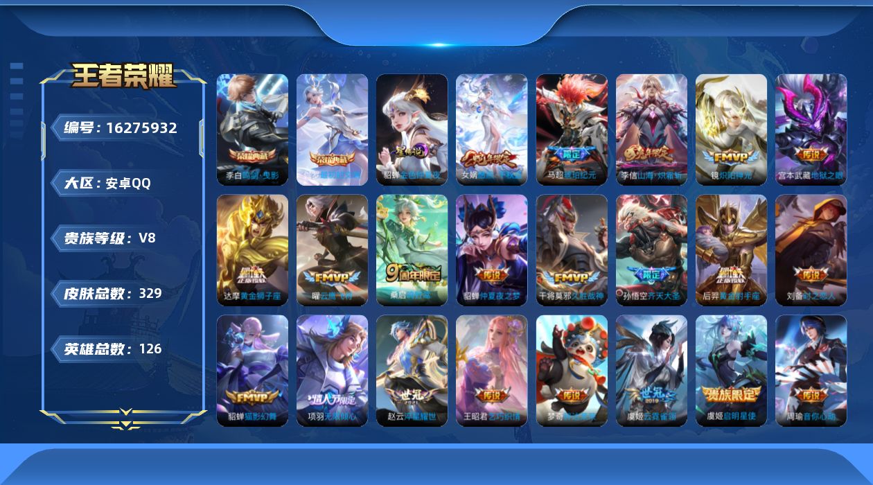 贵族等级:v8皮肤数:329传说品质22 情人节限定2 生肖限定5 荣耀典藏2 英雄数:126