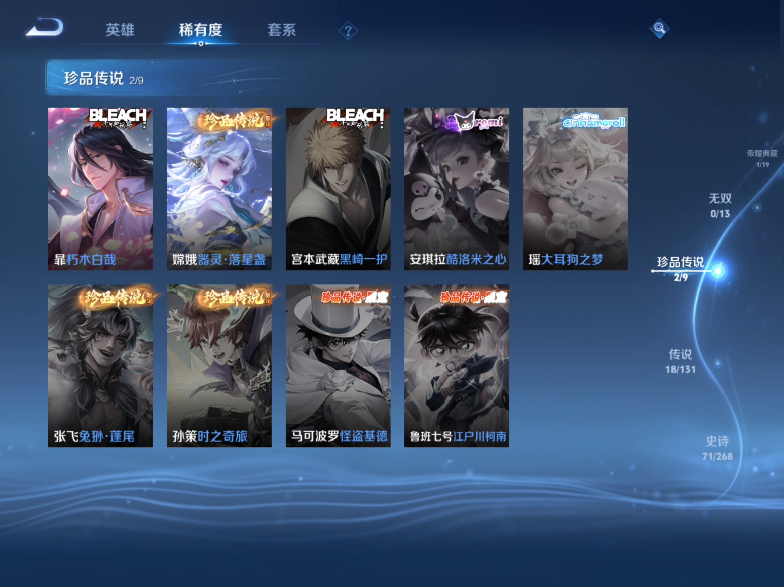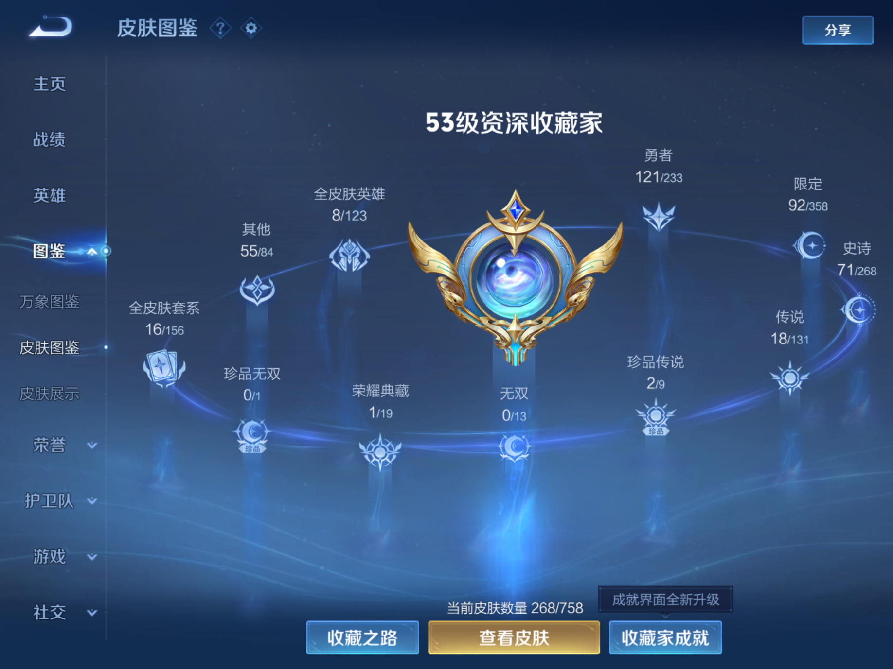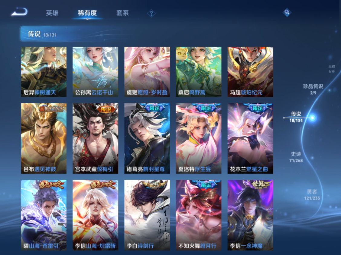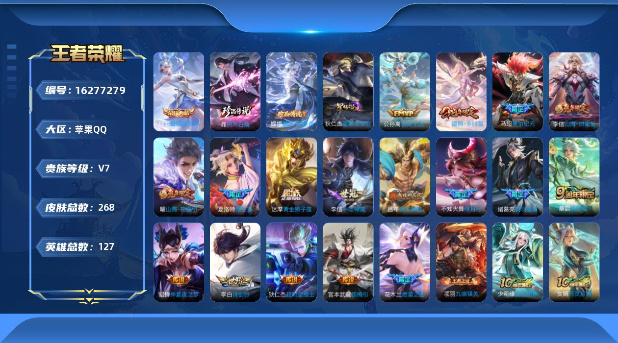 贵族等级:v7皮肤数:268传说品质18 珍品传说2 生肖限定4 荣耀典藏1 英雄数:127