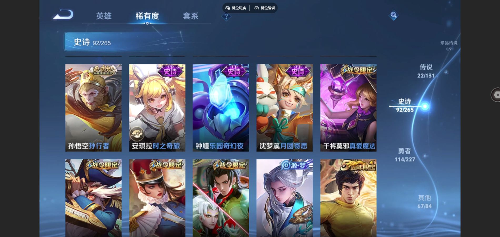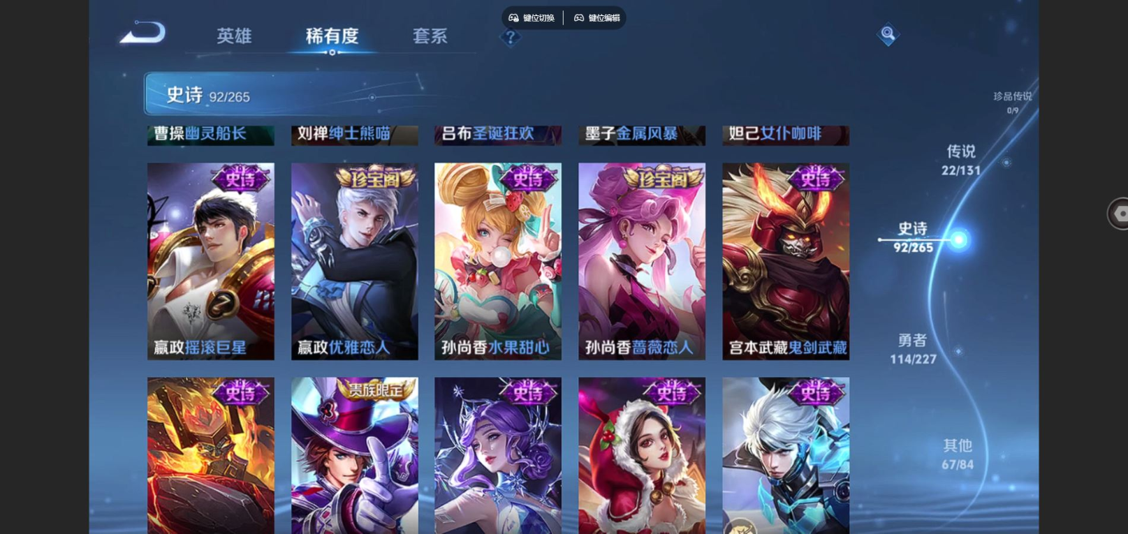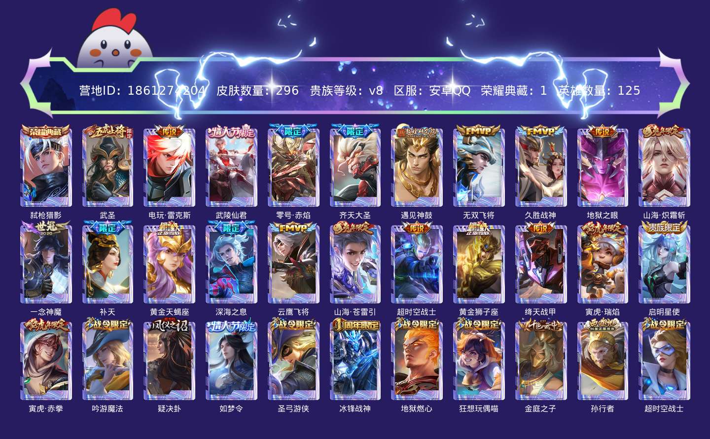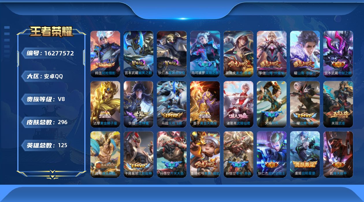 贵族等级:v8皮肤数:296情人节限定3 传说品质22 生肖限定10 荣耀典藏1 英雄数:125