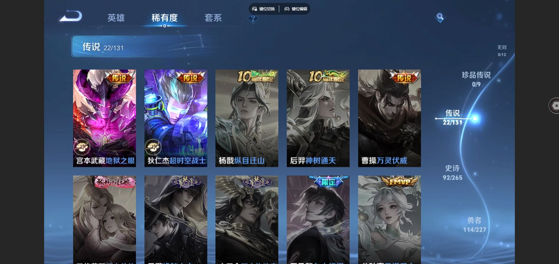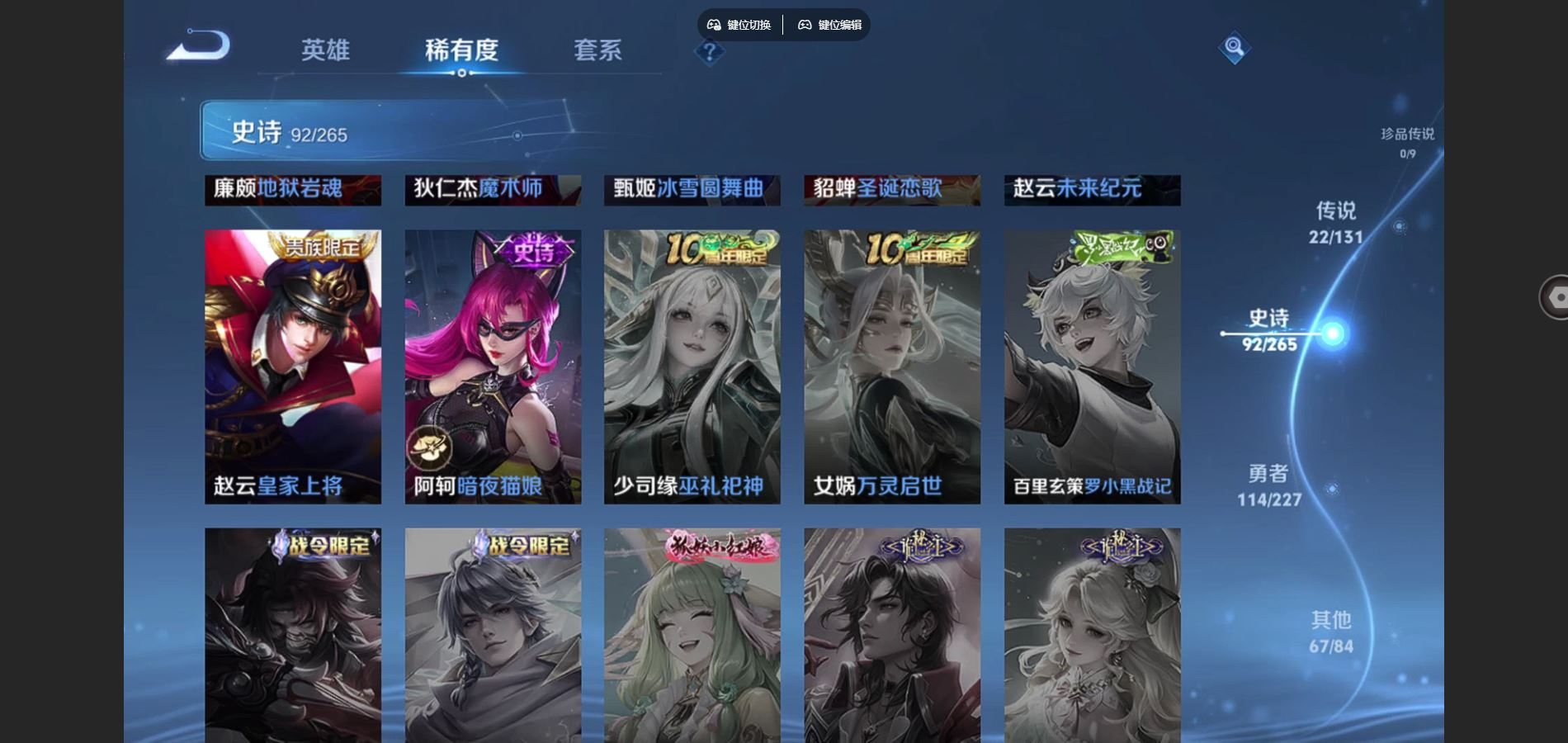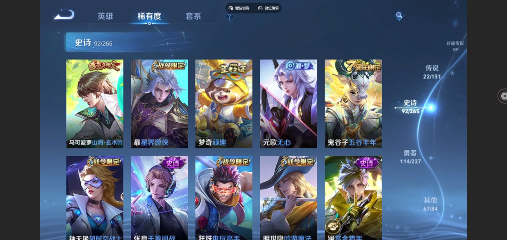 贵族等级:v8皮肤数:296情人节限定3 传说品质22 生肖限定10 荣耀典藏1 英雄数:125