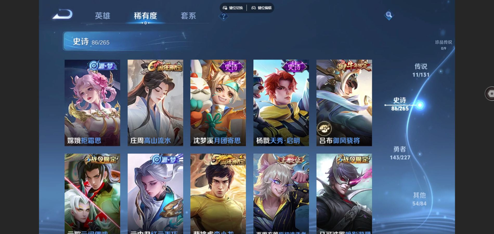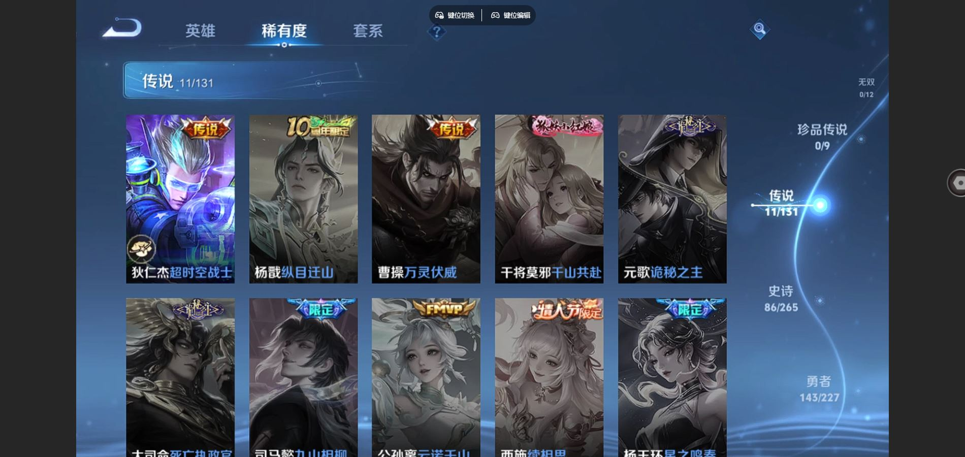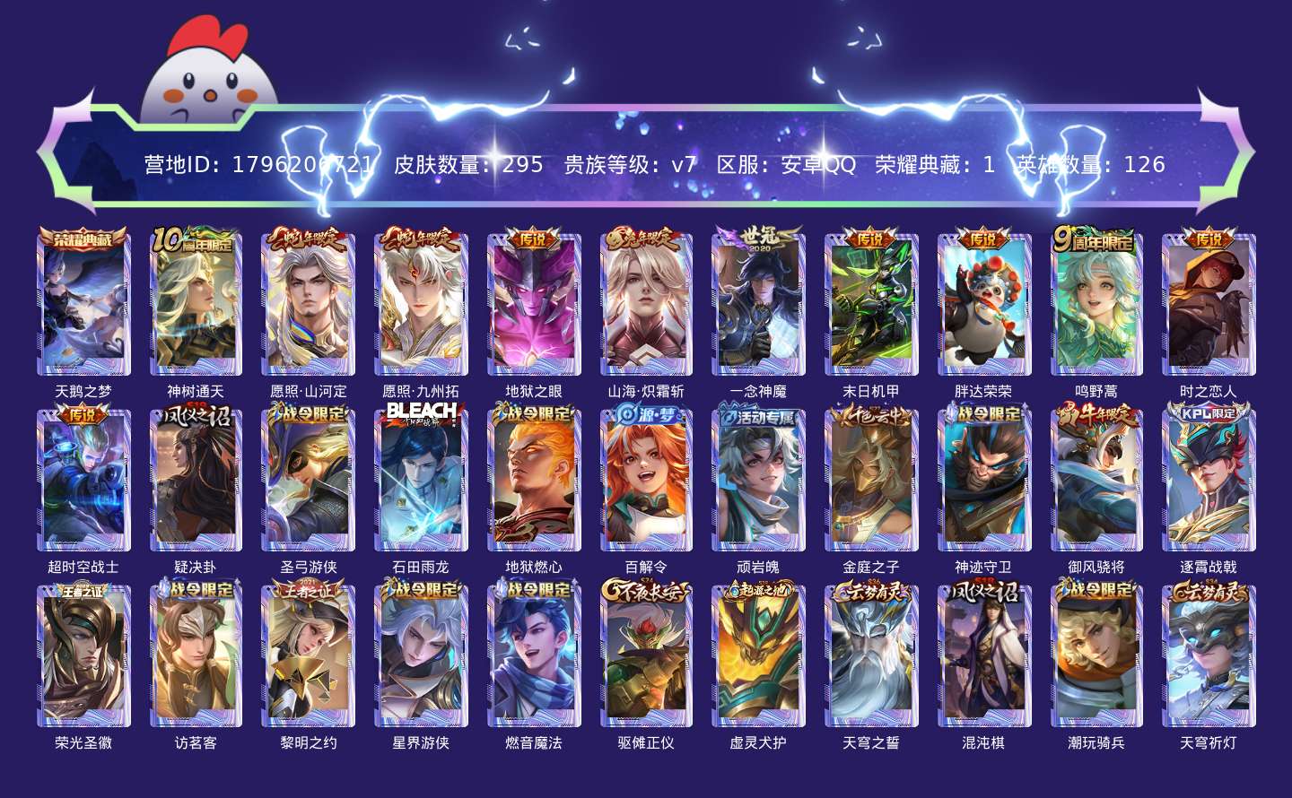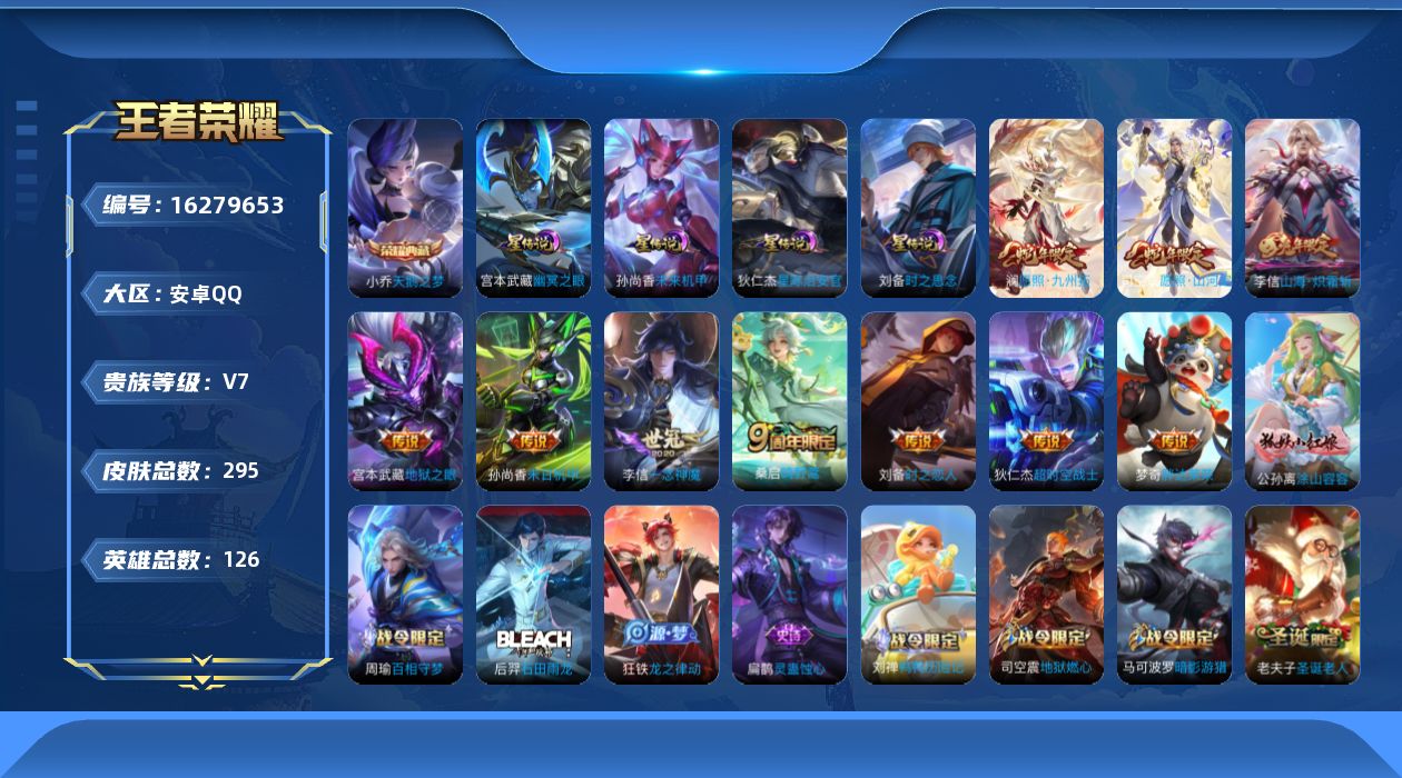 贵族等级:v7皮肤数:295传说品质11 生肖限定5 荣耀典藏1 英雄数:126