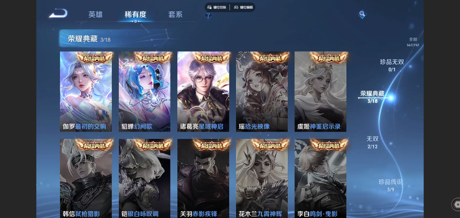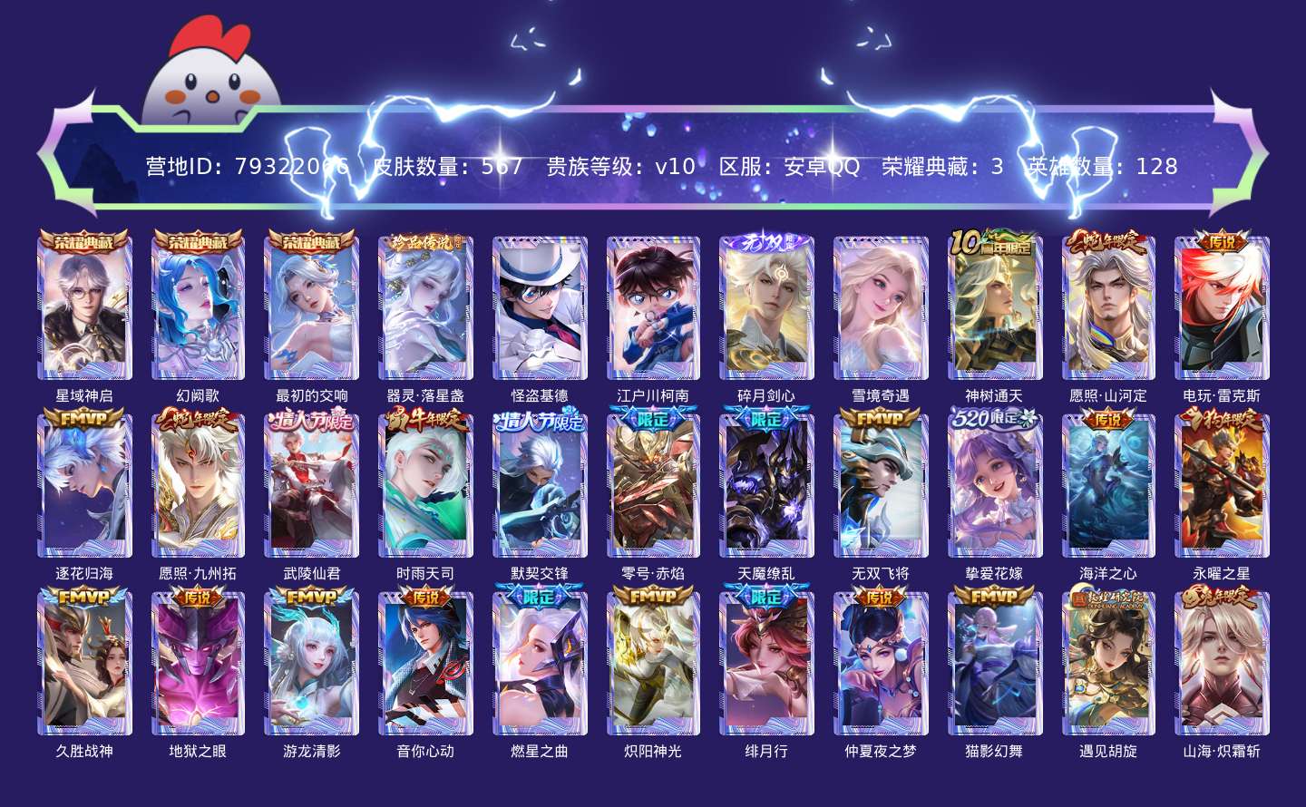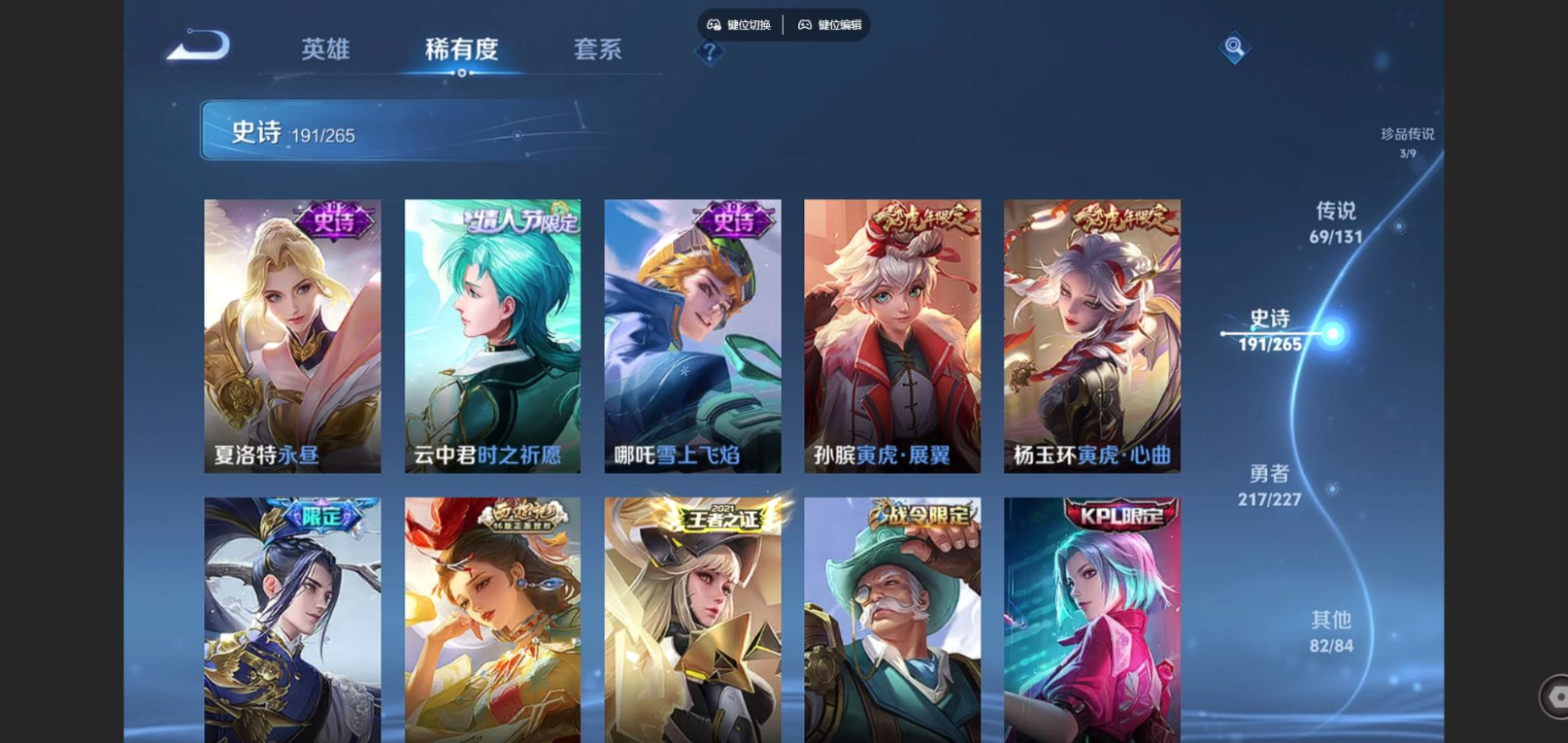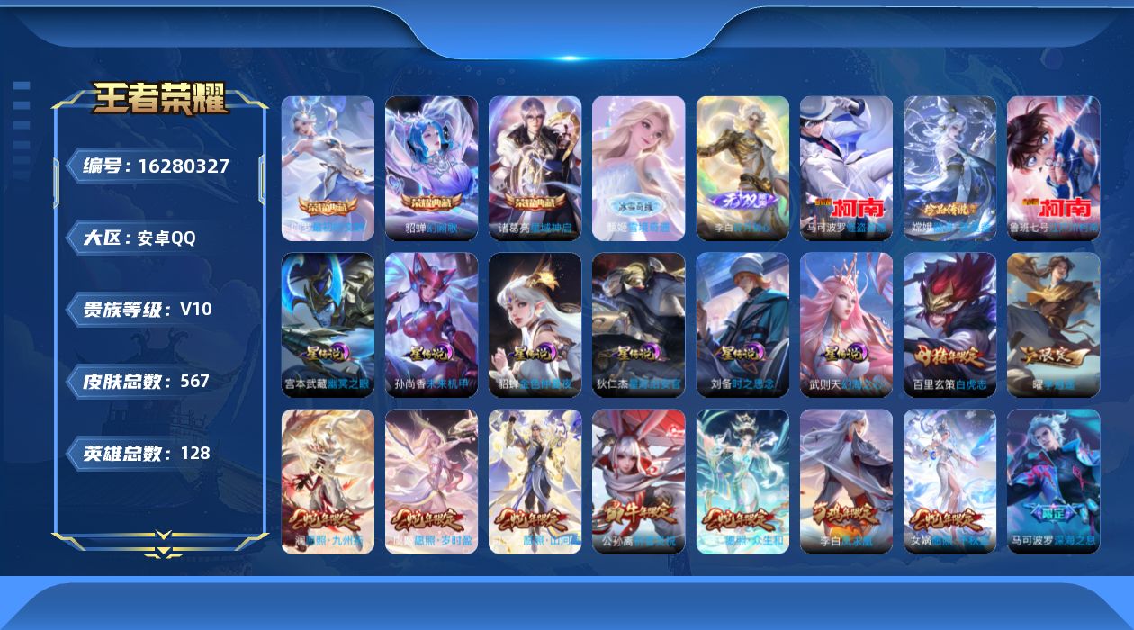 贵族等级:v10皮肤数:567生肖限定30 情人节限定9 传说品质69 荣耀典藏3 珍品传说3 无双2 英雄数:128