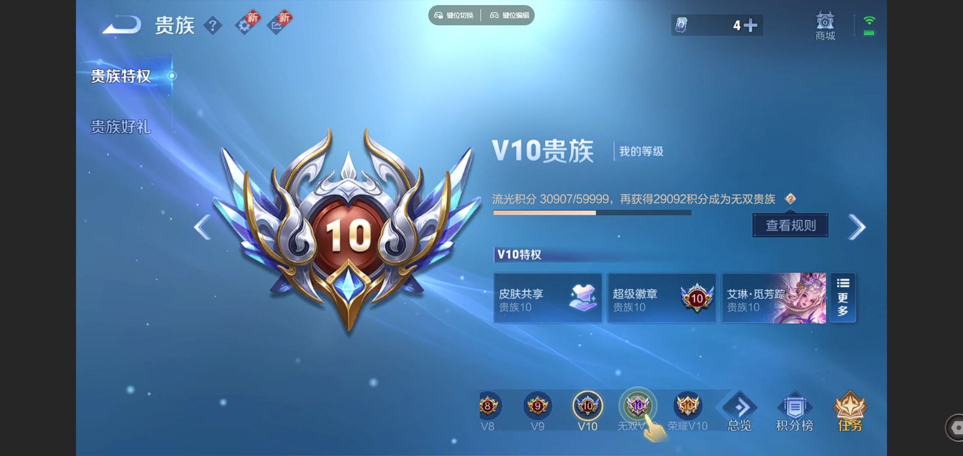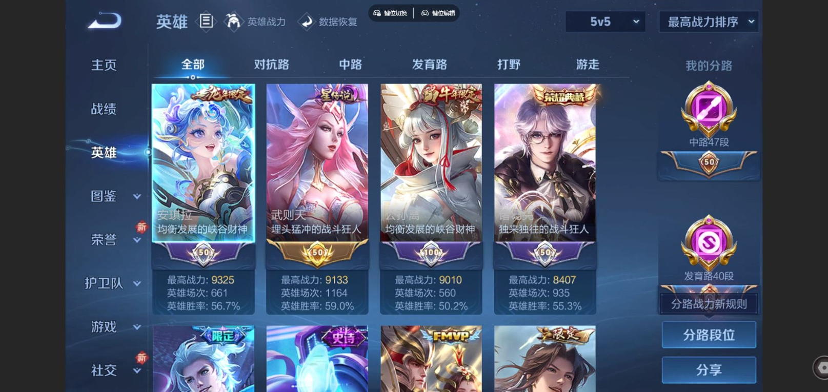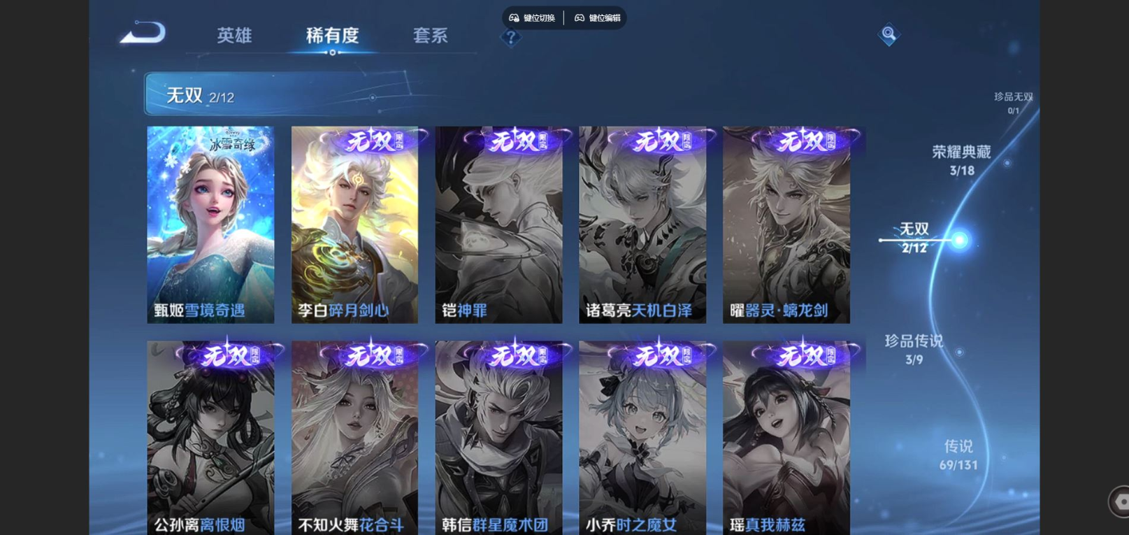 贵族等级:v10皮肤数:567生肖限定30 情人节限定9 传说品质69 荣耀典藏3 珍品传说3 无双2 英雄数:128