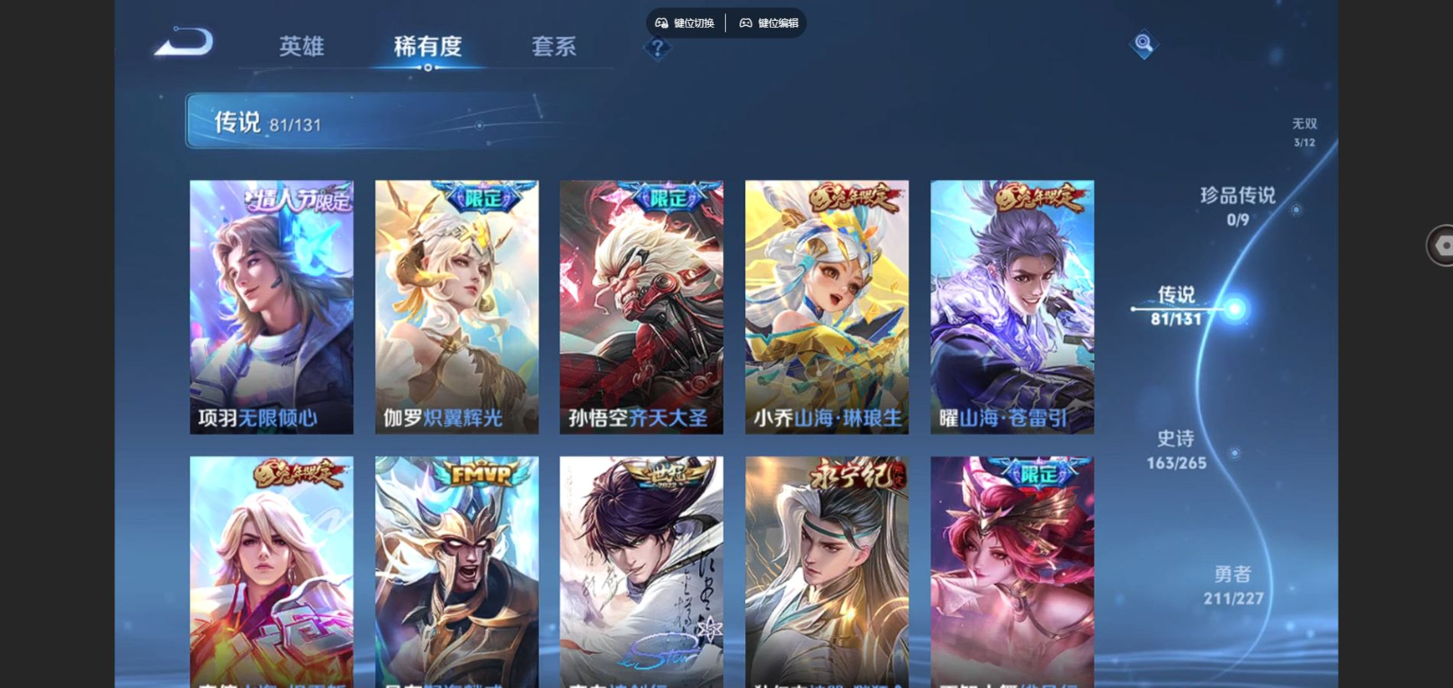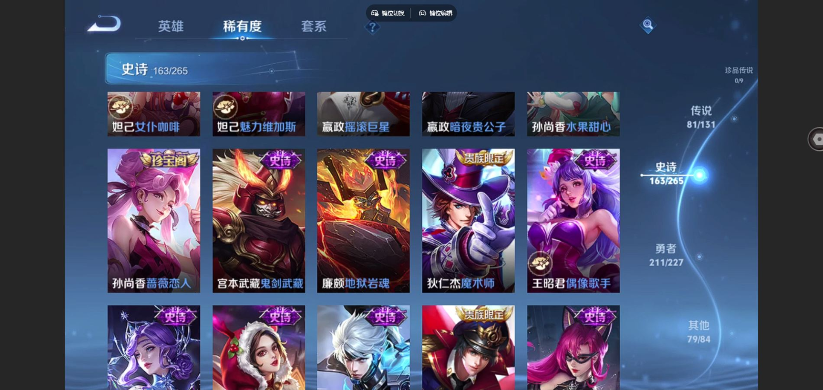 贵族等级:v10皮肤数:540传说品质81 生肖限定15 荣耀典藏3 无双3 情人节限定6 英雄数:127
