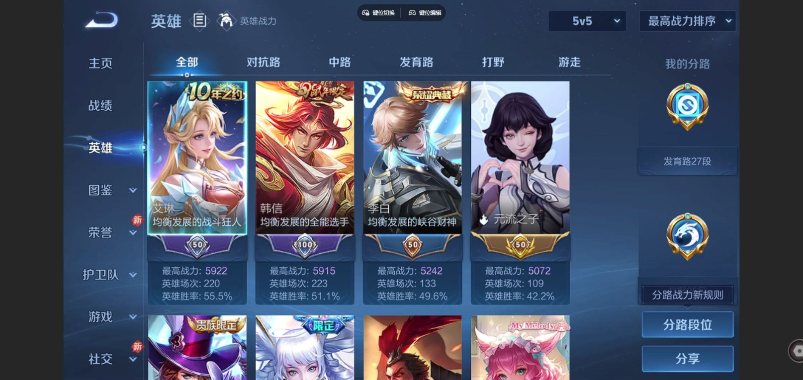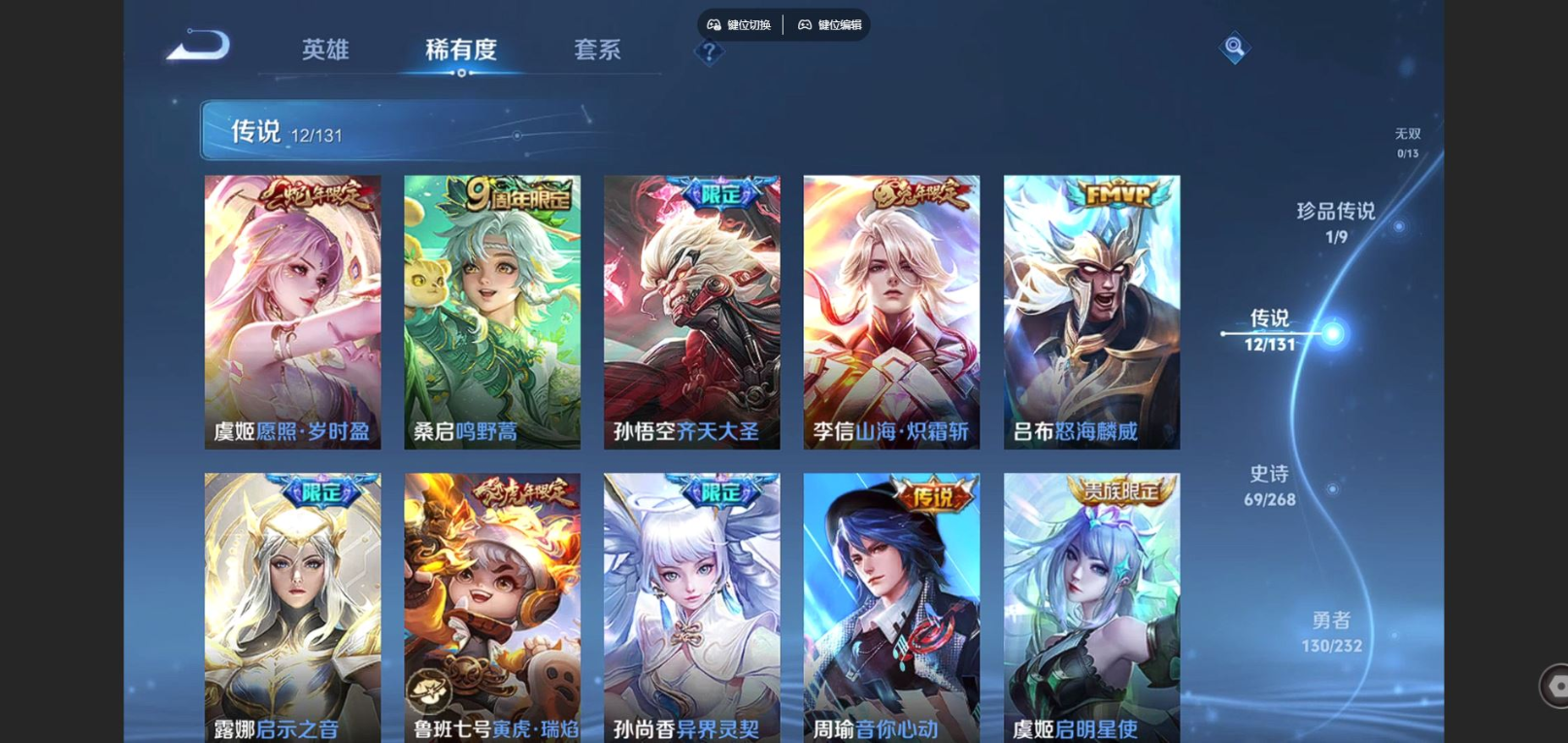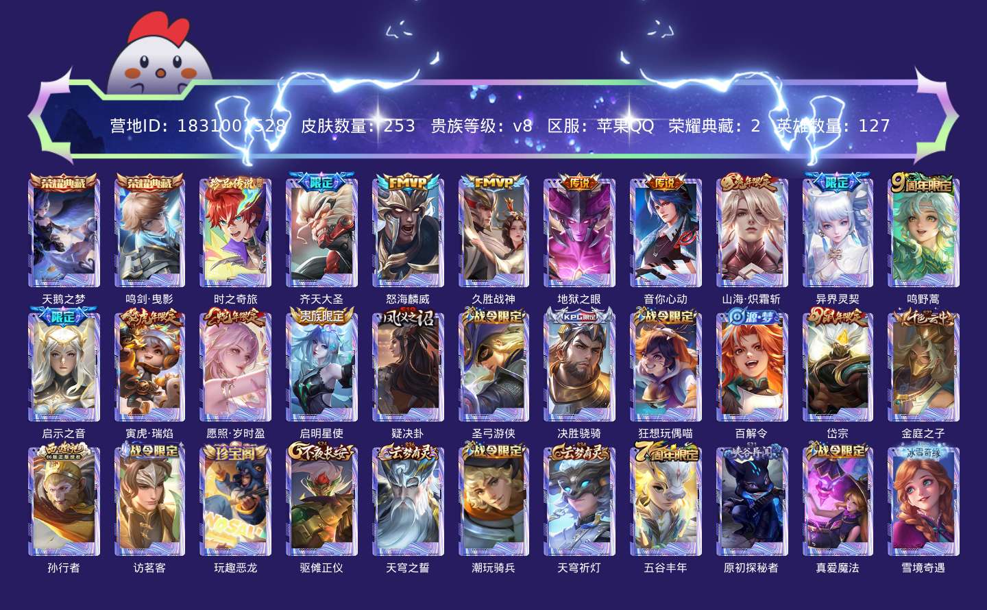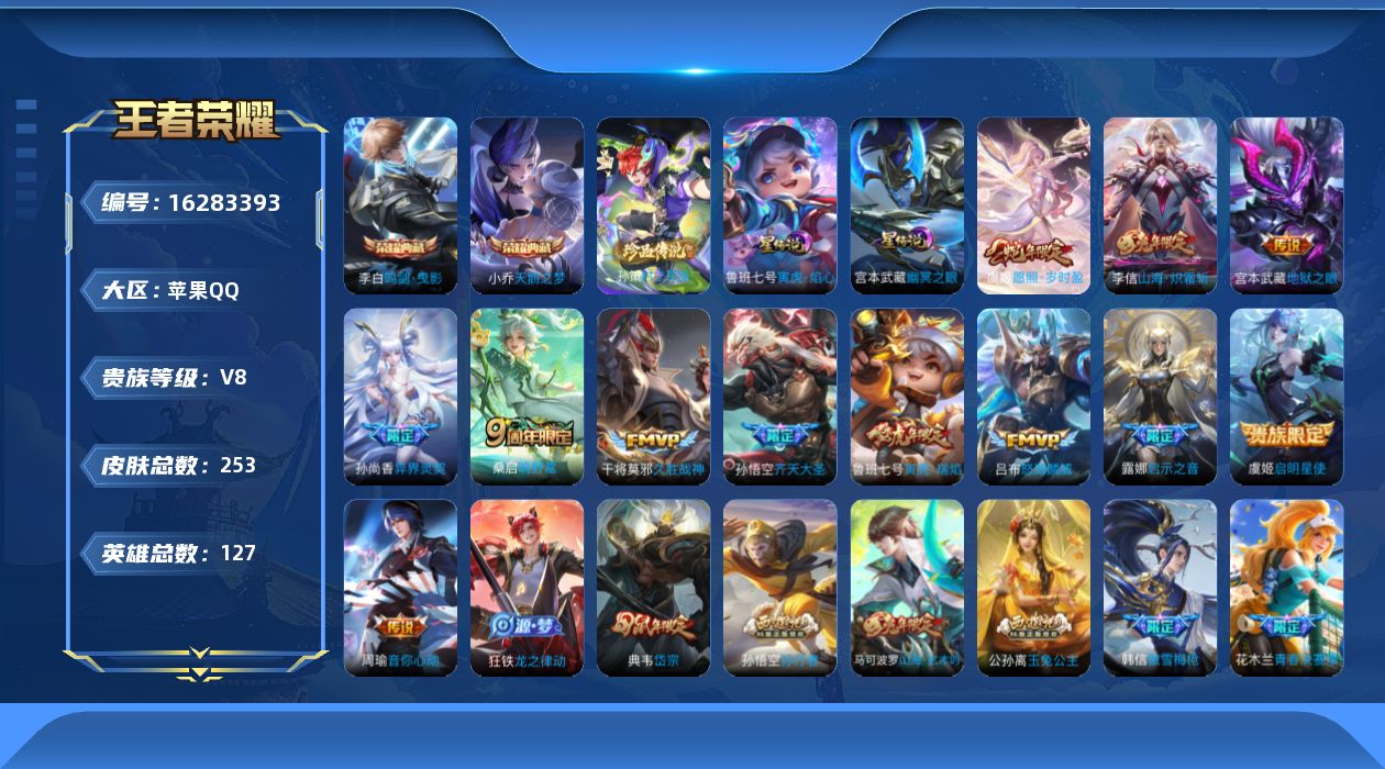 贵族等级:v8皮肤数:253生肖限定7 传说品质12 荣耀典藏2 珍品传说1 英雄数:127