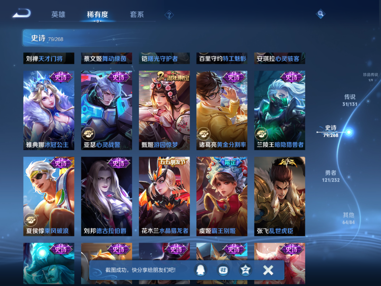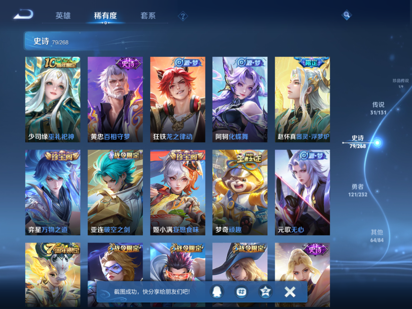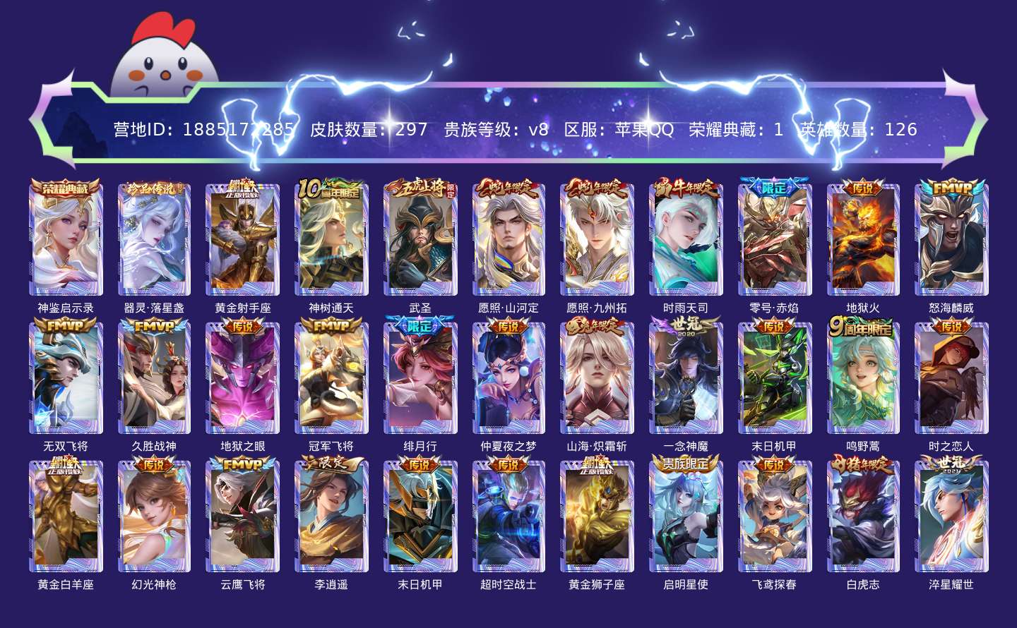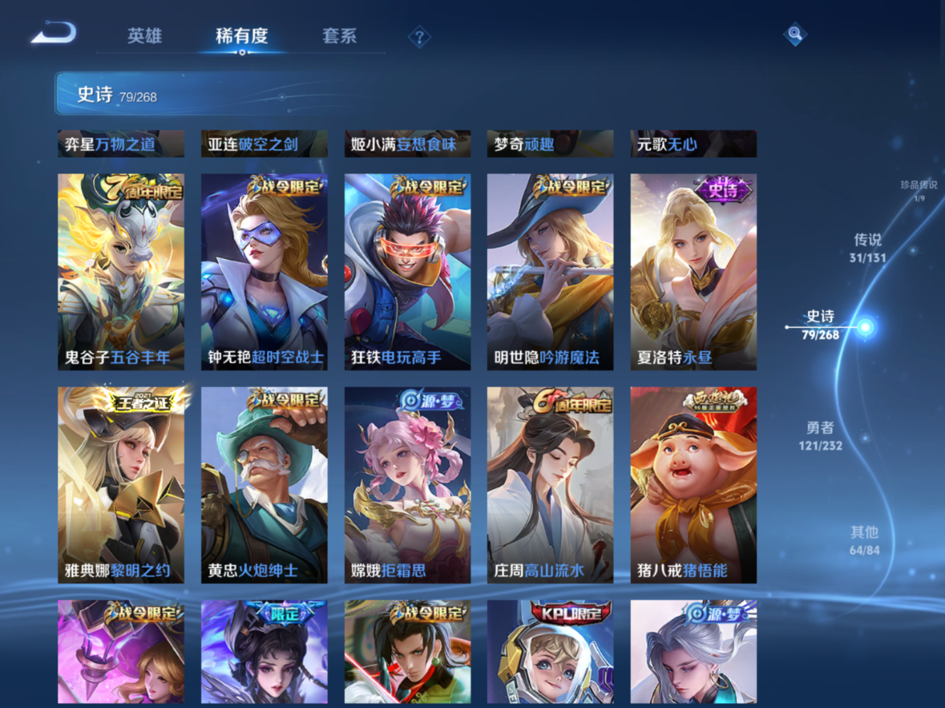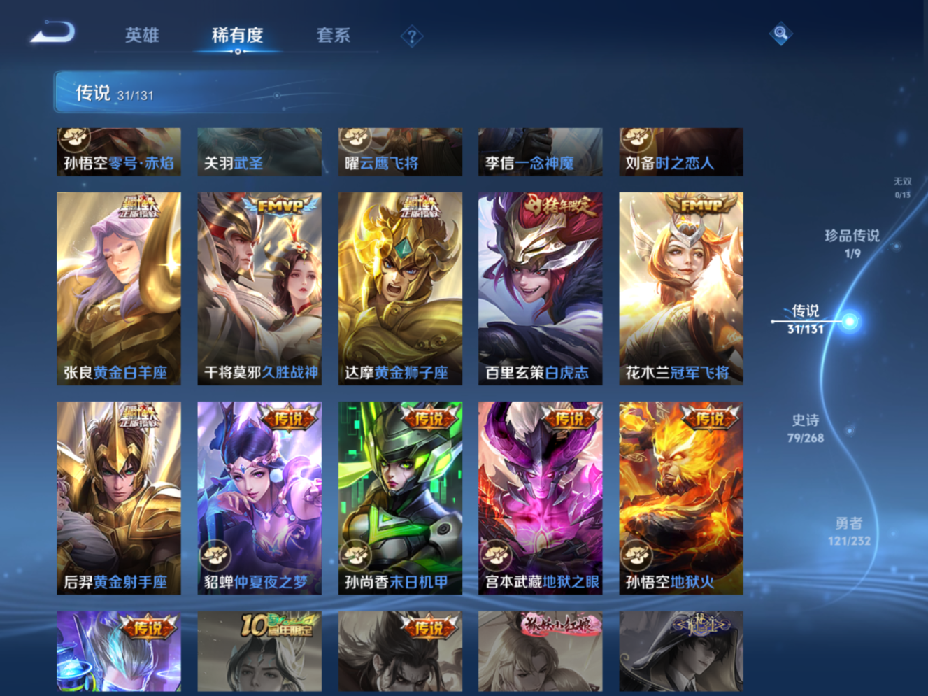 传说品质_后羿_黄金射手座传说品质_后羿_神树通天传说品质_关羽_武圣传说品质_司空震_愿照·山河定传说品质_澜_愿照·九州拓传说品质_诸葛亮_时雨天司传说品质_孙悟空_零号·赤焰传说品质_孙悟空_地狱火传说品质_吕布_怒海麟威传说品质_马超_无双飞将传说品质_干将莫邪_久胜战神传说品质_宫本武藏_地狱之眼传说品质_花木兰_冠军飞将传说品质_不知火舞_绯月行传说品质_貂蝉_仲夏夜之梦传说品质_李信_山海·炽霜斩传说品质_李信_一念神魔传说品质_孙尚香_末日机甲传说品质_桑启_鸣野蒿传说品质_刘备_时之恋人传说品质_张良_黄金白羊座传说品质_云缨_幻光神枪传说品质_曜_云鹰飞将传说品质_曜_李逍遥 传说品质_孙策_末日机甲传说品质_狄仁杰_超时空战士传说品质_达摩_黄金狮子座传说品质_虞姬_启明星使传说品质_李元芳_飞鸢探春传说品质_百里玄策_白虎志传说品质_赵云_淬星耀世
