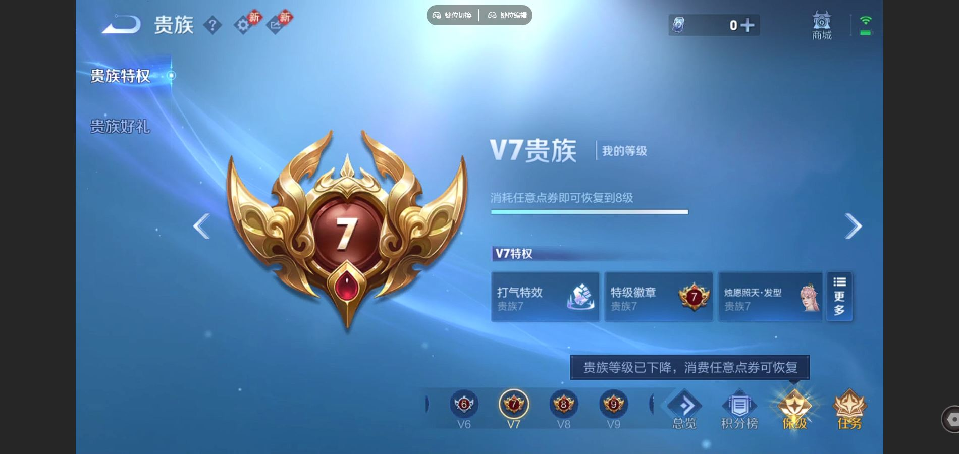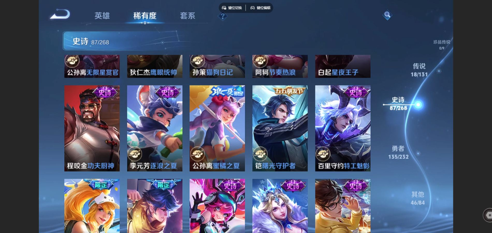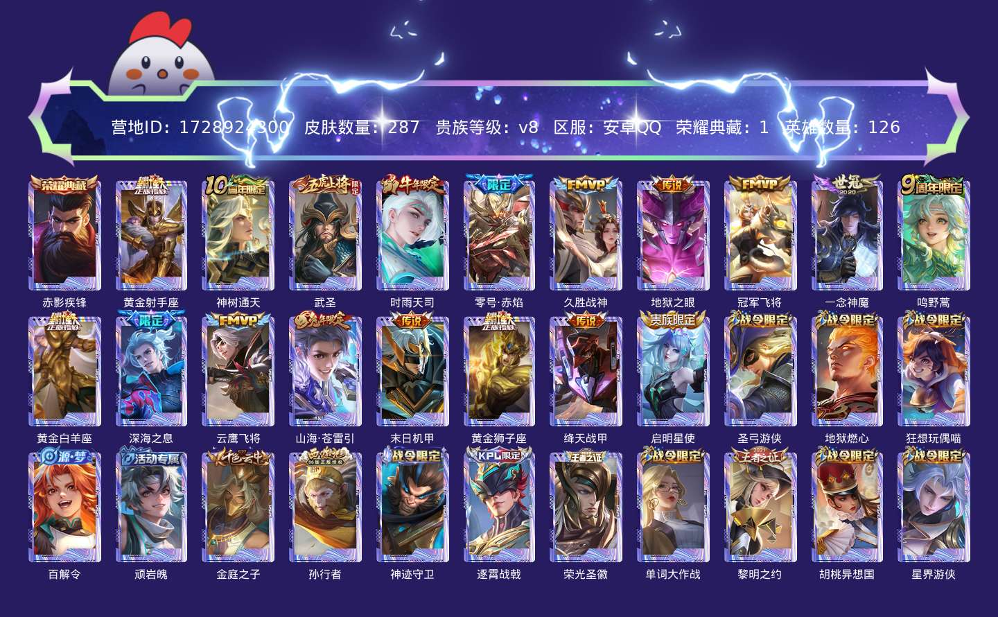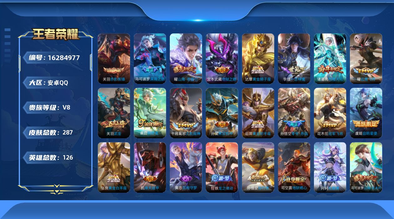 贵族等级:v8皮肤数:287传说品质18 荣耀典藏1 生肖限定4 英雄数:126