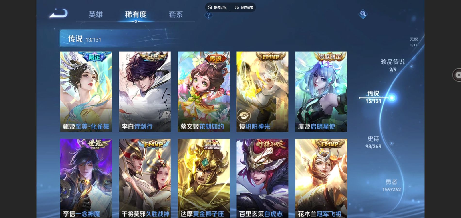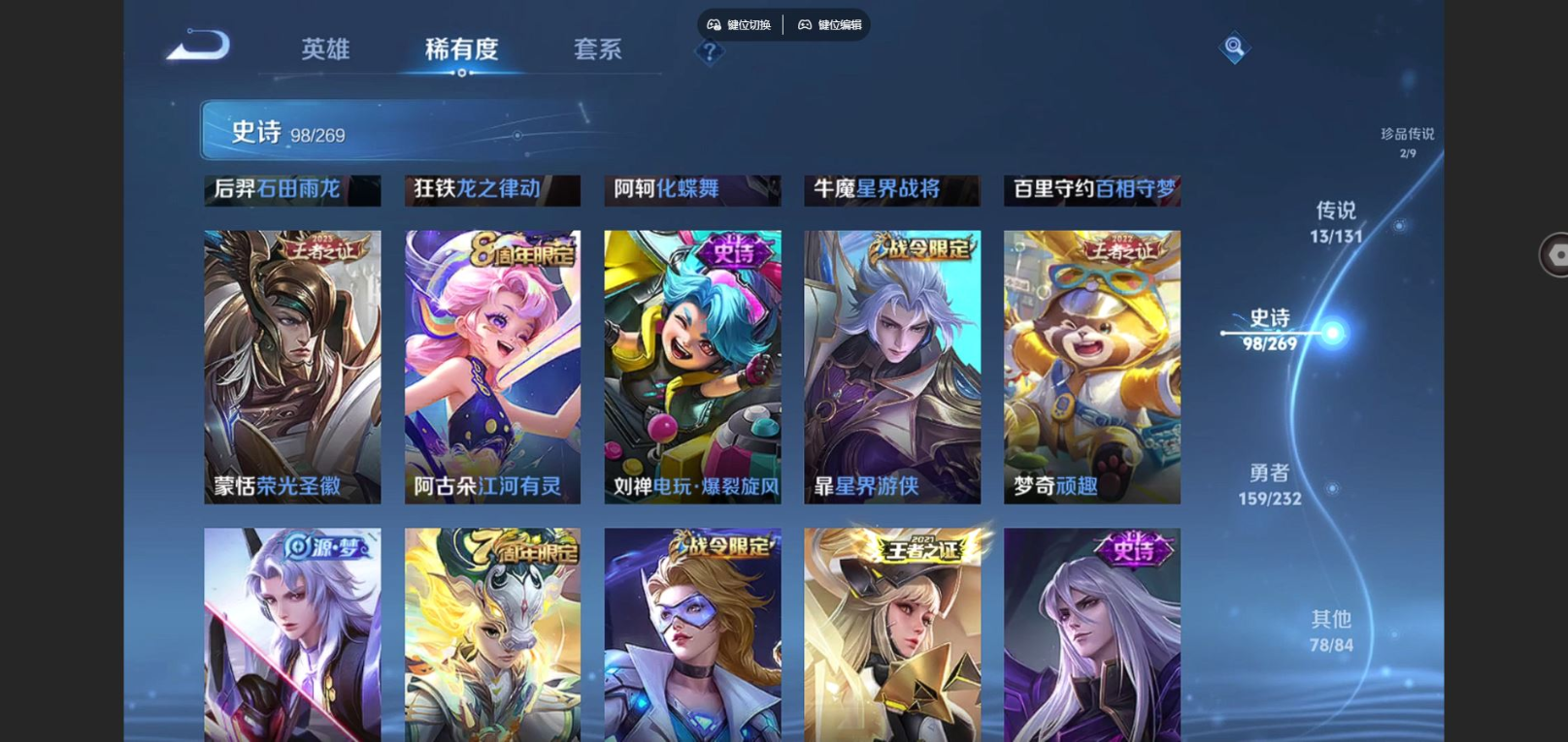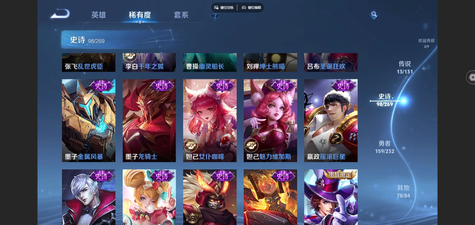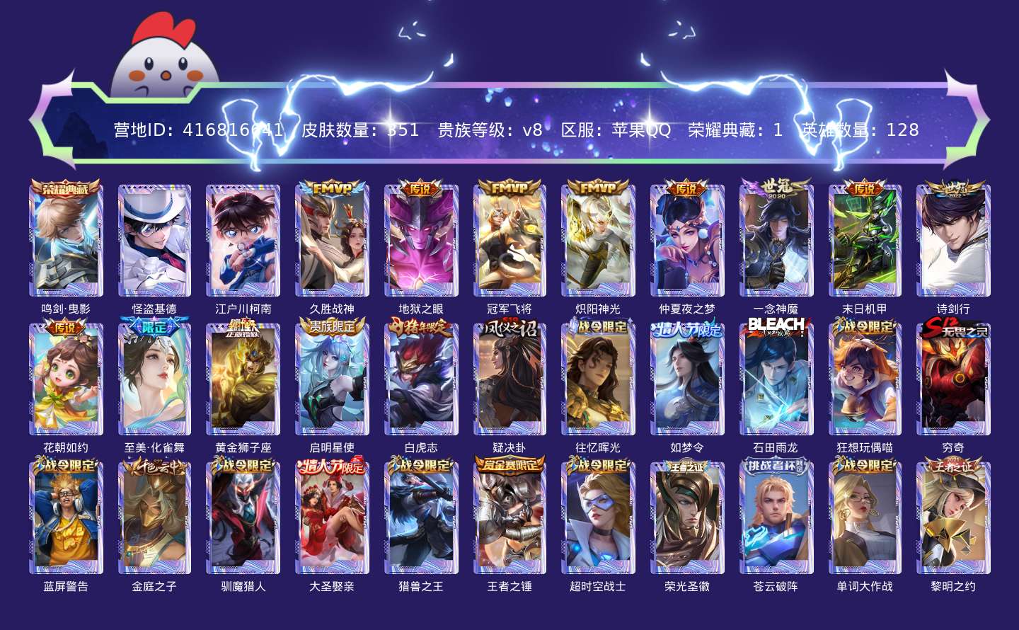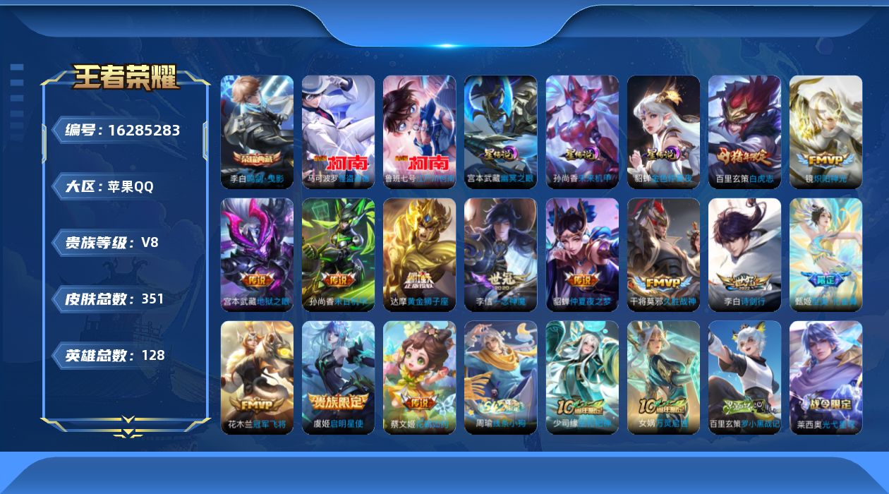贵族等级:v8皮肤数:351情人节限定2 传说品质13 生肖限定3 珍品传说2 荣耀典藏1 英雄数:128